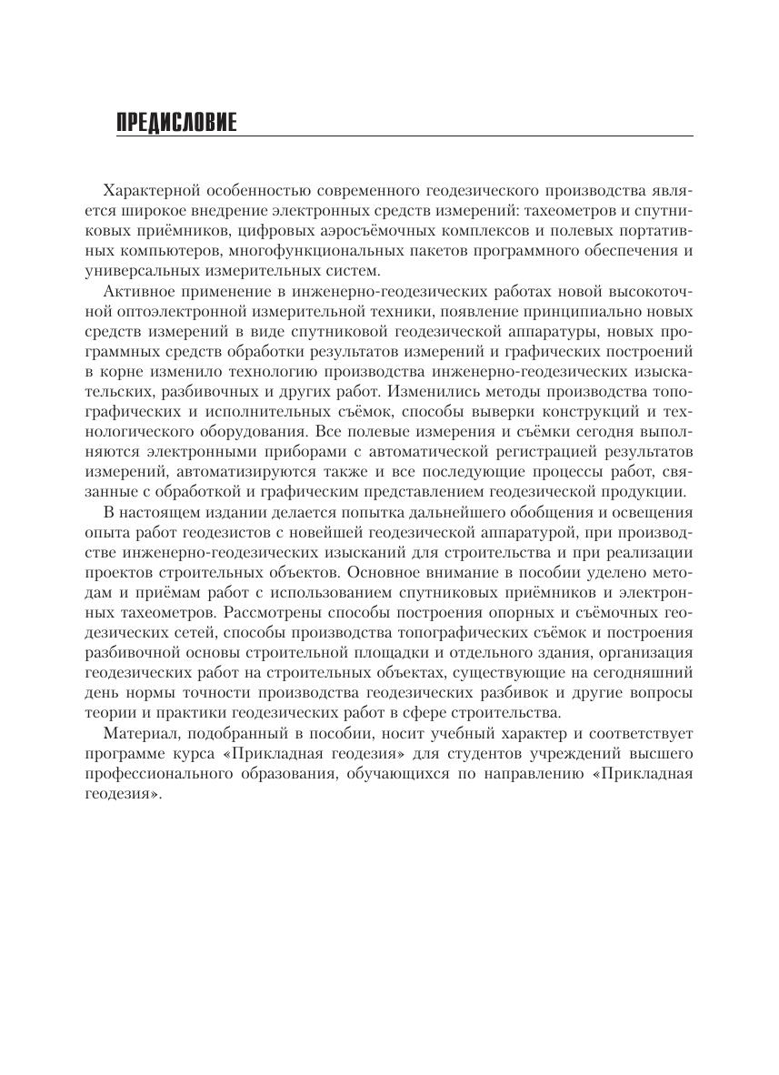 Пособие носит учебный характер и предназначено для студентов учреждений высшего профессионального образования, обучающихся по направлению «Прикладная геодезия», но также может быть полезно для других категорий учащихся и производственников, выполняющих инженерно-геодезические работы.