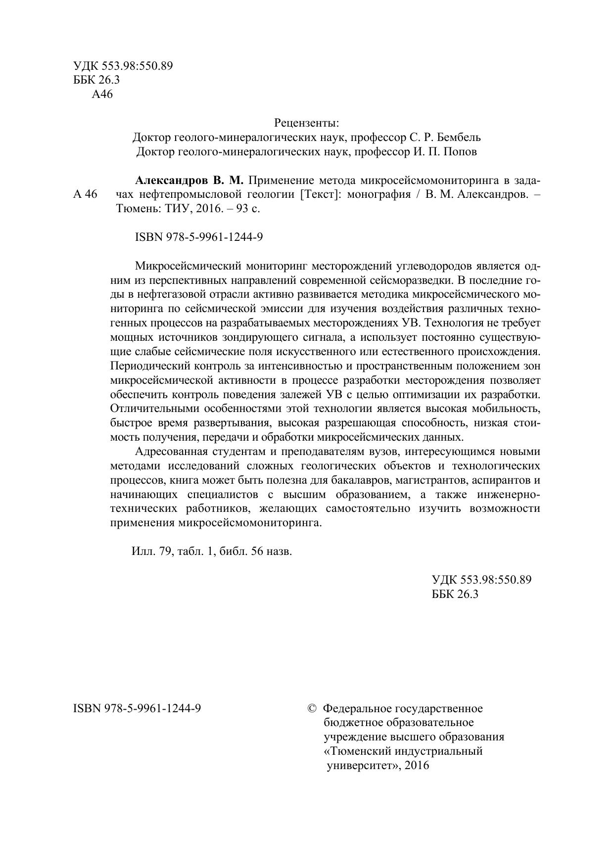 обеспечить контроль поведения залежей УВ с целью оптимизации их разработки. Отличительными особенностями этой технологии является высокая мобильность, быстрое время развертывания, высокая разрешающая способность, низкая стоимость получения, передачи и обработки микросейсмических данных. Адресованная студентам и преподавателям вузов, интересующимся новыми методами исследований сложных геологических объектов и технологических процессов, книга может быть полезна для бакалавров, магистрантов, аспирантов и начинающих специалистов с высшим образованием, а также инженерно-технических работников, желающих самостоятельно изучить возможности применения микросейсмомониторинга.