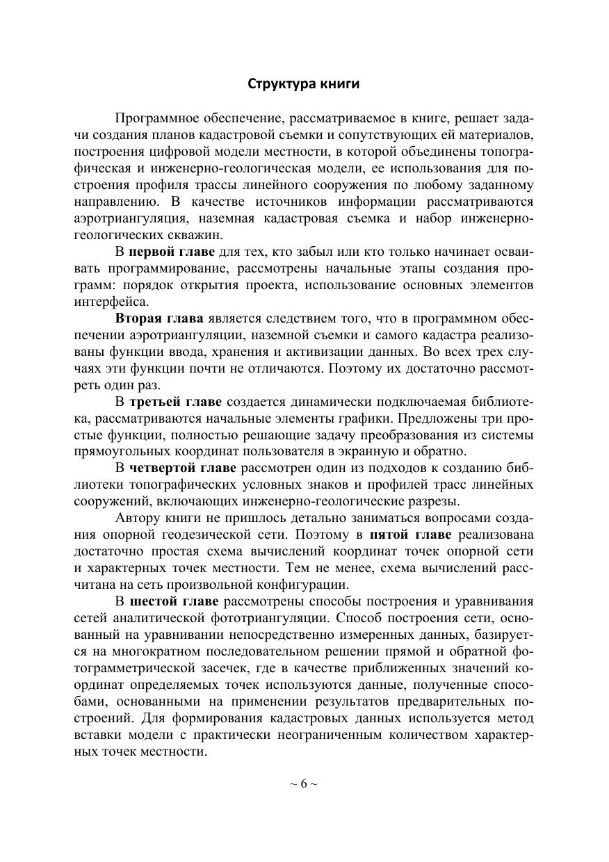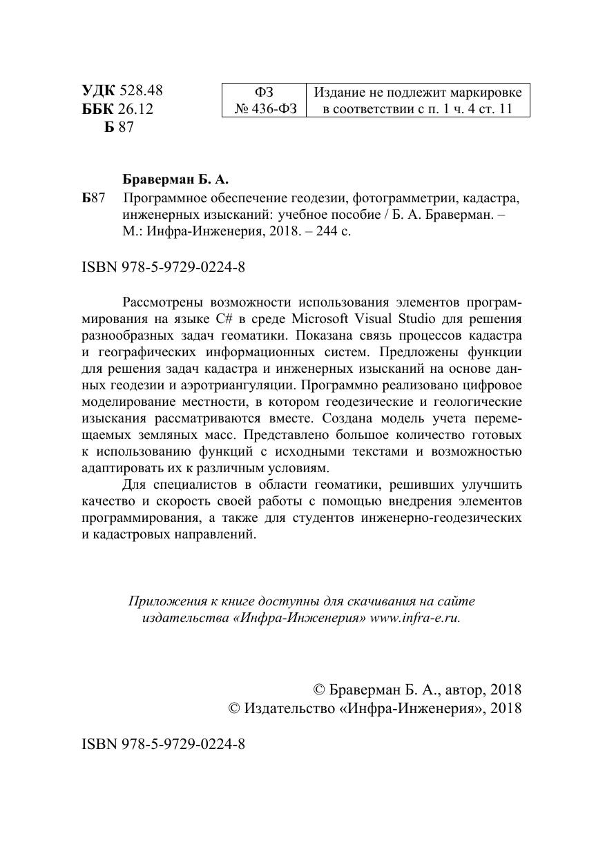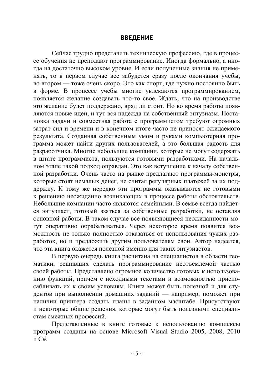 Рассмотрены возможности использования элементов программирования на языке С# в среде Microsoft Visual Studio для решения разнообразных задач геоматики. Показана связь процессов кадастра и географических информационных систем. Предложены функции для решения задач кадастра и инженерных изысканий на основе данных геодезии и аэротриангуляции. Программно реализовано цифровое моделирование местности, в котором геодезические и геологические изыскания рассматриваются вместе. Создана модель учета перемещаемых земляных масс. Представлено большое количество готовых к использованию функций с исходными текстами и возможностью адаптировать их к различным условиям.