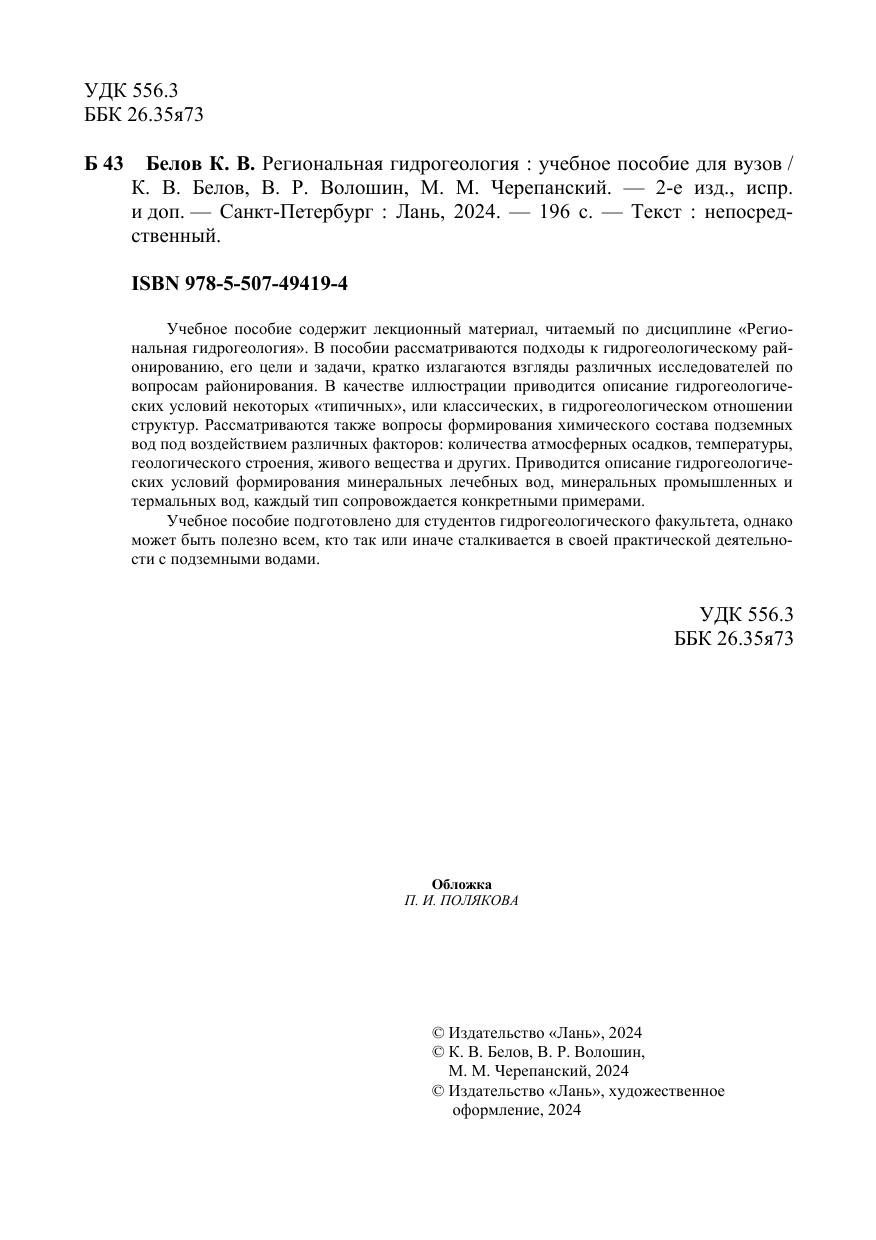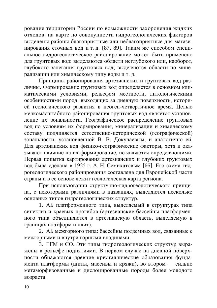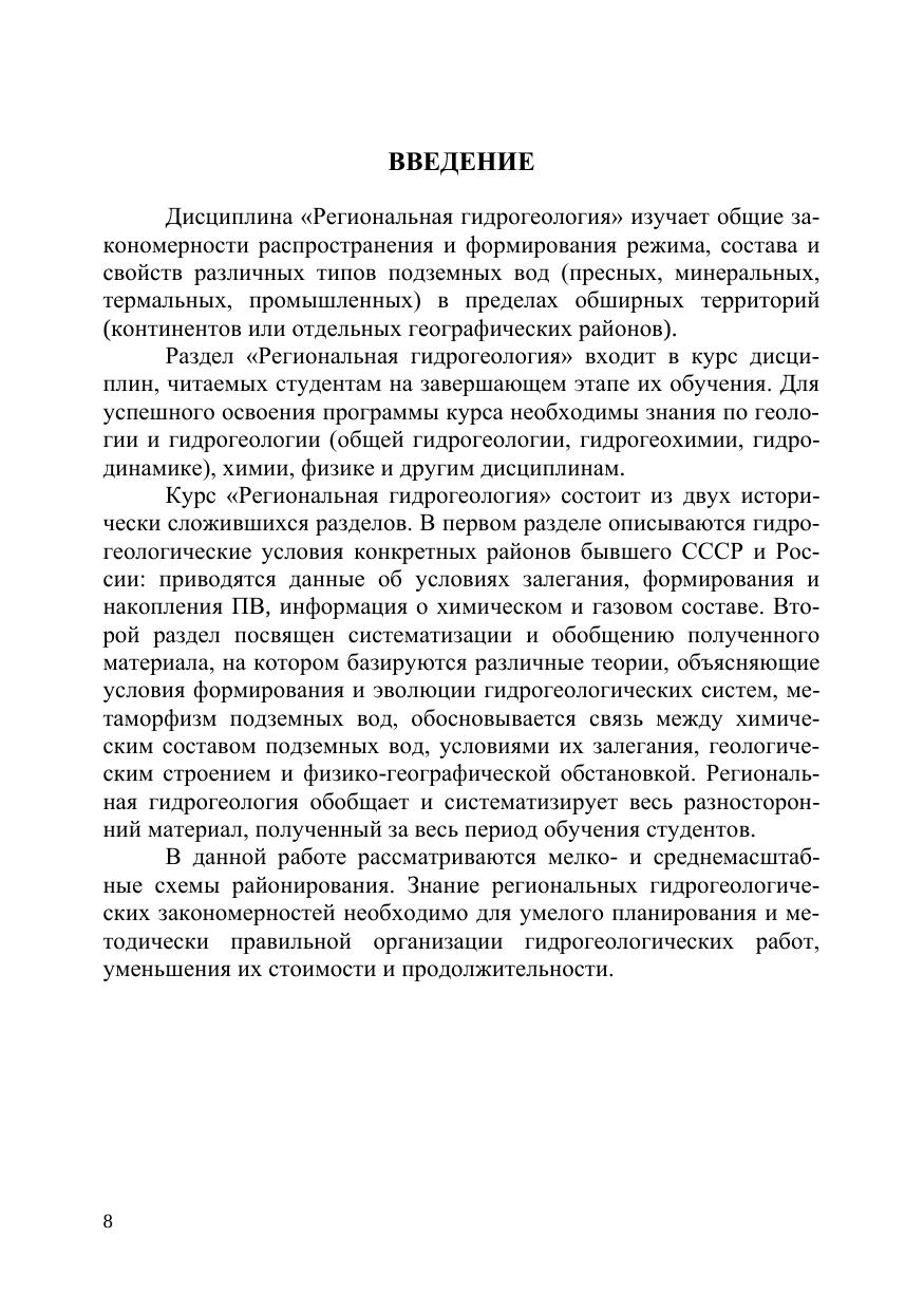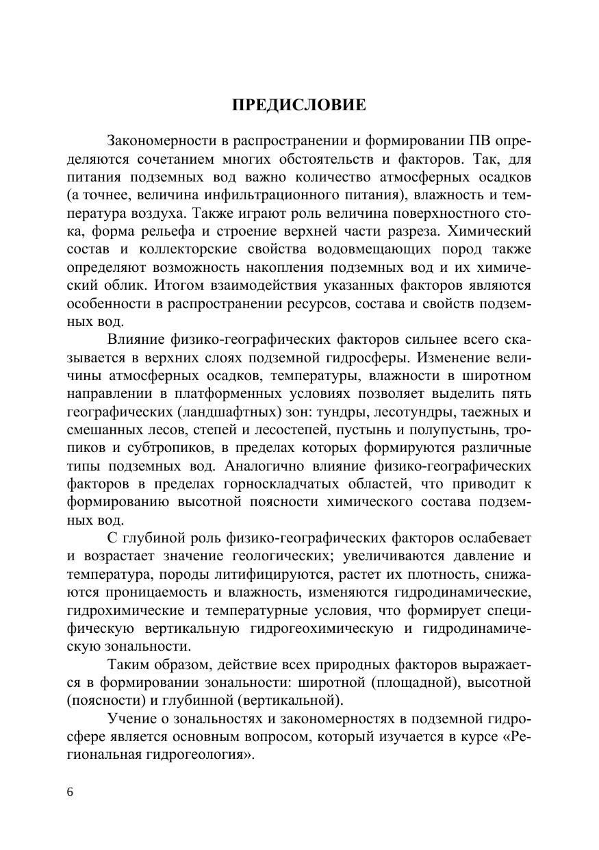 Учебное пособие содержит лекционный материал, читаемый по дисциплине «Ре-гиональная гидрогеология». В пособии рассматриваются подходы к гидрогеологиче-скому районированию, его цели и задачи, кратко излагаются взгляды различных ис-следователей по вопросам районирования. В качестве иллюстрации приводится опи-сание гидрогеологических условий некоторых «типичных», или классических, в гид-рогеологическом отношении структур. Рассматриваются также вопросы формирова-ния химического состава подземных вод под воздействием различных факторов: ко-личества атмосферных осадков, температуры, геологического строения, живого ве-щества и других. Приводится описание гидрогеологических условий формирования минеральных лечебных вод, минеральных промышленных и термальных вод, каждый тип сопровождается конкретными примерами. Учебное пособие подготовлено для студентов гидрогеологического факультета, однако может быть полезно всем, кто так или иначе сталкивается в своей практиче-ской деятельности с подземными водами..