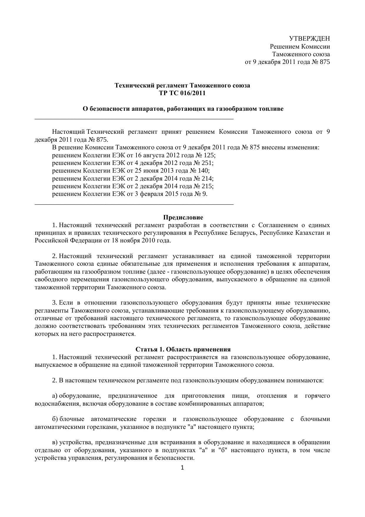 Технический регламент Таможенного союза. ТР ТС 016/2011. О безопасности аппаратов, работающих на газообразном топливе (с изменениями на 3 февраля 2015 года)