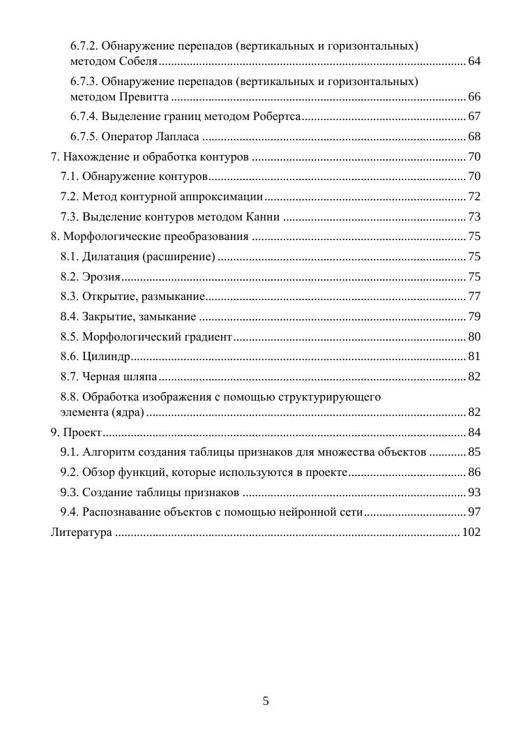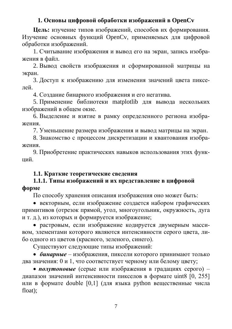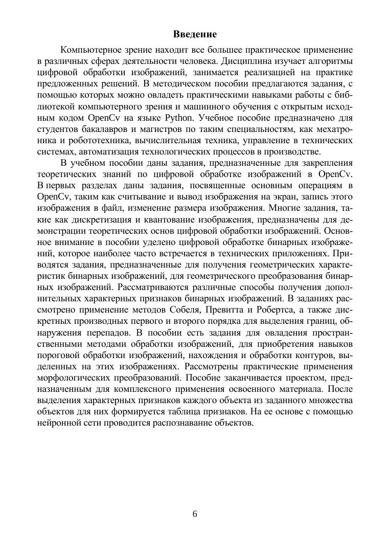 В учебном пособии даны задания, предназначенные для закрепления теоретических знаний по цифровой обработке изображений в OpenCv. В первых разделах даны задания, посвященные основным операциям в OpenCv, таким как считывание и вывод изображения на экран, запись этого изображения в файл, изменение размера изображения. Многие задания, такие как дискретизация и квантование изображения, предназначены для демонстрации теоретических основ цифровой обработки изображений. Основное внимание в пособии уделено цифровой обработке бинарных изображений, которые наиболее часто встречаются в технических приложениях. Приводятся задания, предназначенные для получения геометрических характеристик бинарных изображений, для геометрического преобразования бинарных изображений. Рассматриваются различные способы получения дополнительных характерных признаков бинарных изображений. В заданиях рассмотрено применение методов Собеля, Превитта и Робертса, а также дискретных производных первого и второго порядка для выделения границ, обнаружение перепадов. В пособии есть задания для овладения пространственными методами обработки изображений, для приобретения навыков пороговой обработки изображений, нахождения и обработки контуров, выделенных на этих изображениях. Рассмотрены практические применения морфологических преобразований.