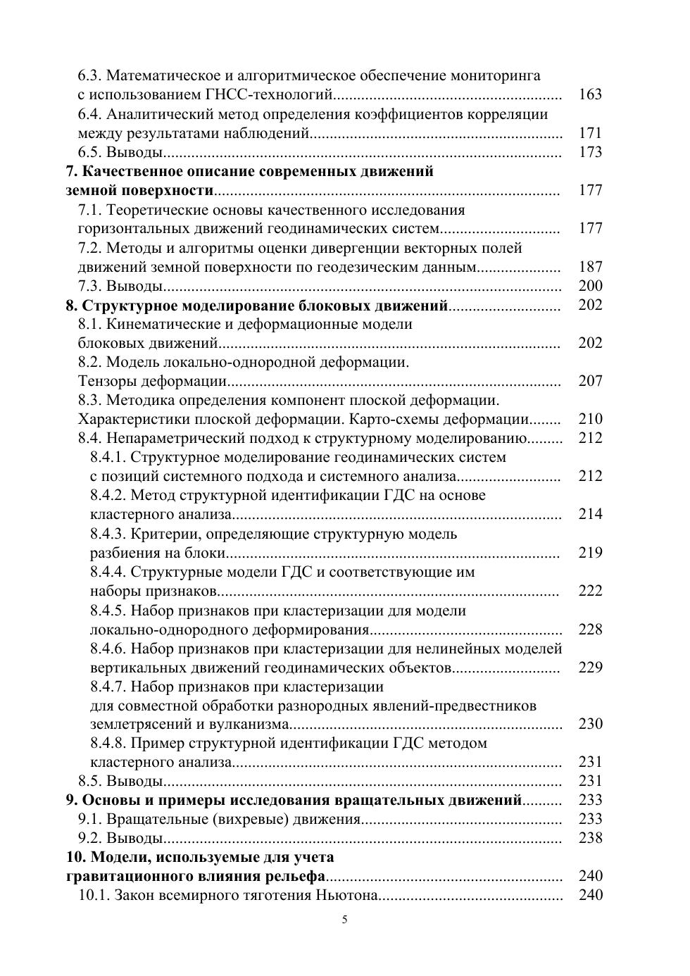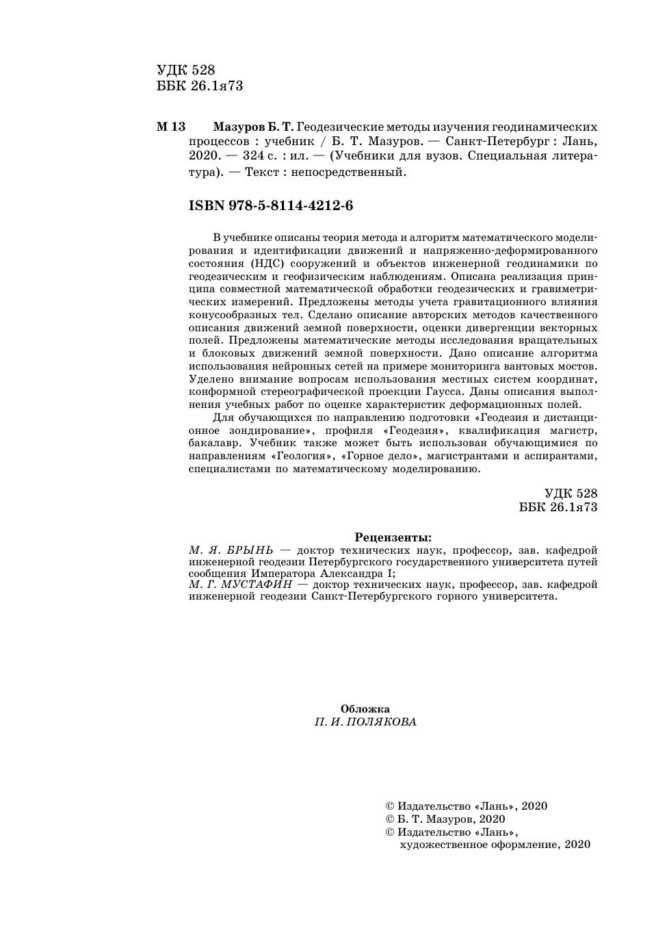 В учебнике описаны теория метода и алгоритм математического моделирования и идентификации движений и напряженно-деформированного состояния (НДС) сооружений и объектов инженерной геодинамики по геодезическим и геофизическим наблюдениям. Описана реализация принципа совместной математической обработки геодезических и гравиметрических измерений. Предложены методы учета гравитационного влияния конусообразных тел. Сделано описание авторских методов качественного описания движений земной поверхности, оценки дивергенции векторных полей. Предложены математические методы исследования вращательных и блоковых движений земной поверхности. Дано описание алгоритма использования нейронных сетей на примере мониторинга вантовых мостов. Уделено внимание вопросам использования местных систем координат, конформной стереографической проекции Гаусса. Даны описания выполнения учебных работ по оценке характеристик деформационных полей.