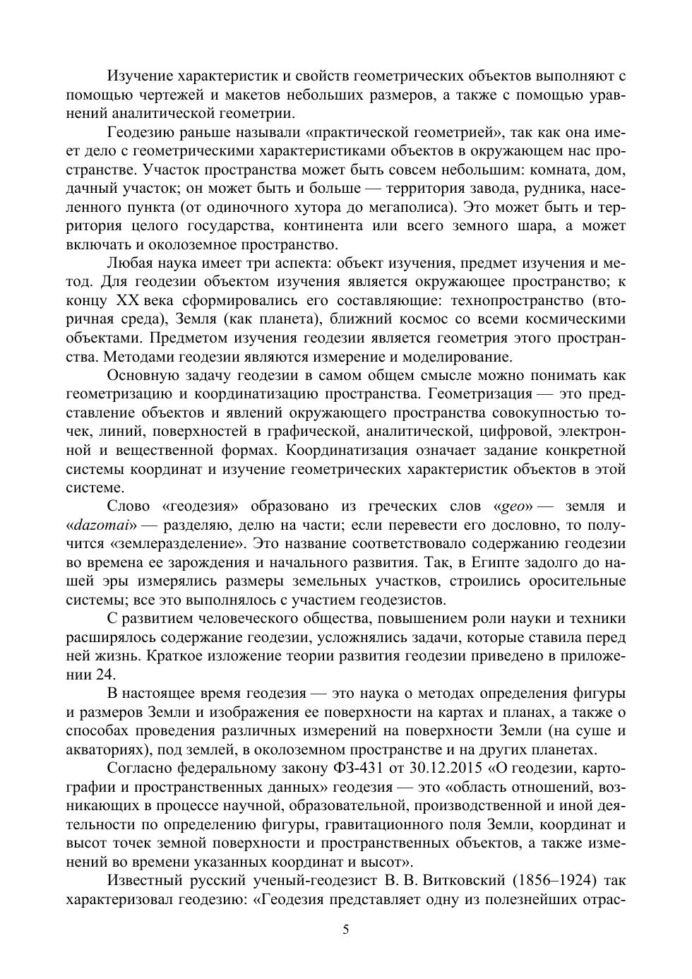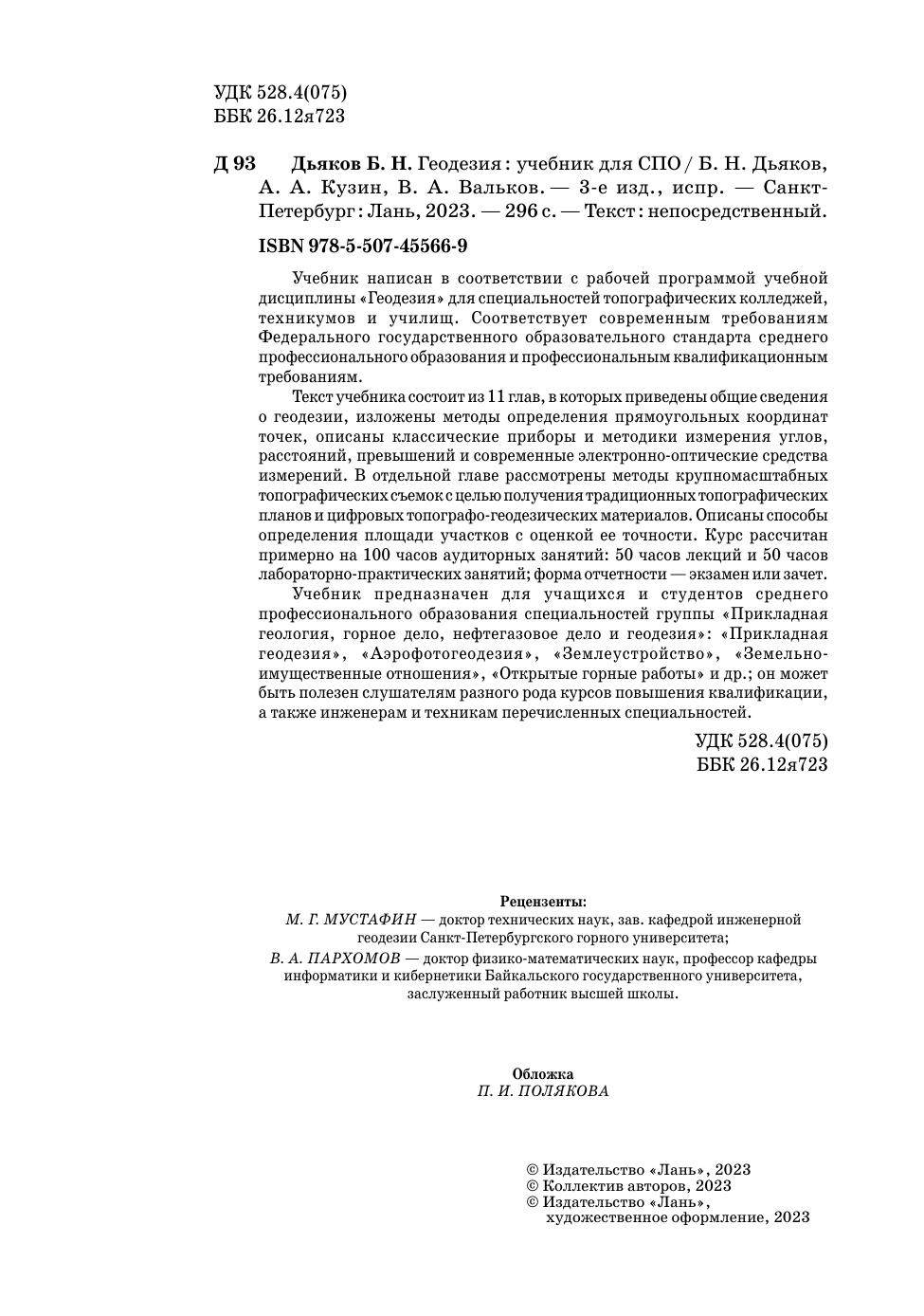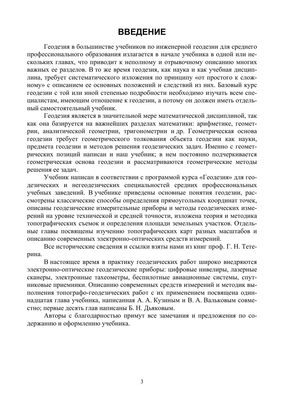 Учебник написан в соответствии с рабочей программой учебной дисциплины «Геодезия» для специальностей топографических колледжей, техникумов и училищ. Соответствует современным требованиям Федерального государственного образовательного стандарта среднего профессионального образования и профессиональным квалификационным требованиям. Текст учебника состоит из 11 глав, в которых приведены общие сведения о геодезии, изложены методы определения прямоугольных координат точек, описаны классические приборы и методики измерения углов, расстояний, превышений и современные электронно-оптические средства измерений. В отдельной главе рассмотрены методы крупномасштабных топографических съемок с целью получения традиционных топографических планов и цифровых топографо-геодезических материалов. Описаны способы определения площади участков с оценкой ее точности. Курс рассчитан примерно на 100 часов аудиторных занятий: 50 часов лекций и 50 часов лабораторно-практических занятий, форма отчетности — экзамен или зачет. Учебник предназначен для учащихся и студентов среднего профессионального образования специальностей группы «Прикладная геология, горное дело, нефтегазовое дело и геодезия»: «Прикладная геодезия», «Аэрофотогеодезия», «Землеустройство», «Земельно-имущественные отношения», «Открытые горные работы» и др., он может быть полезен слушателям разного рода курсов повышения квалификации, а также инженерам и техникам перечисленных специальностей.