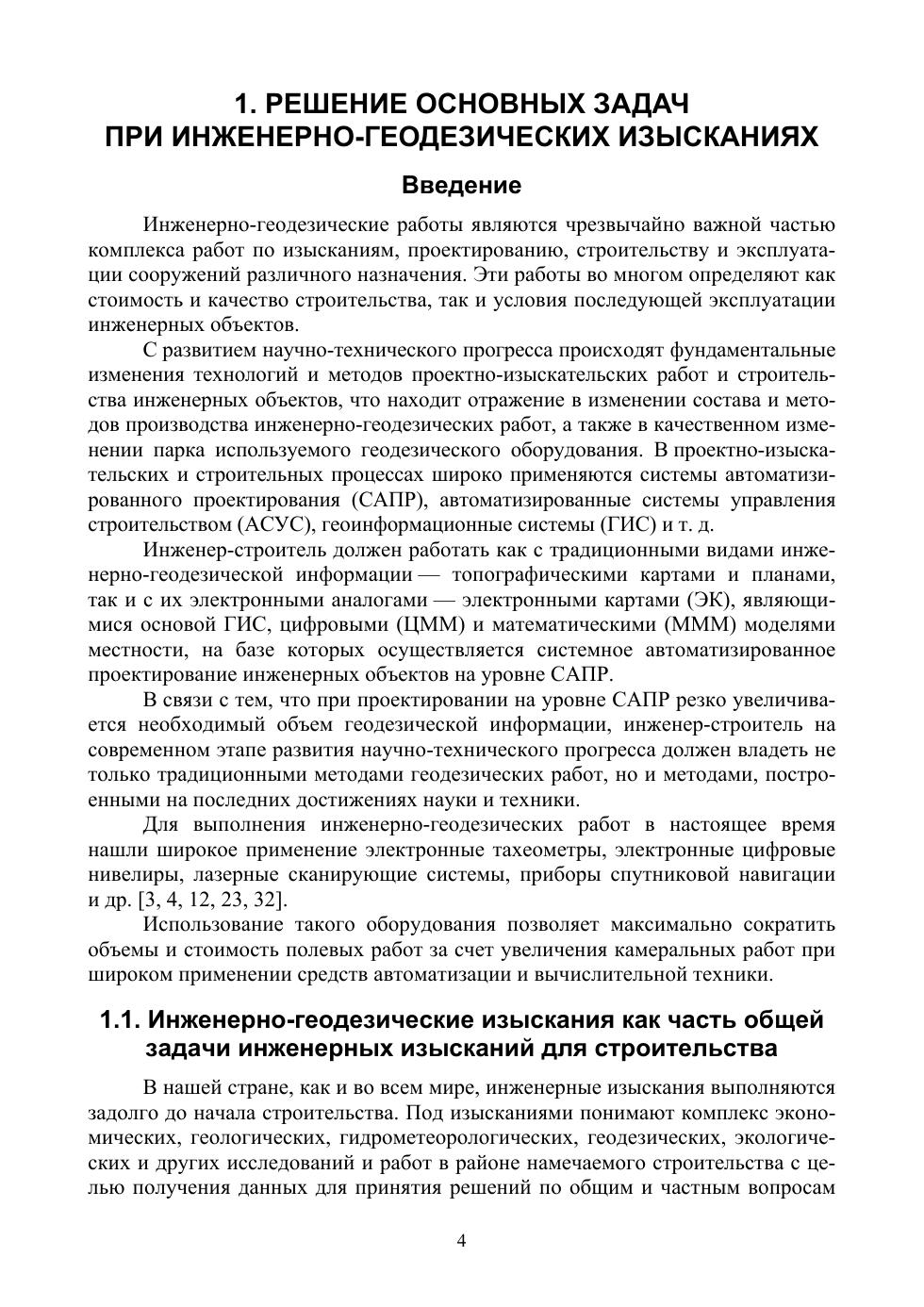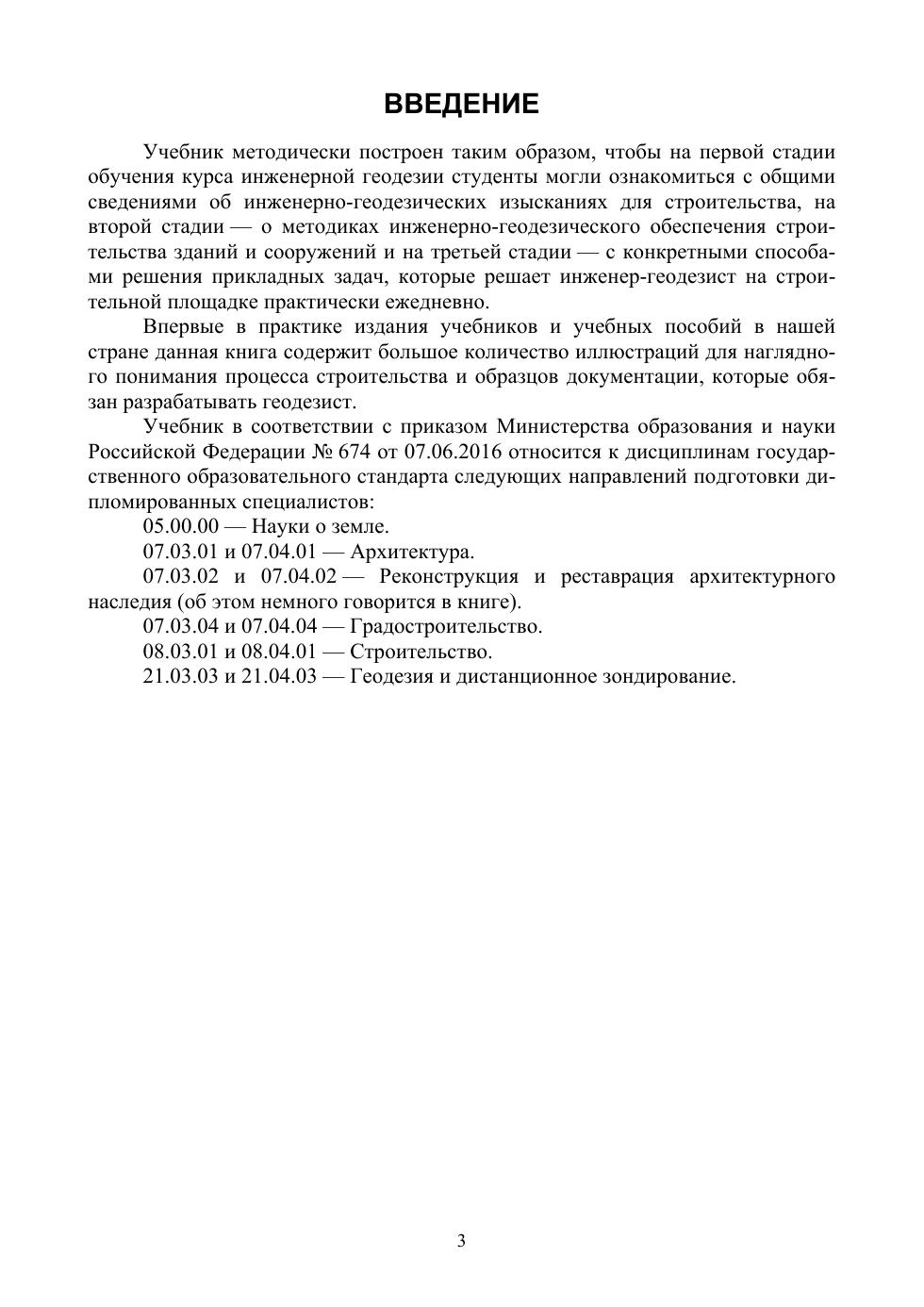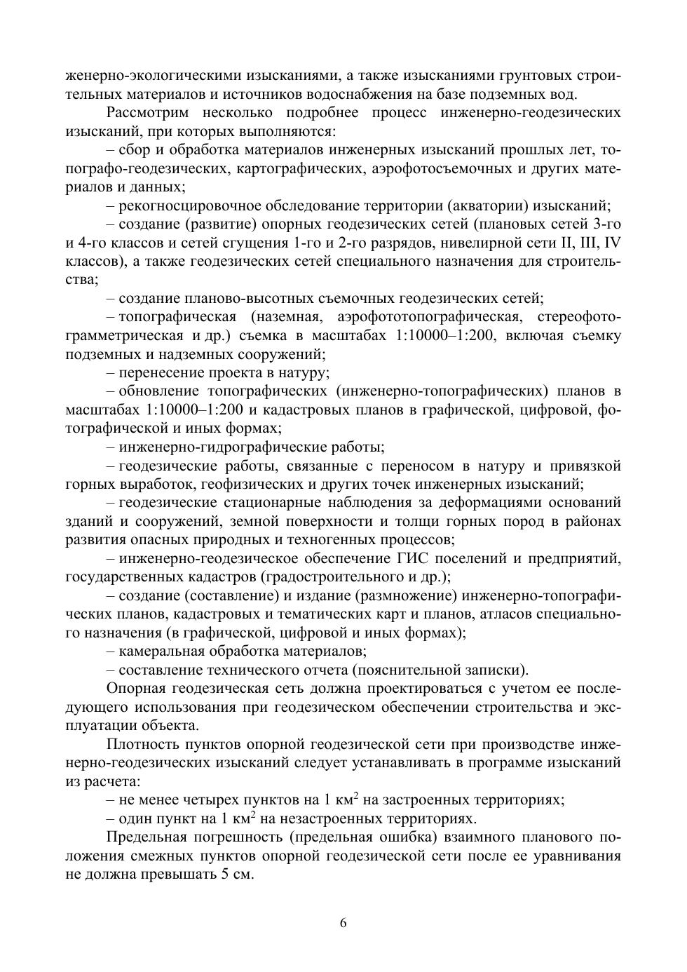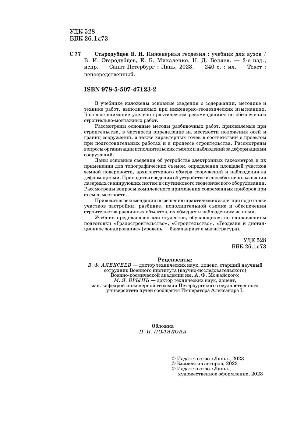 В учебнике изложены основные сведения о содержании, методике и технике работ, выполняемых при инженерно-геодезических изысканиях. Большое внимание уделено практическим рекомендациям по обеспечению строительно-монтажных работ. Рассмотрены основные методы разбивочных работ, применяемые при строительстве, в частности определение на местности положения осей и границ сооружений, а также характерных точек в соответствии с проектом при подготовительных работах и в процессе строительства. Рассмотрены вопросы организации исполнительских съемок и наблюдений за деформациями сооружений. Даны основные сведения об устройстве электронных тахеометров и их применении для топографических съемок, определения площадей участков земной поверхности, архитектурного обмера сооружений и наблюдения за деформациями. Приводятся сведения об устройстве и способах исполь-зования лазерных сканирующих систем и спутникового геодезического оборудования. Рассмотрены вопросы комплексного применения современ-ных приборов при съемке местности. Приводятся рекомендации по решению практических задач при подготовке участков застройки, разбивке, исполнительной съемке и обеспечении строительства различных объектов, их обмерам и наблюдениям за ними. Учебник предназначен для студентов, обучающихся по направлениям подготовки «Градостроительство», «Строительство», «Геодезия и дистан-ционное зондирование» (уровень — бакалавриат и магистратура).