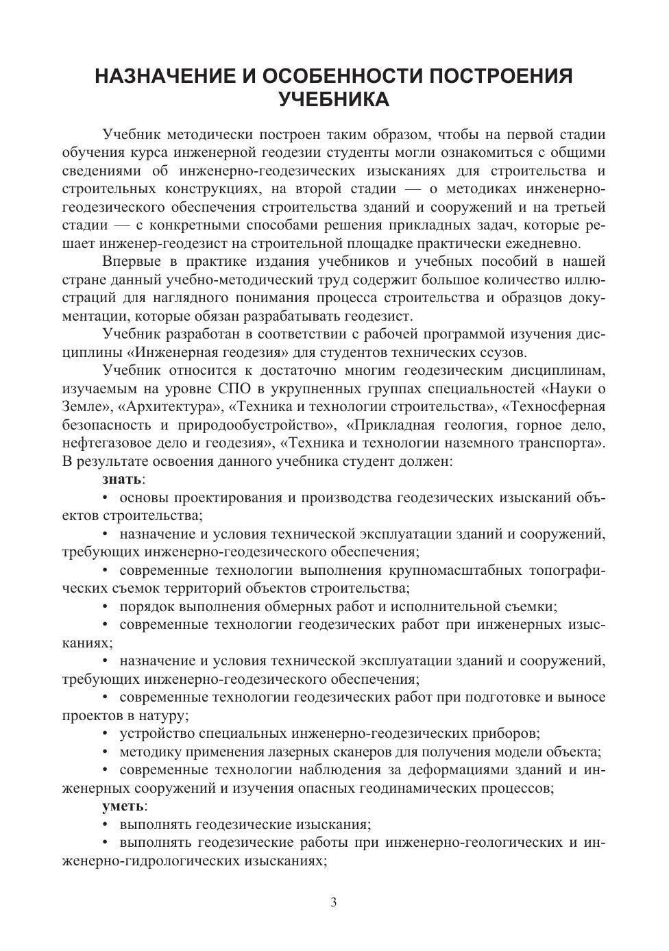Изложены сведения о работах, выполняемых при геодезическом обеспечении строительства и эксплуатации сооружений, на примерах реальных объектов. Освещены вопросы топографических съемок с помощью квадрокоптеров и геодезических разбивочных работ при строительстве дорог. Приводятся сведения о применении средств промышленной геодезии. Соответствует современным требованиям ФГОС СПО и профессиональным квалификационным требованиям. Предназначен для студентов ссузов, изучающих инженерную геодезию.