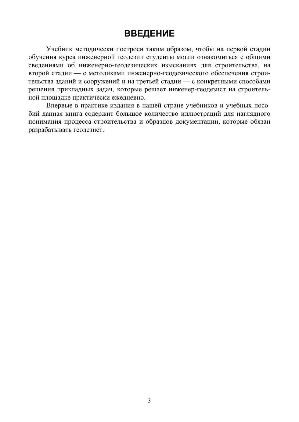 В учебнике изложены основные сведения о содержании, методике и технике работ, выполняемых при инженерно-геодезических изысканиях. Большое внимание уделено практическим рекомендациям по обеспечению строительно-монтажных работ. Рассмотрены основные методы разбивочных работ, применяемые при строительстве, в частности определение на местности положения осей и границ сооружений, а также характерных точек в соответствии с проектом при подготовительных работах и в процессе строительства. Рассмотрены вопросы организации исполнительских съемок и наблюдений за деформациями сооружений. Даны основные сведения об устройстве электронных тахеометров и их применении для топографических съемок, определения площадей участков земной поверхности, архитектурного обмера сооружений и наблюдения за деформациями. Приводятся сведения об устройстве и способах использования лазерных сканирующих систем и спутникового геодезического оборудования. Рассмотрены вопросы комплексного применения современных приборов при съемке местности. Приводятся рекомендации по решению практических задач при подготовке участков застройки, разбивке, исполнительной съемке и обеспечении строительства различных объектов, их обмерам и наблюдениям за ними. Соответствует современным требованиям Федерального государственного образовательного стандарта среднего профессионального образования и профессиональным квалификационным требованиям. Учебник предназначен для студентов средних профессиональных учебных заведений, изучающих основы геодезии.