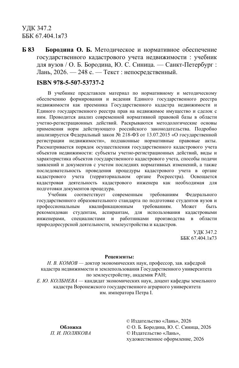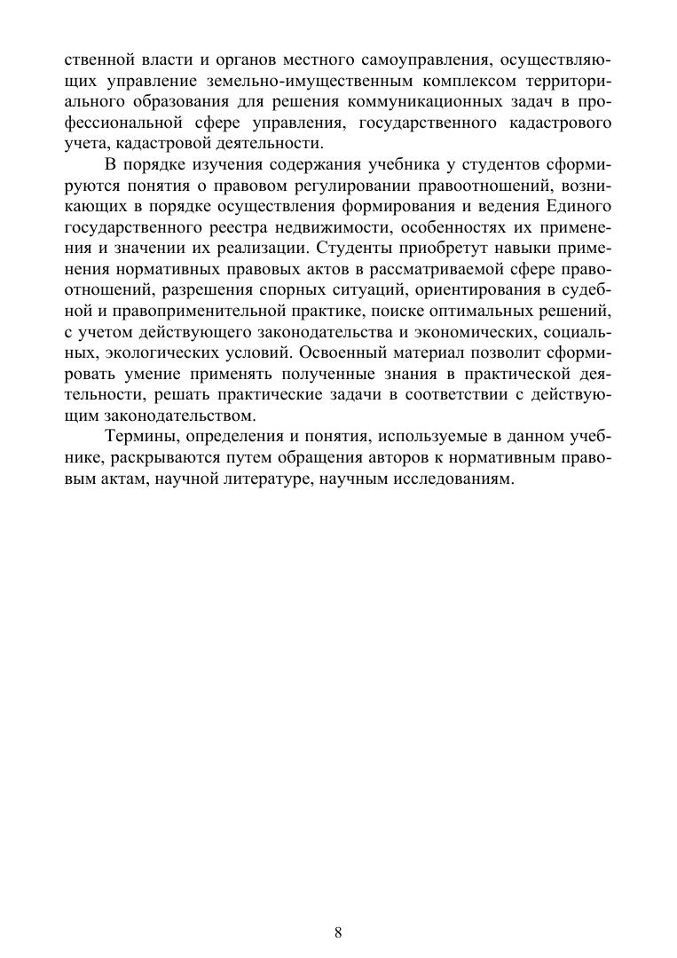 В учебнике представлен материал по нормативному и методическому обеспечению формирования и ведения Единого государственного реестра недвижимости как преемника Государственного кадастра недвижимости и Единого государственного реестра прав на недвижимое имущество и сделок с ним. Проводится анализ современной нормативной правовой базы в области учетно-регистрационных действий. Раскрываются методологические основы применения норм действующего российского законодательства. Подробно анализируется Федеральный закон № 218-ФЗ от 13.07.2015 «О государственной регистрации недвижимости», подзаконные нормативные правовые акты. Рассматривается порядок осуществления государственного кадастрового учета объектов недвижимости: субъекты учетно-регистрационных действий, виды и характеристика объектов государственного кадастрового учета, способы подачи заявлений и документов с учетом последних нормативных изменений, а также последовательность проведения процедуры кадастрового учета в органе кадастрового учета (территориальном органе Росреестра). Освещается кадастровая деятельность кадастрового инженера как необходимая для подготовки документов процедура. Учебник соответствует современным требованиям Федерального государственного образовательного стандарта по подготовке студентов вузов и профессиональным квалификационным требованиям. Может быть рекомендован студентам, аспирантам, для использования кадастровыми инженерами, специалистами и работниками производства в области природоресурсной деятельности, землеустройства и кадастров.