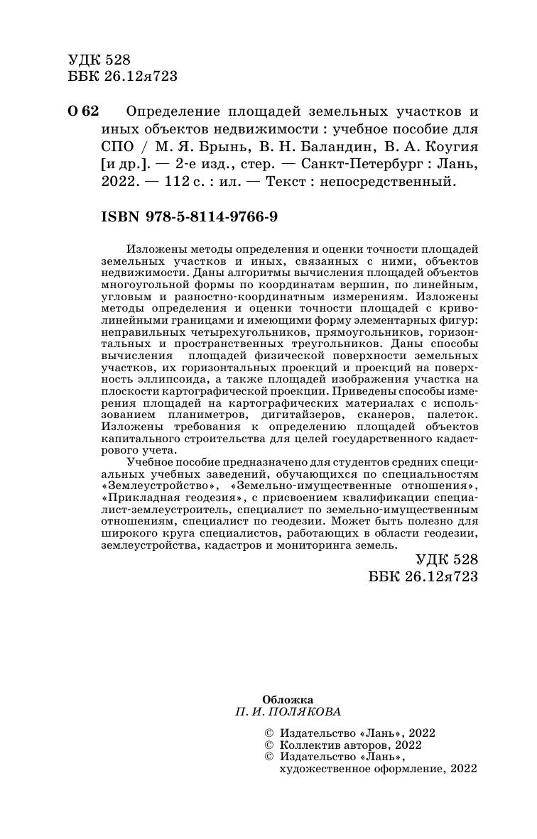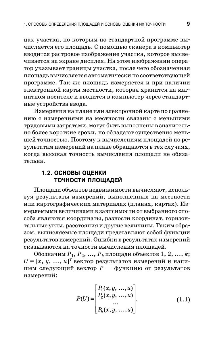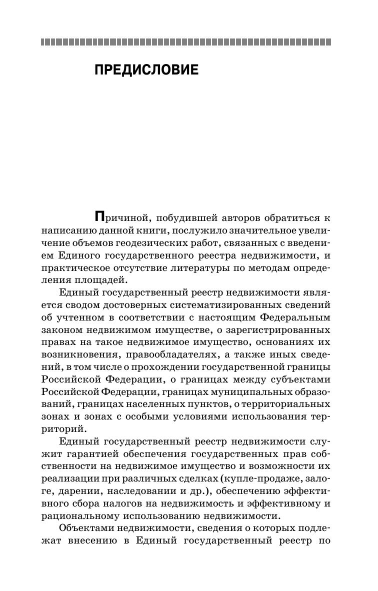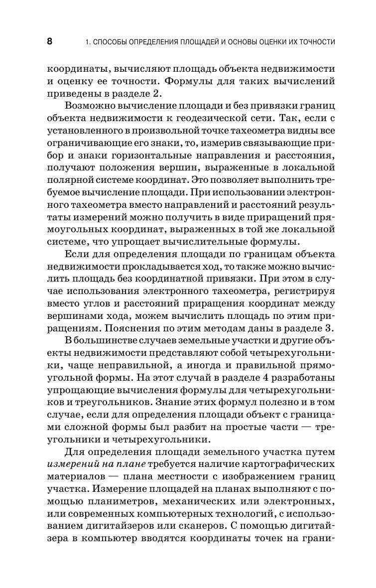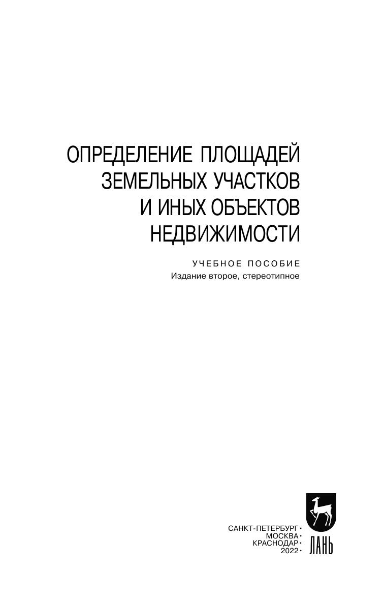 Изложены методы определения и оценки точности площадей земельных участков и иных, связанных с ними, объектов недвижимости. Даны алгоритмы вычисления площадей объектов многоугольной формы по координатам вершин, по линейным, угловым и разностно-координатным измерениям. Изложены методы определения и оценки точности площадей с криволинейными границами и имеющими форму элементарных фигур: неправильных четырехугольников, прямоугольников, горизонтальных и пространственных треугольников. Даны способы вычисления площадей физической поверхности земельных участков, их горизонтальных проекций и проекций на поверхность эллипсоида, а также площадей изображения участка на плоскости картографической проекции. Приведены способы измерения площадей на картографических материалах с использованием планиметров, дигитайзеров, сканеров, палеток. Изложены требования к определению площадей объектов капитального строительства для целей государственного кадастрового учета. Учебное пособие предназначено для студентов средних специальных учебных заведений, обучающихся по специальностям «Землеустройство», «Земельно-имущественные отношения», «Прикладная геодезия», с присвоением квалификации специалист-землеустроитель, специалист по земельно-имущественным отношениям, специалист по геодезии. Может быть полезно для широкого круга специалистов, работающих в области геодезии, землеустройства, кадастров и мониторинга земель.
