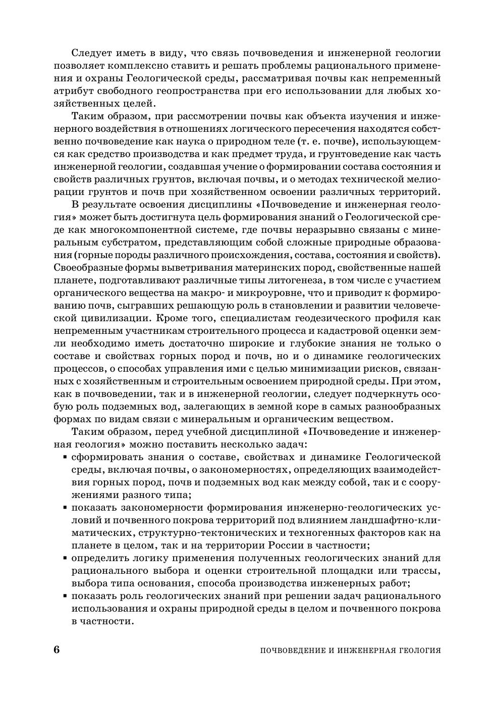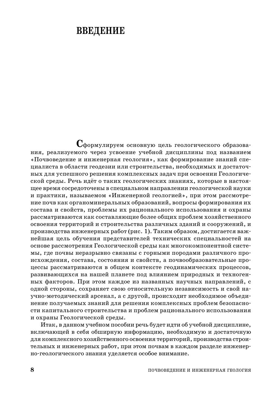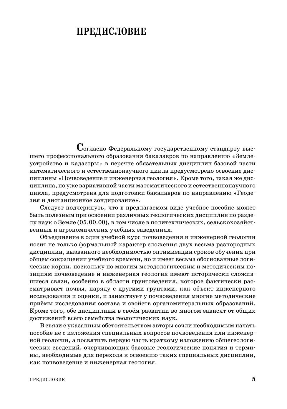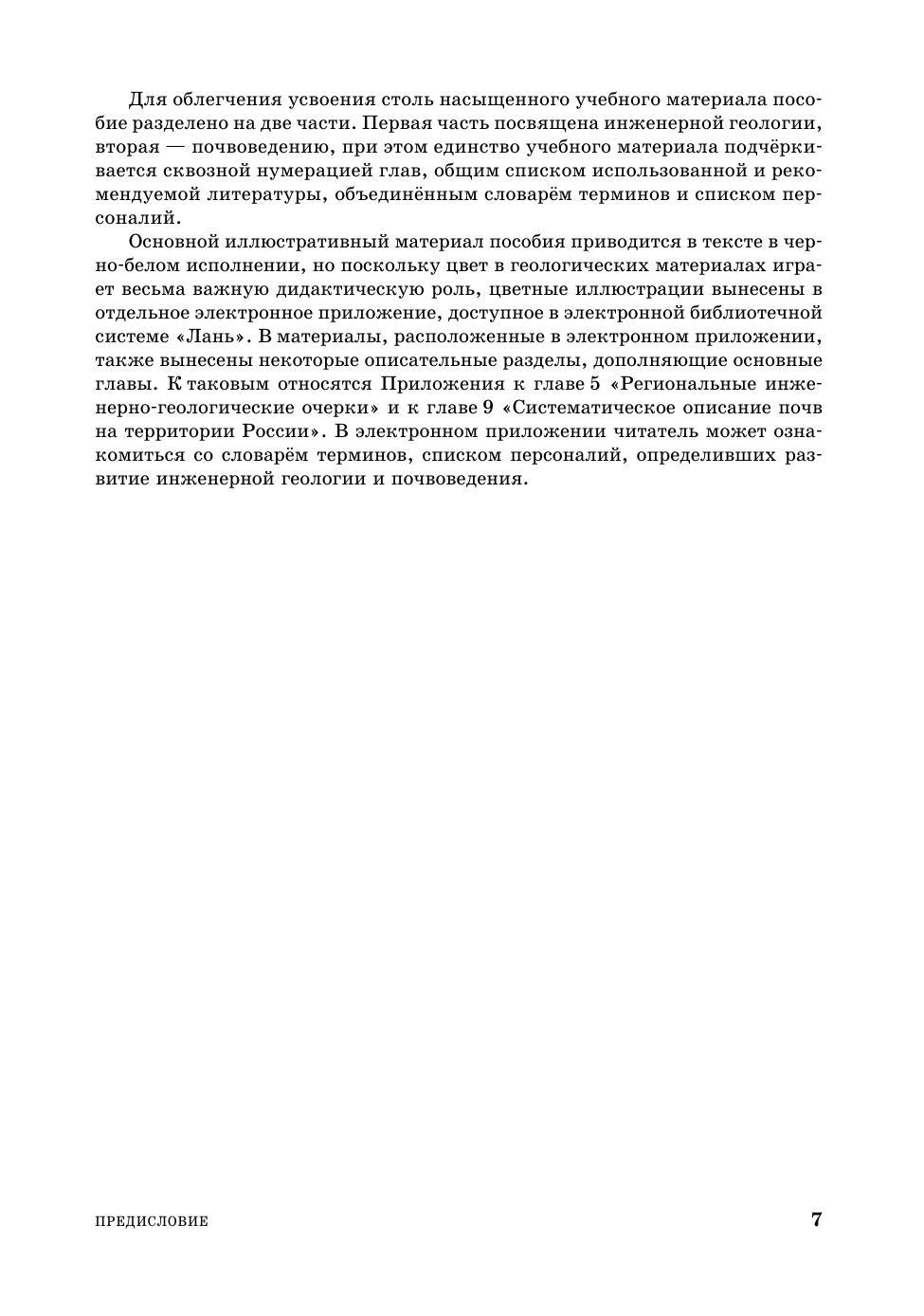 Даются начала геологических знаний в объёме сведений по общей и полевой геологии. Рассматриваются основные разделы инженерной геологии в составе грунтоведения, инженерной геодинамики, инженерных изысканий и региональной инженерной геологии. Обосновывается общий объект изучения грунтоведения и почвоведения — почвы, и рассматриваются основы генетического почвоведения и типизация почв на территории России. Приводится характеристика состава, состояния и свойств различных грунтов, включая почвы, как многофазных систем. Рассмотрены условия залегания и движения подземных вод и определена роль подземных вод при освоении территорий и строительстве различных зданий и сооружений. Формулируется понятие об инженерно-геологических условиях и рассматриваются закономерности их формирования по регионам страны. Приводится систематическое описание почв по различным регионам России. Подчеркивается неразрывная связь инженерной геологии и почвоведения с вопросами рационального использования и охраны природой среды. Предназначено для студентов строительных и топогеодезических факультетов и вузов, обучающихся по бакалаврским и магистерским программам, слушателей институтов повышения квалификации и инженерно-технических работников изыскательских, проектных и строительных организаций, специализирующихся в области инженерно-геологических, инженерно-геотехнических, инженерно-геодезических изысканий и кадастровой оценки земель. К книге прилагаются дополнительные материалы, доступные в электронной библиотечной системе «Лань» по ссылке или QR-коду, указанным ниже.