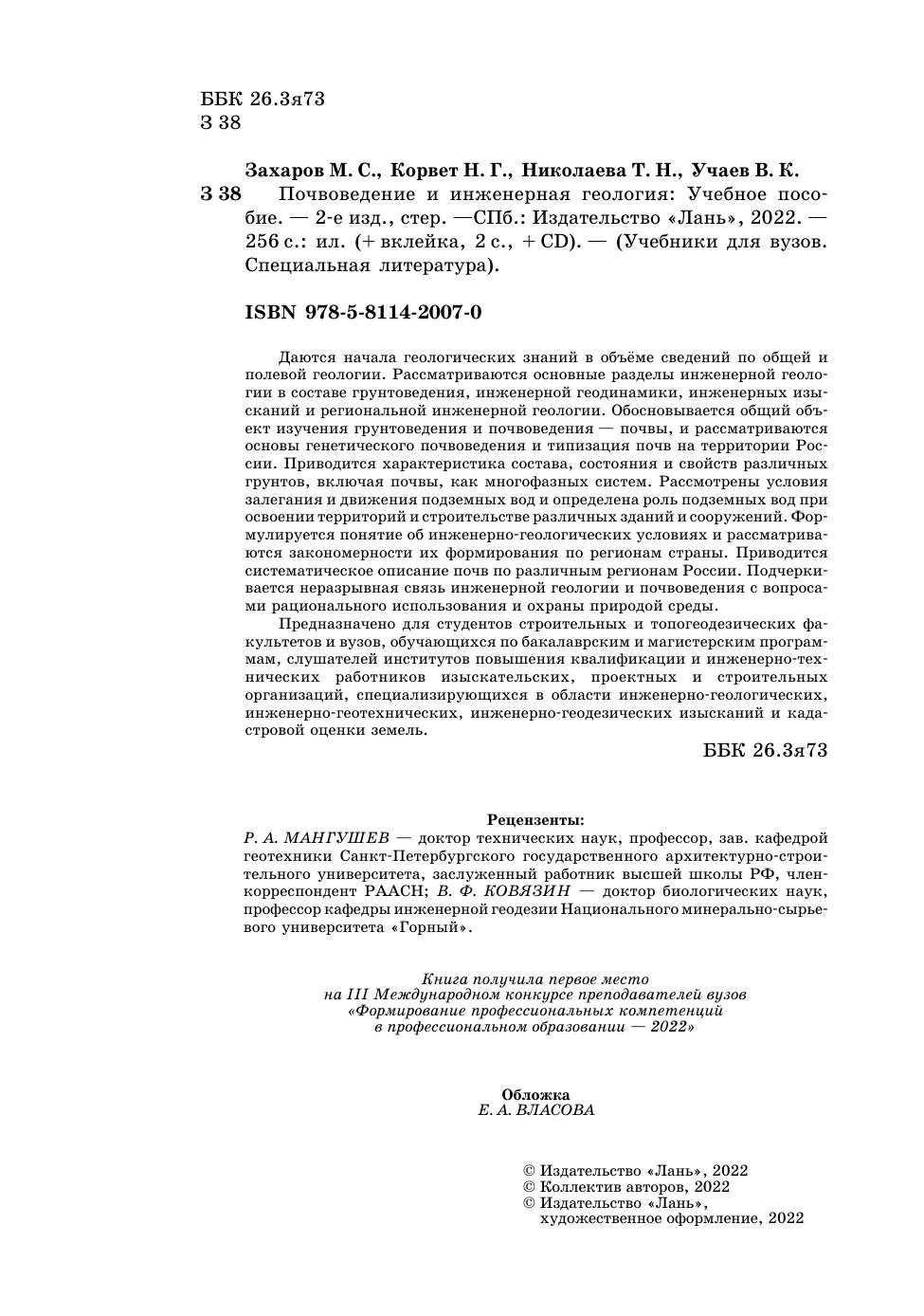 Даются начала геологических знаний в объеме сведений по общей и полевой геологии. Рассматриваются основные разделы инженерной геологии в составе грунтоведения, инженерной геодинамики, инженерных изысканий и региональной инженерной геологии. Обосновывается общий объект изучения грунтоведения и почвоведения — почвы, и рассматриваются основы генетического почвоведения и типизация почв на территории России. Приводится характеристика состава, состояния и свойств различных грунтов, включая почвы, как многофазных систем. Рассмотрены условия залегания и движения подземных вод и определена роль подземных вод при освоении территорий и строительстве различных зданий и сооружений. Формулируется понятие об инженерно-геологических условиях и рассматриваются закономерности их формирования по регионам страны. Приводится систематическое описание почв по различным регионам России. Подчеркивается неразрывная связь инженерной геологии и почвоведения с вопросами рационального использования и охраны природой среды. Предназначено для студентов строительных и топогеодезических факультетов и вузов, обучающихся по бакалаврским и магистерским программам, слушателей институтов повышения квалификации и инженерно-технических работников изыскательских, проектных и строительных организаций, специализирующихся в области инженерно-геологических, инженерно-геотехнических, инженерно-геодезических изысканий и кадастровой оценки земель.