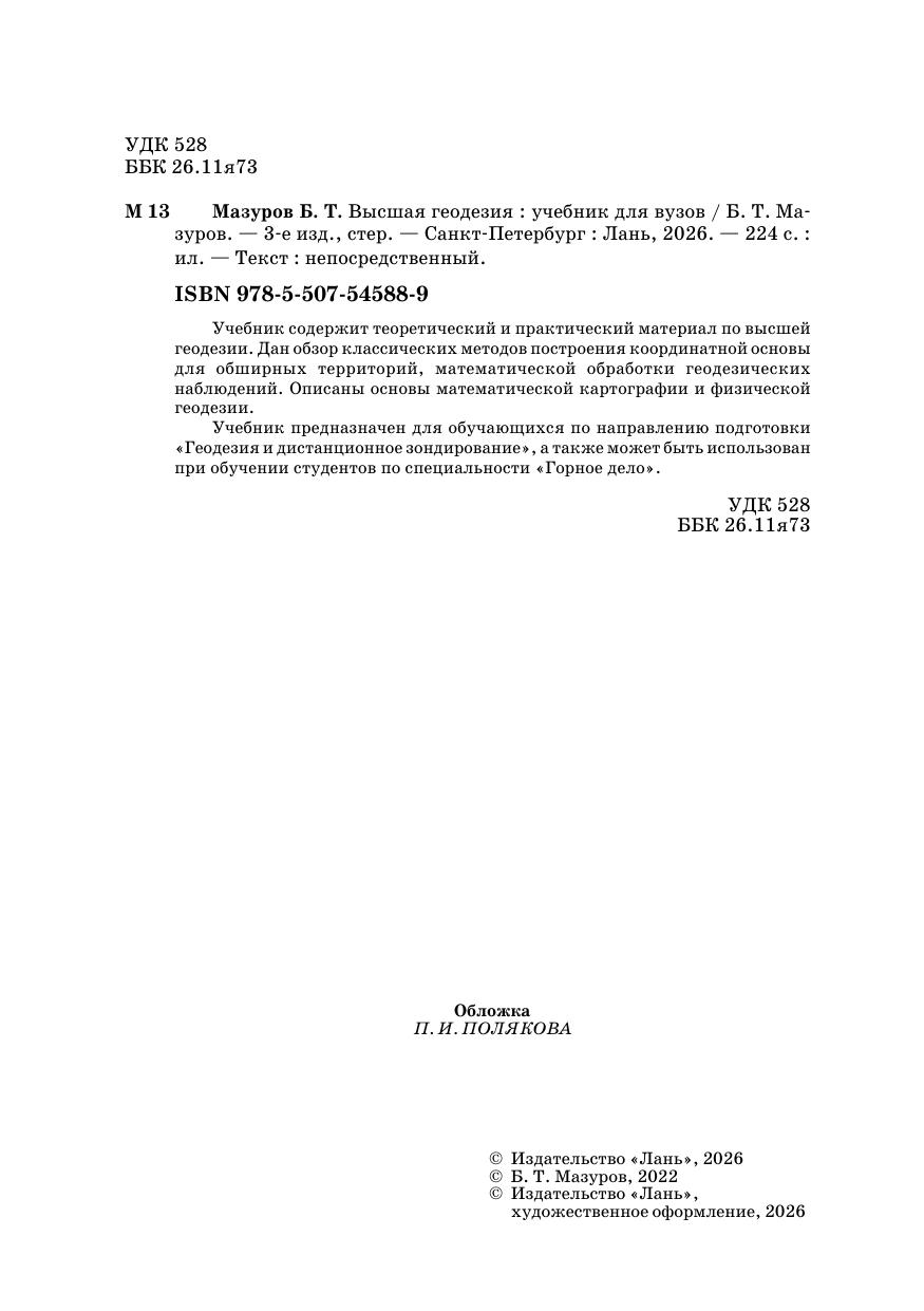 Учебник содержит теоретический и практический материал по высшей геодезии. Дан обзор классических методов построения координатной основы для обширных территорий, математической обработки геодезических наблюдений. Описаны основы математической картографии и физической геодезии. Учебник предназначен для обучающихся по направлению подготовки «Геодезия и дистанционное зондирование», а также может быть использован при обучении студентов по специальности «Горное дело».