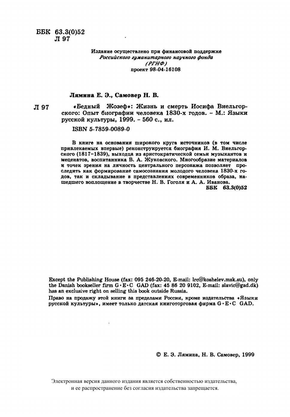 В книге на основании широкого круга источников (в том числе привлекаемых впервые) реконструируется биография И.М. Виельгорского, выходца из аристократической семьи музыкантов и меценатов, воспитанника В.А. Жуковского. Многообразие материалов и точек зрения на личность центрального персонажа позволяет проследить как формирование самосознания молодого человека 1830-х годов, так и складывание в представлениях современников образа, нашедшего воплощение в творчестве Н.В. Гоголя и А.А. Иванова. Для научных работников, преподавателей, аспирантов и студентов, широкого круга читателей.