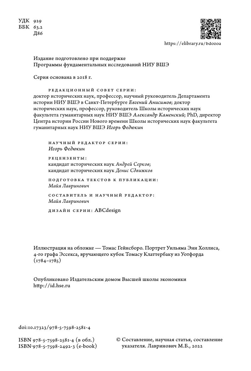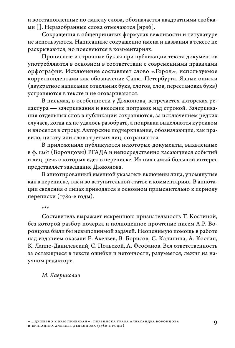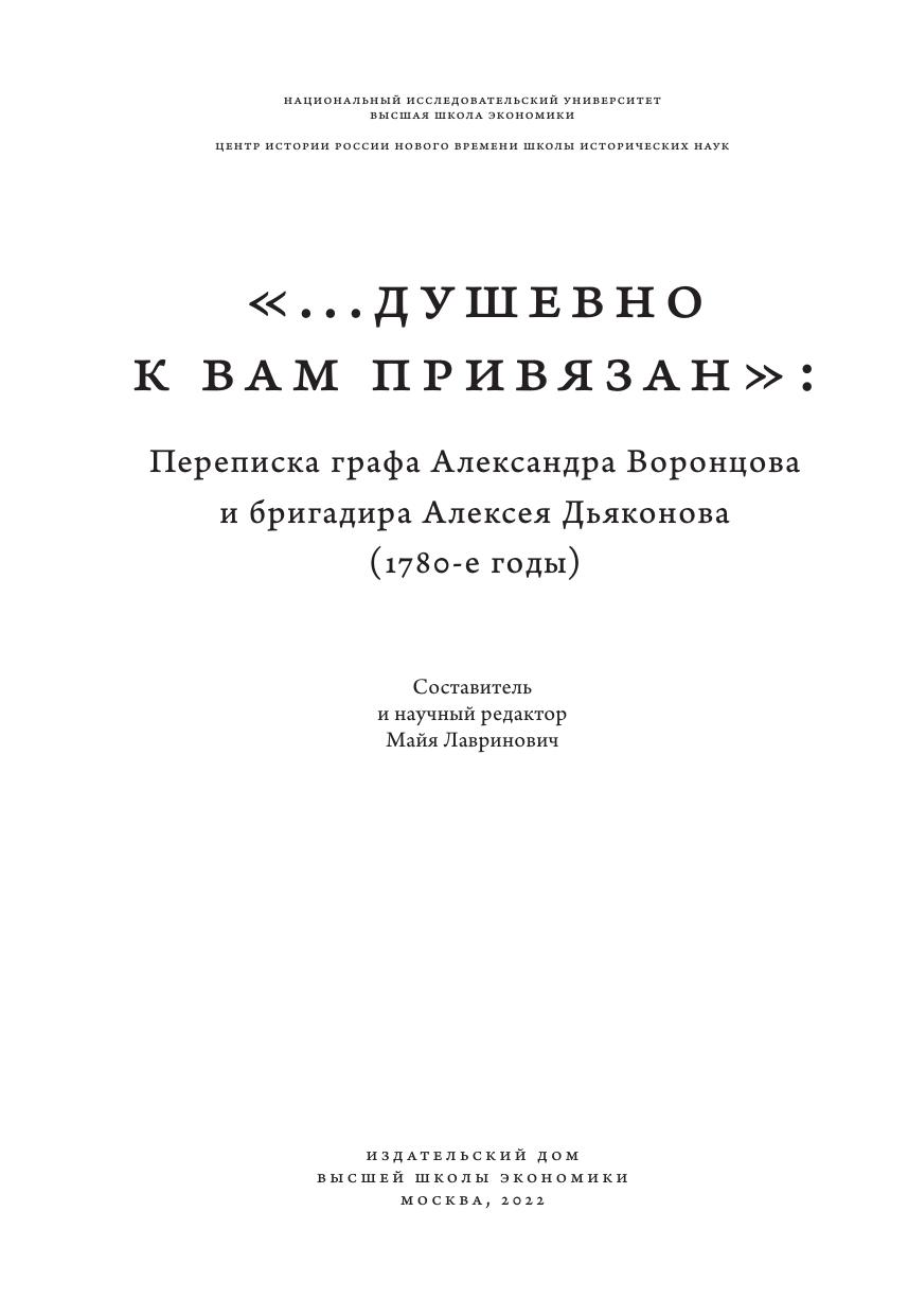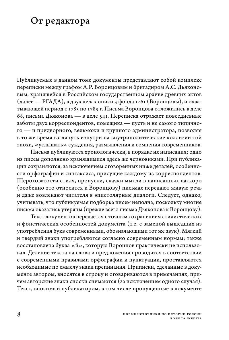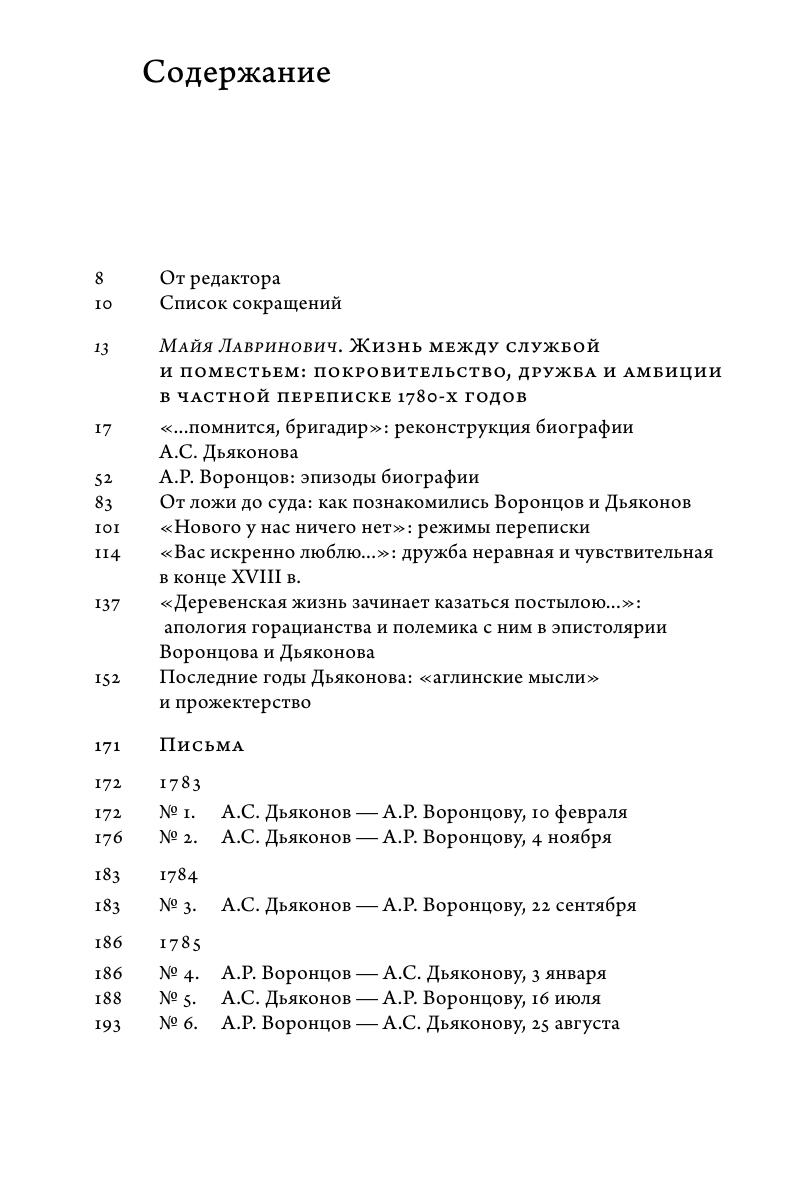 В издании впервые вводится в научный оборот переписка графа А.Р. Воронцова и его современника бригадира А.С. Дьяконова. Письма касаются проблем, составлявших повседневность и формировавших жизненный мир русского дворянства: служба, хозяйство, награждения, петербургский двор, войны и связанные с ними рекрутские наборы. Второй существенный пласт переписки — это размышления о связывавших корреспондентов взаимоотношениях, попытки говорить о них разным языком, открывающие с неожиданной стороны внутренний мир как знаменитого вельможи, так и рядового, на первый взгляд, военного.