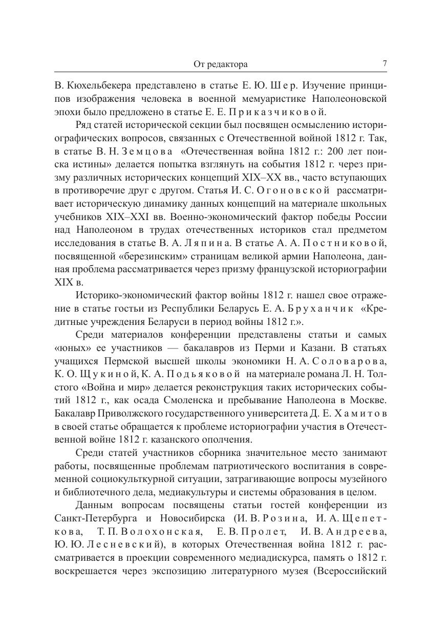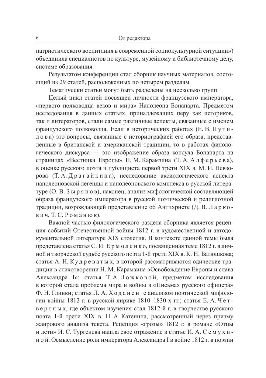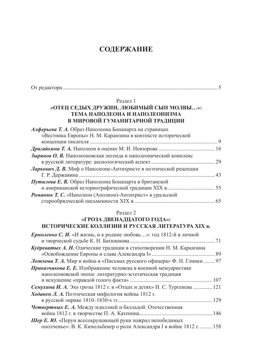 Публикуются статьи историков, филологов, культурологов, библиотечных и музейных работников, объединенными усилиями которых и была проведена конференция. Целый цикл статей посвящен личности французского императора Наполеона Бонапарта. Важной частью сборника стала рецепция событий Отечественной войны 1812 г. в государственной и автодокументированной литературе XIX в.