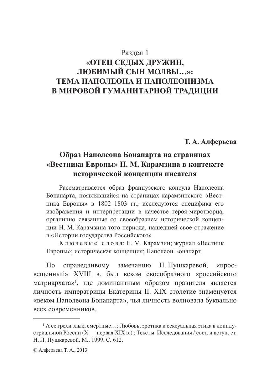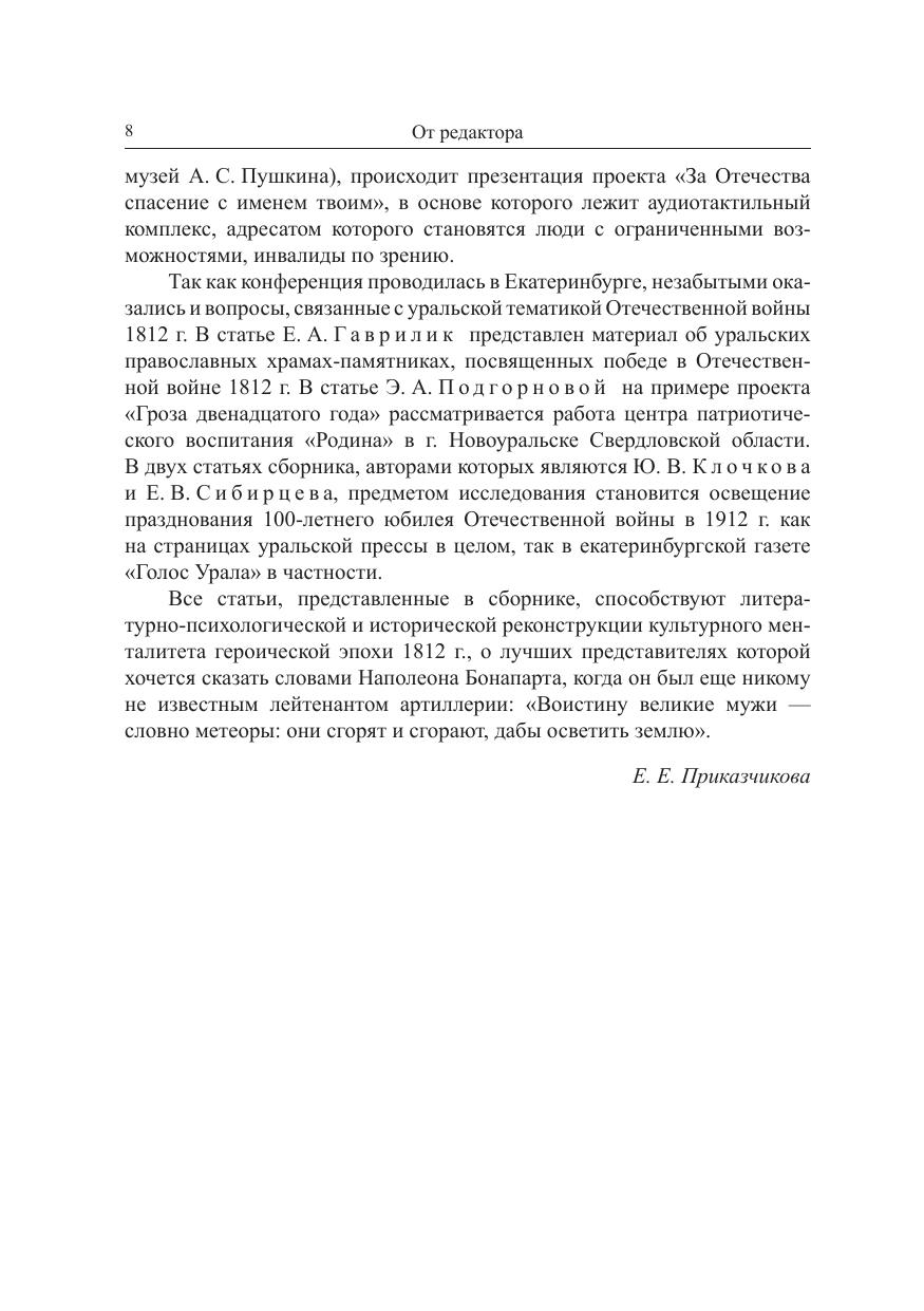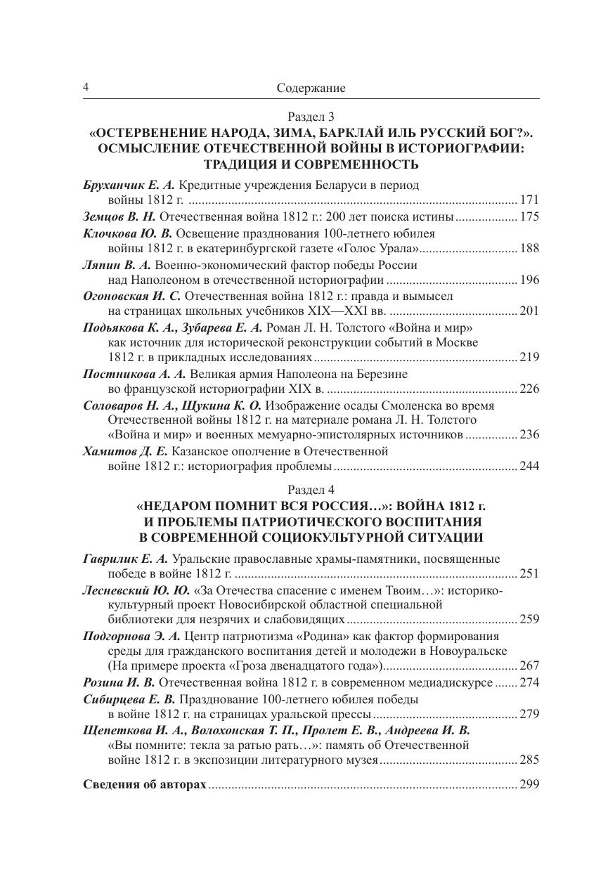 Публикуются статьи историков, филологов, культурологов, библиотечных и музейных работников, объединенными усилиями которых и была проведена конференция. Целый цикл статей посвящен личности французского императора Наполеона Бонапарта. Важной частью сборника стала рецепция событий Отечественной войны 1812 г. в государственной и автодокументированной литературе XIX в.