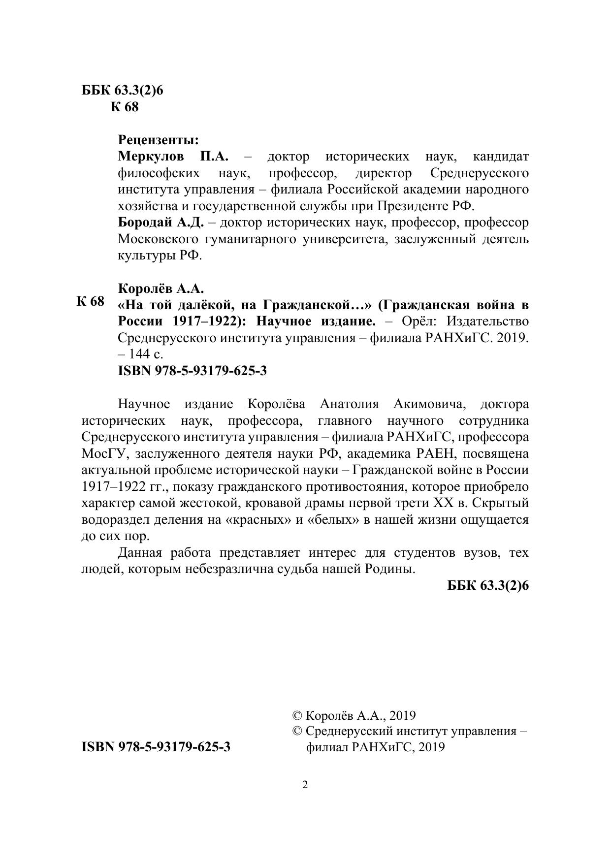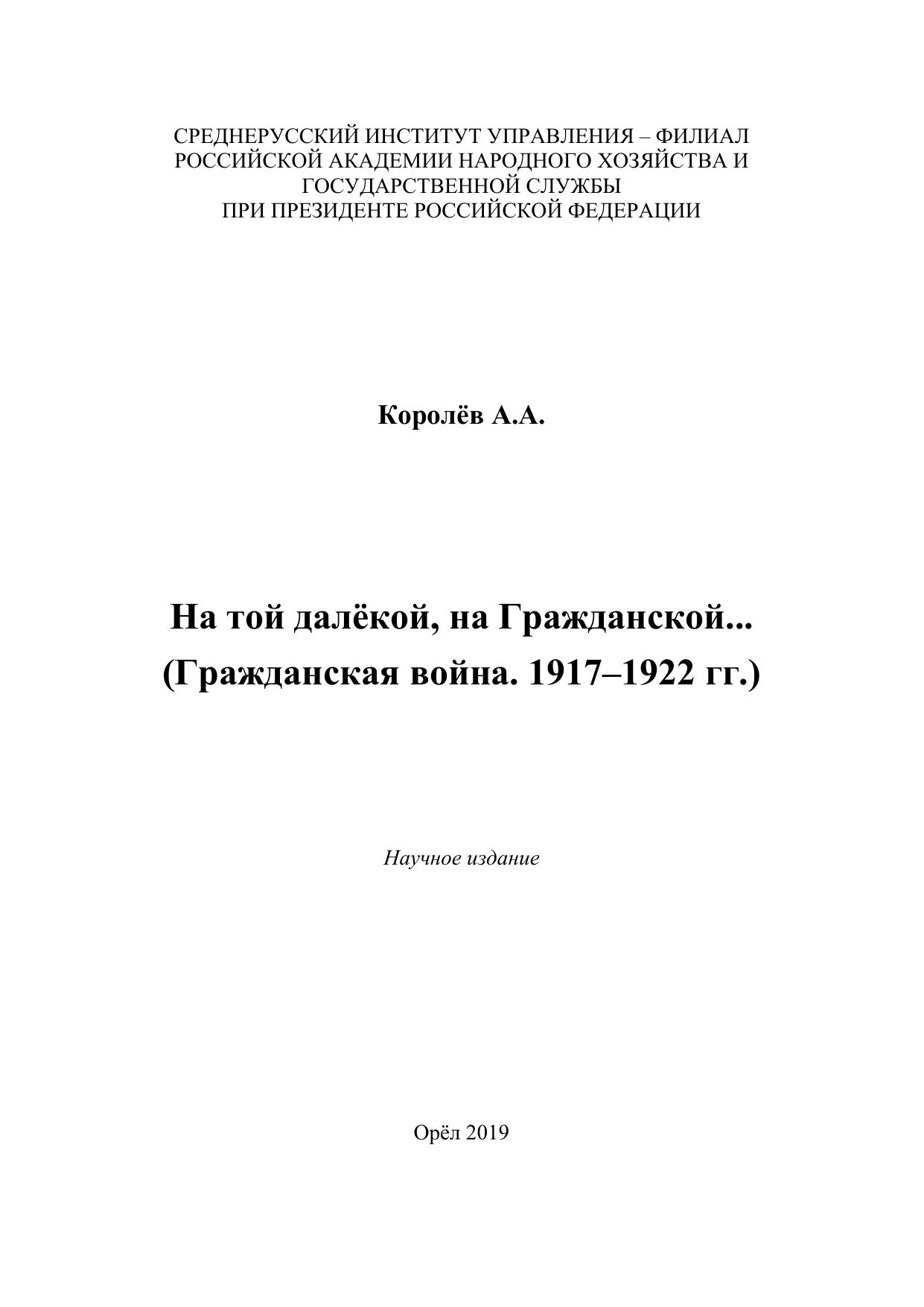 Научное издание Королёва Анатолия Акимовича, доктора исторических наук, профессора, главного научного сотрудника Среднерусского института управления – филиала РАНХиГС, профессора МосГУ, заслуженного деятеля науки РФ, академика РАЕН, посвящена актуальной проблеме исторической науки – Гражданской войне в России 1917–1922 гг., показу гражданского противостояния, которое приобрело характер самой жестокой, кровавой драмы первой трети XX в. Скрытый водораздел деления на «красных» и «белых» в нашей жизни ощущается до сих пор. Данная работа представляет интерес для студентов вузов, тех людей, которым небезразлична судьба нашей Родины.