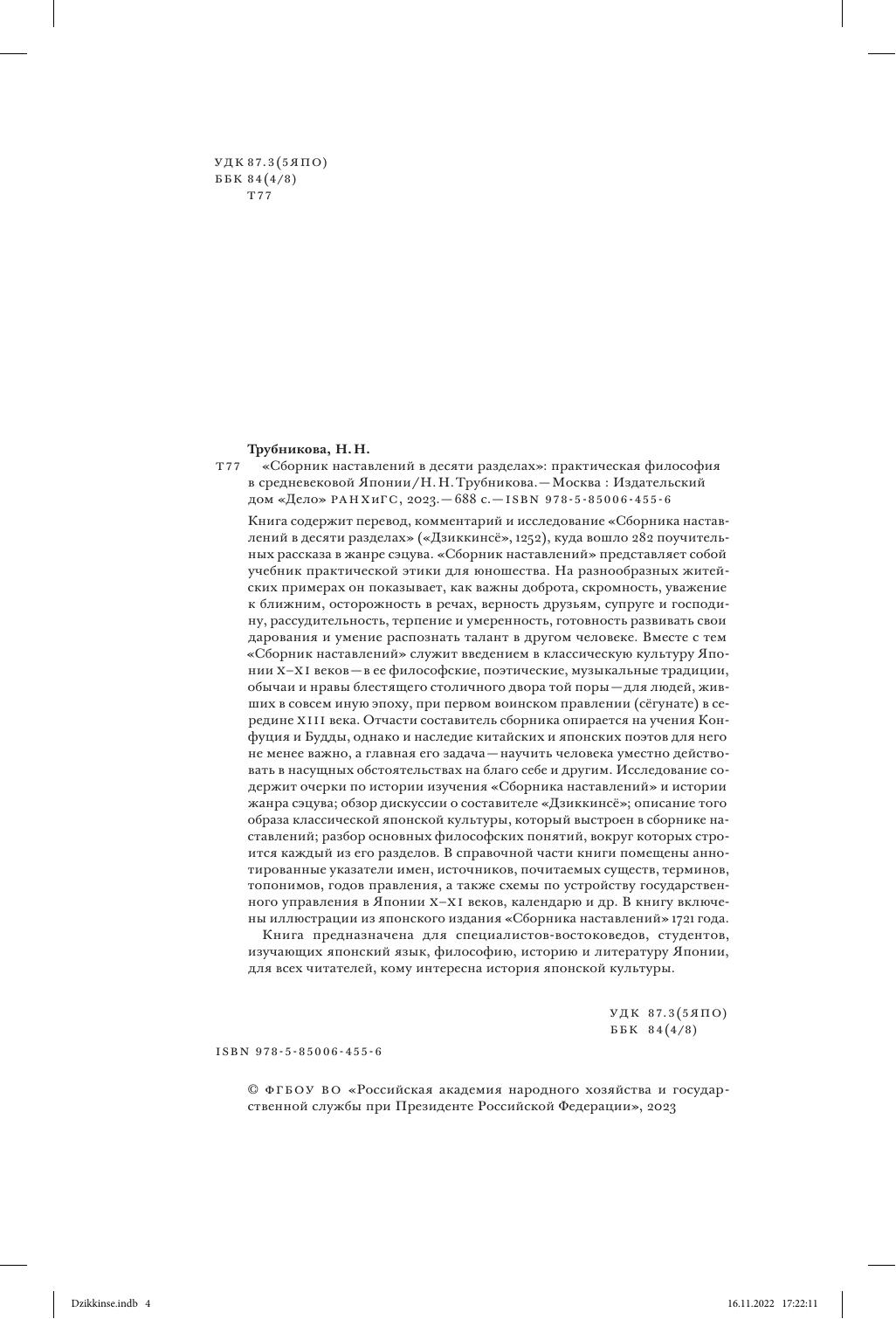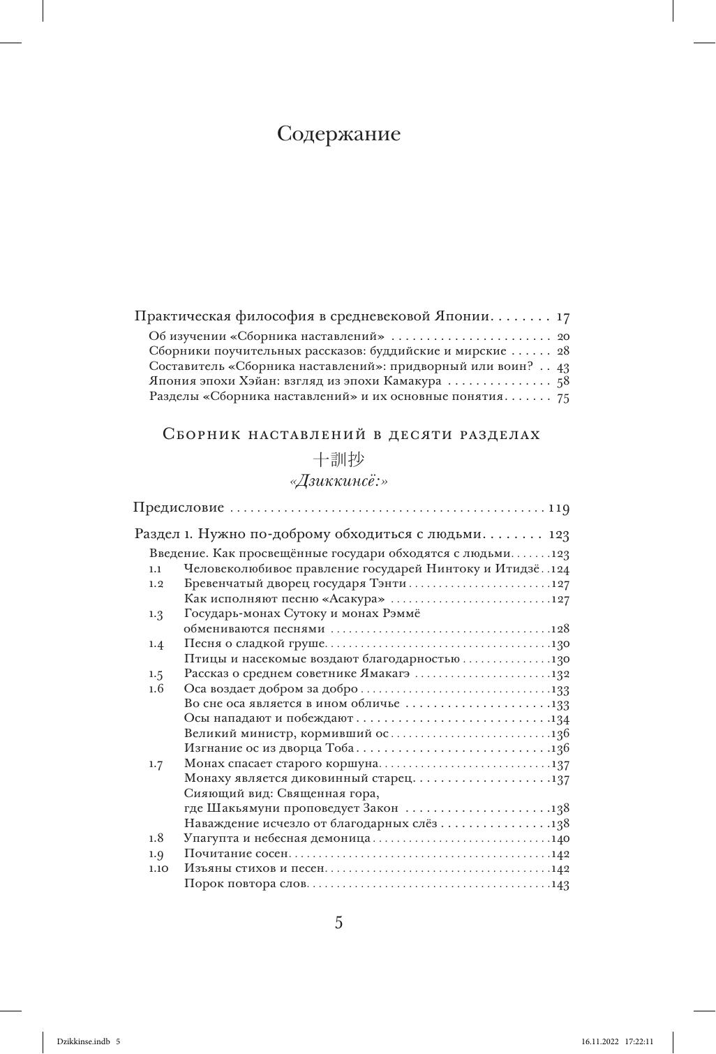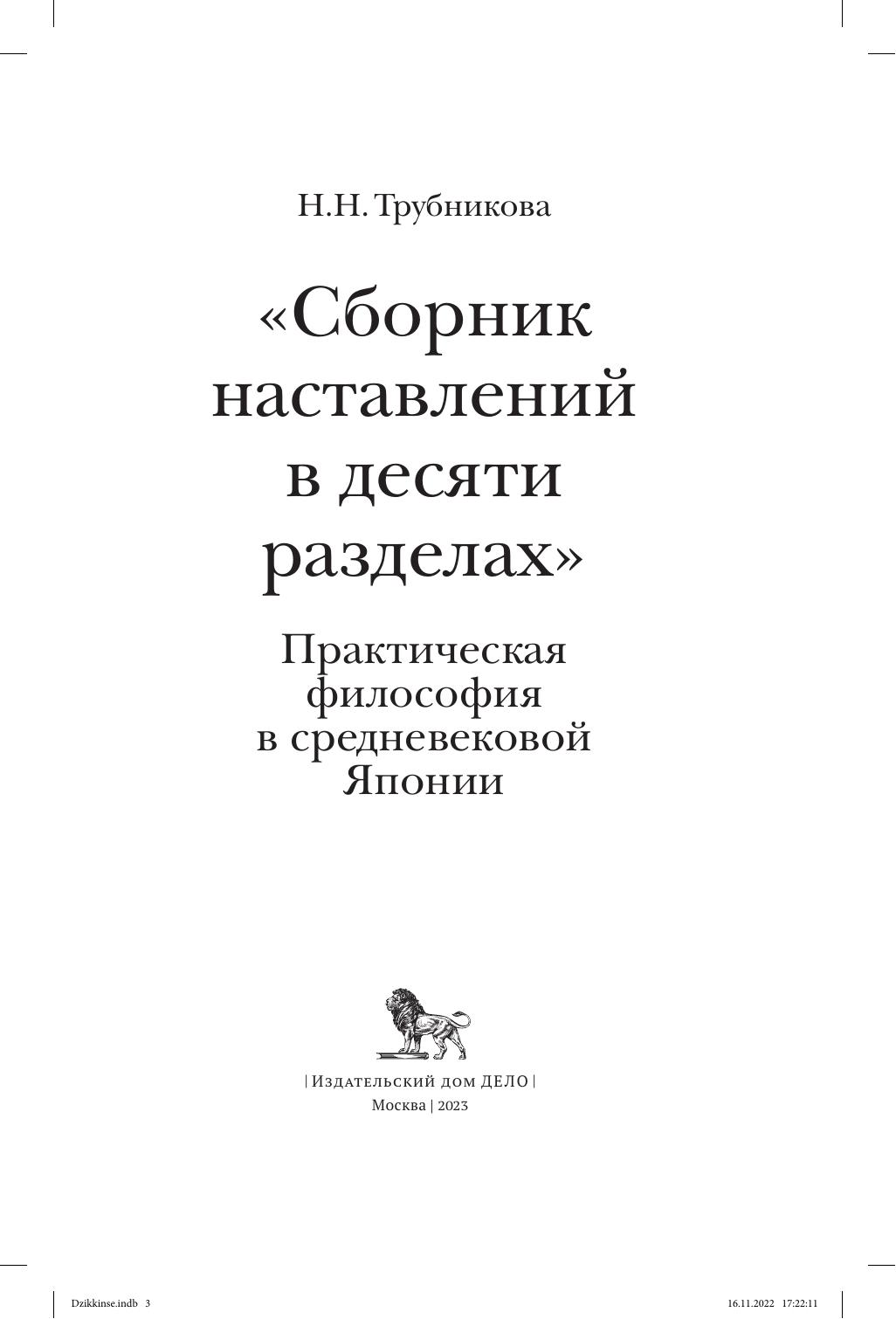 Книга содержит перевод, комментарий и исследование «Сборника наставлений в десяти разделах» («Дзиккинсё», 1252), куда вошло 282 поучительных рассказа в жанре сэцува. «Сборник наставлений» представляет собой учебник практической этики для юношества. На разнообразных житейских примерах он показывает, как важны доброта, скромность, уважение к ближним, осторожность в речах, верность друзьям, супруге и господину, рассудительность, терпение и умеренность, готовность развивать свои дарования и умение распознать талант в другом человеке. Вместе с тем «Сборник наставлений» служит введением в классическую культуру Японии X–XI веков — в ее философские, поэтические, музыкальные традиции, обычаи и нравы блестящего столичного двора той поры — для людей, живших в совсем иную эпоху, при первом воинском правлении (сёгунате) в середине XIII века. Отчасти составитель сборника опираeтся на учения Конфуция и Будды, однако и наследие китайских и японских поэтов для него не менее важно, а главная его задача — научить человека уместно действовать в насущных обстоятельствах на благо себе и другим. Исследование содержит очерки по истории изучения «Сборника наставлений» и истории жанра сэцува; обзор дискуссии о составителе «Дзиккинсё»; описание того образа классической японской культуры, который выстроен в сборнике наставлений; разбор основных философских понятий, вокруг которых строится каждый из его разделов. В справочной части книги помещены аннотированные указатели имен, источников, почитаемых существ, терминов, топонимов, годов правления, а также схемы по устройству государственного управления в Японии X–XI веков, календарю и др. В книгу включены иллюстрации из японского издания «Сборника наставлений» 1721 года. Книга предназначена для специалистов-востоковедов, студентов, изучающих японский язык, философию, историю и литературу Японии, для всех читателей, кому интересна история японской культуры.
