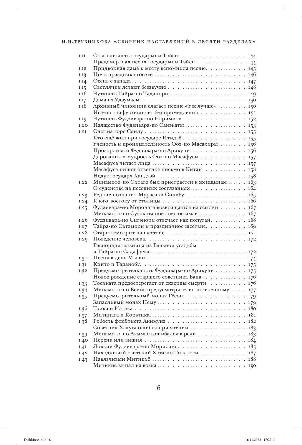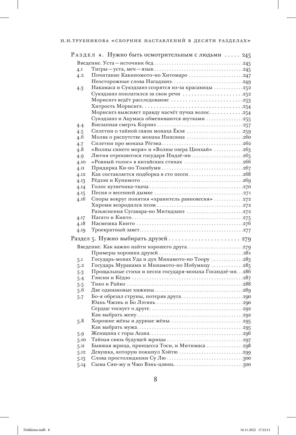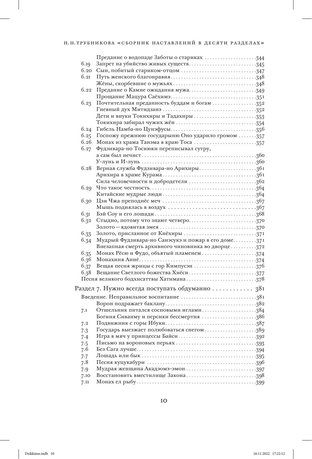 Книга содержит перевод, комментарий и исследование «Сборника наставлений в десяти разделах» («Дзиккинсё», 1252), куда вошло 282 поучительных рассказа в жанре сэцува. «Сборник наставлений» представляет собой учебник практической этики для юношества. На разнообразных житейских примерах он показывает, как важны доброта, скромность, уважение к ближним, осторожность в речах, верность друзьям, супруге и господину, рассудительность, терпение и умеренность, готовность развивать свои дарования и умение распознать талант в другом человеке. Вместе с тем «Сборник наставлений» служит введением в классическую культуру Японии X–XI веков — в ее философские, поэтические, музыкальные традиции, обычаи и нравы блестящего столичного двора той поры — для людей, живших в совсем иную эпоху, при первом воинском правлении (сёгунате) в середине XIII века. Отчасти составитель сборника опираeтся на учения Конфуция и Будды, однако и наследие китайских и японских поэтов для него не менее важно, а главная его задача — научить человека уместно действовать в насущных обстоятельствах на благо себе и другим. Исследование содержит очерки по истории изучения «Сборника наставлений» и истории жанра сэцува; обзор дискуссии о составителе «Дзиккинсё»; описание того образа классической японской культуры, который выстроен в сборнике наставлений; разбор основных философских понятий, вокруг которых строится каждый из его разделов. В справочной части книги помещены аннотированные указатели имен, источников, почитаемых существ, терминов, топонимов, годов правления, а также схемы по устройству государственного управления в Японии X–XI веков, календарю и др. В книгу включены иллюстрации из японского издания «Сборника наставлений» 1721 года. Книга предназначена для специалистов-востоковедов, студентов, изучающих японский язык, философию, историю и литературу Японии, для всех читателей, кому интересна история японской культуры.