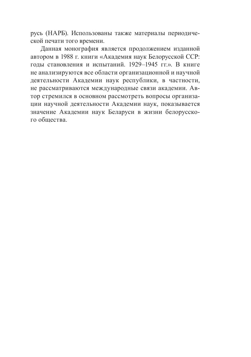 Комплексно исследуется история Академии наук Белорусской ССР за весь послевоенный советский период ее деятельности. Отражены основные изменения в научно-организационной деятельности академии, показано создание системы научных учреждений, формирование научных кадров, материальной базы науки, роль Академии наук БССР в координации научных исследований в республике, основные достижения ее ученых и их вклад в развитие экономики и культуры страны. Рассматривается участие ученых Академии наук в общественно-политической и культурной жизни Белорусской ССР. Рассчитана на ученых, преподавателей, студентов, а также всех, кто интересуется историей науки в Беларуси.
