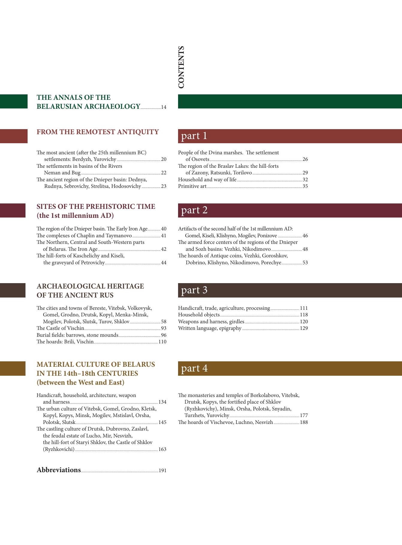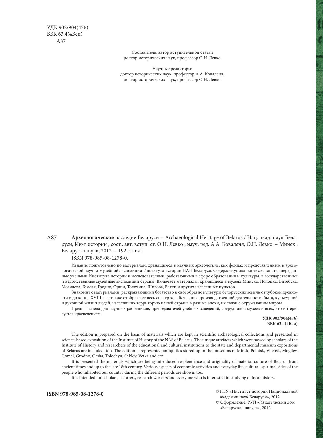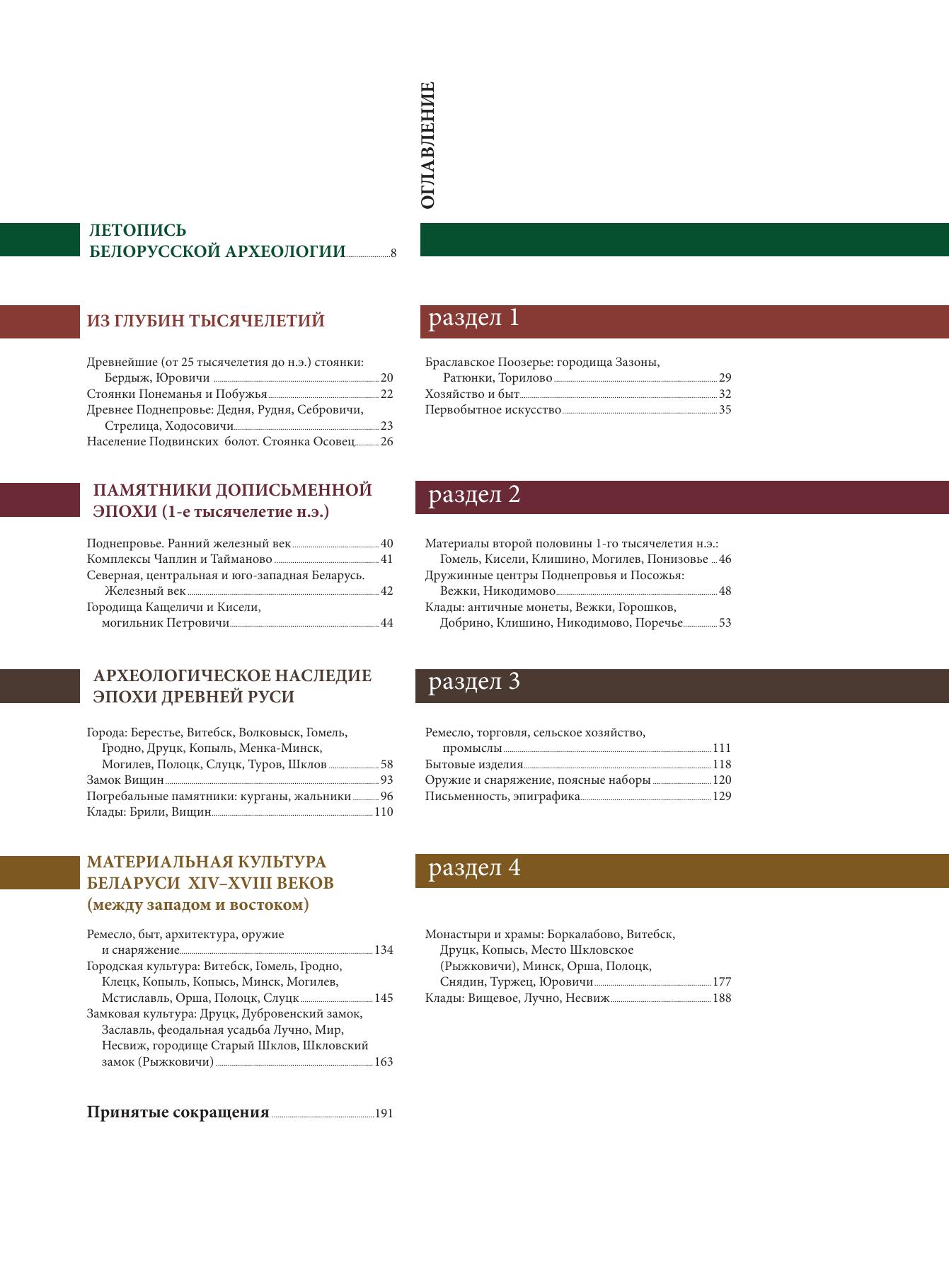 Издание подготовлено по материалам, хранящимся в научных археологических фондах и представленным в архео логической научно-музейной экспозиции Института истории НАН Беларуси. Содержит уникальные экспонаты, передан ные учеными Института истории и исследователями, работающими в сфере образования и культуры, в государственные и ведомственные музейные экспозиции страны. Включает материалы, хранящиеся в музеях Минска, Полоцка, Витебска, Могилева, Гомеля, Гродно, Орши, Толочина, Шклова, Ветки и других населенных пунктов. Знакомит с материалами, раскрывающими богатство и своеобразие культуры белорусских земель с глубокой древно сти и до конца XVIII в., а также отображает весь спектр хозяйственно-производственной деятельности, быта, культурной и духовной жизни людей, населявших территорию нашей страны в разные эпохи, их связи с окружающим миром. Предназначена для научных работников, преподавателей учебных заведений, сотрудников музеев и всех, кто интере суется краеведением.