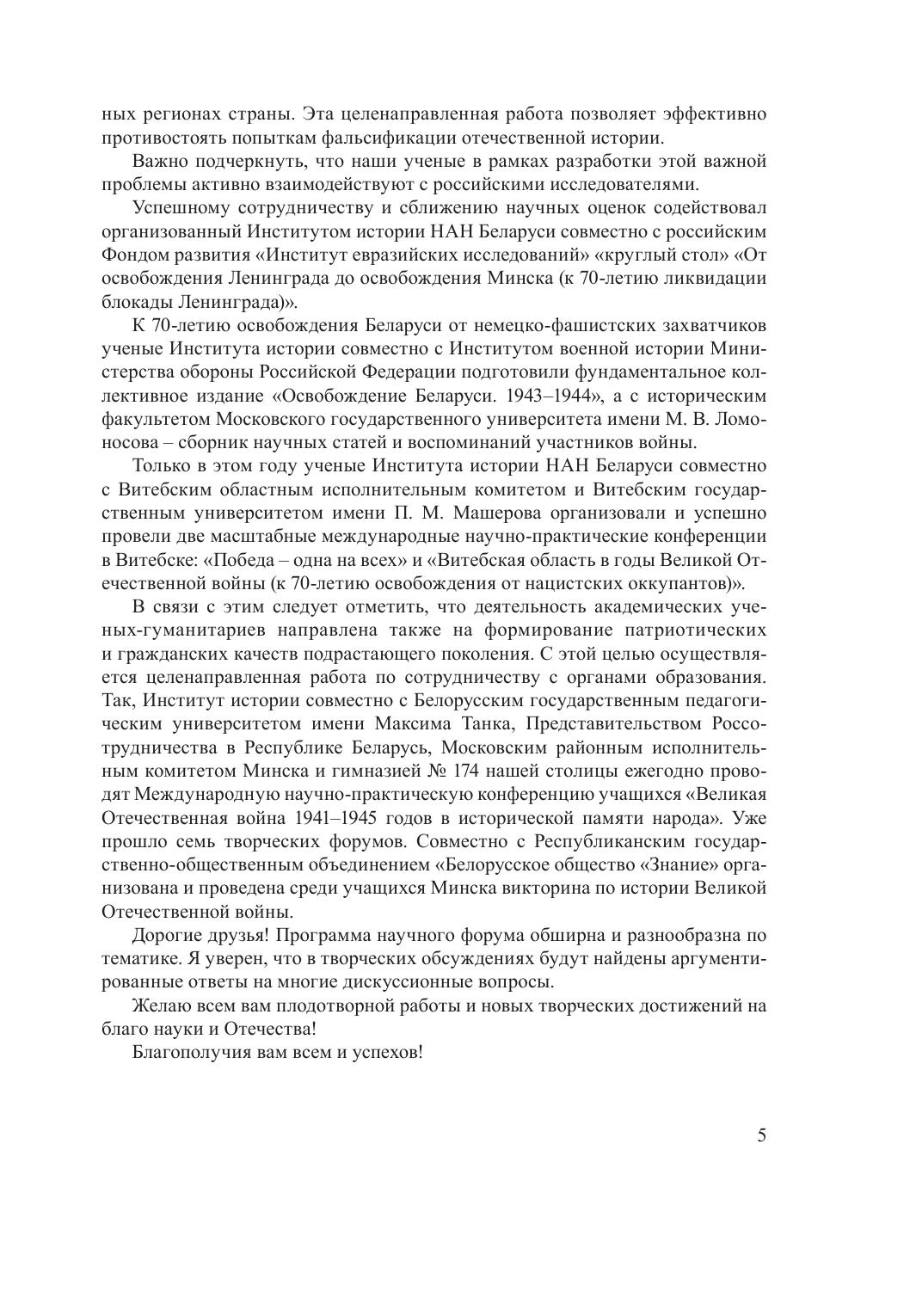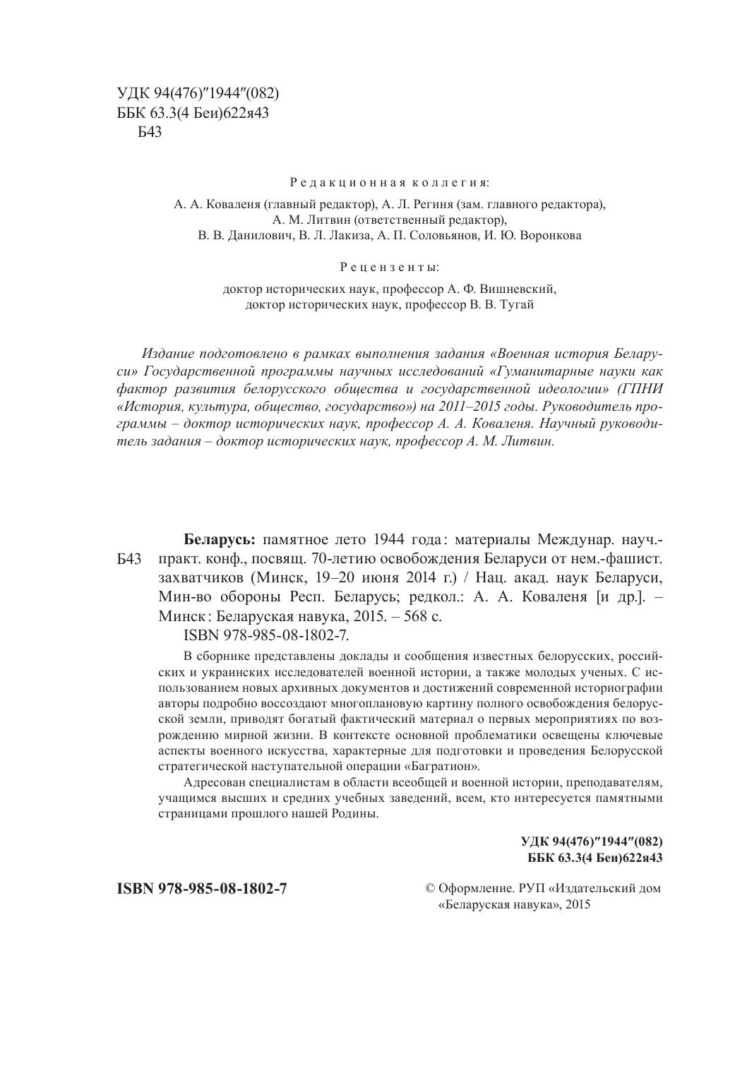 В сборнике представлены доклады и сообщения известных белорусских, российских и украинских исследователей военной истории, а также молодых ученых. С использованием новых архивных документов и достижений современной историографии авторы подробно воссоздают многоплановую картину полного освобождения белорусской земли, приводят богатый фактический материал о первых мероприятиях по возрождению мирной жизни. В контексте основной проблематики освещены ключевые аспекты военного искусства, характерные для подготовки и проведения Белорусской стратегической наступательной операции «Багратион». Адресован специалистам в области всеобщей и военной истории, преподавателям, учащимся высших и средних учебных заведений, всем, кто интересуется памятными страницами прошлого нашей Родины.