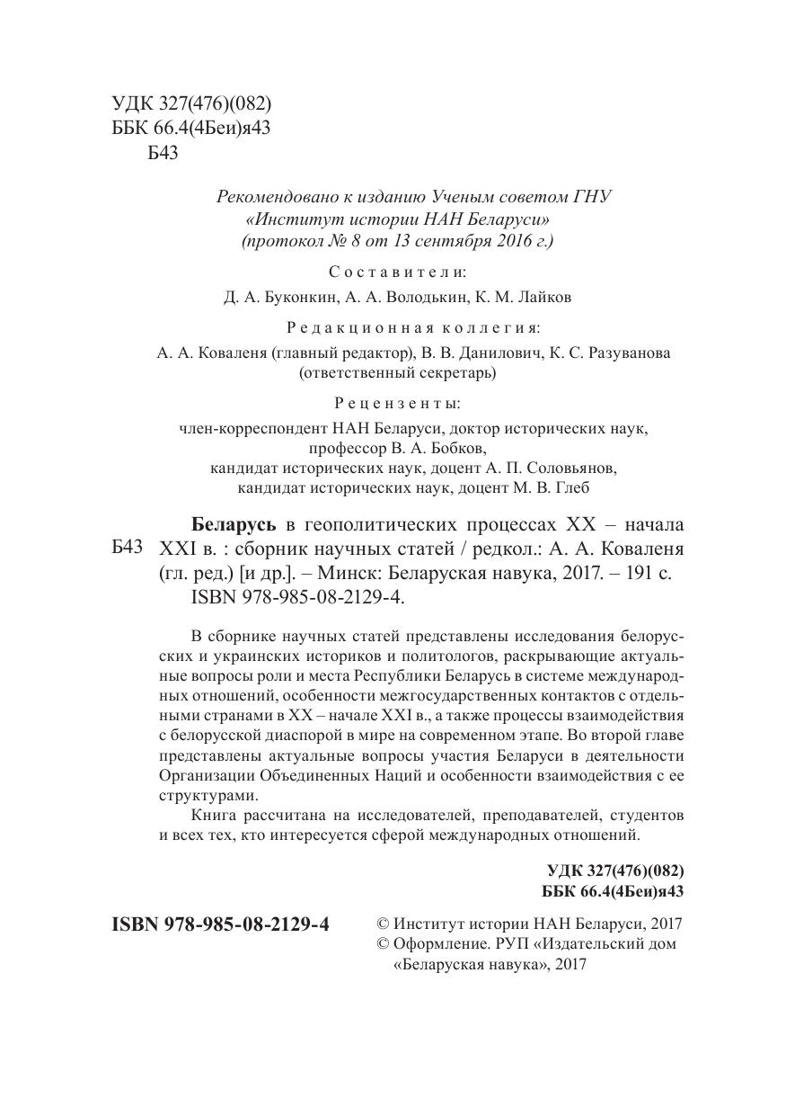 Беларусь в геополитических процессах XX – начала XXI в.: сборник научных статей