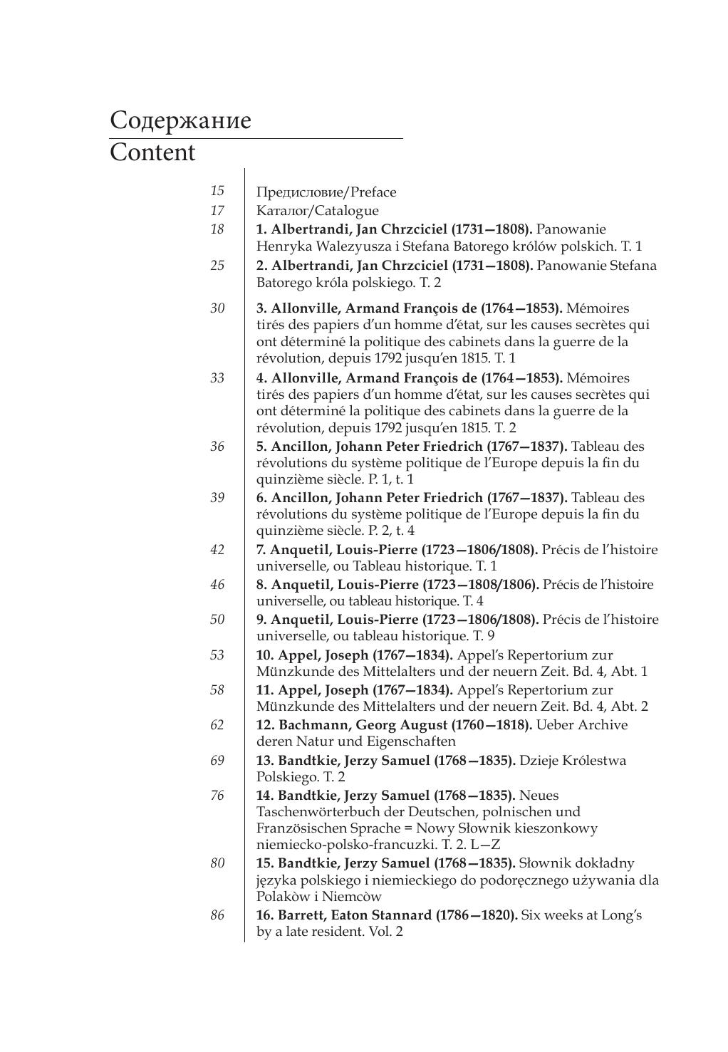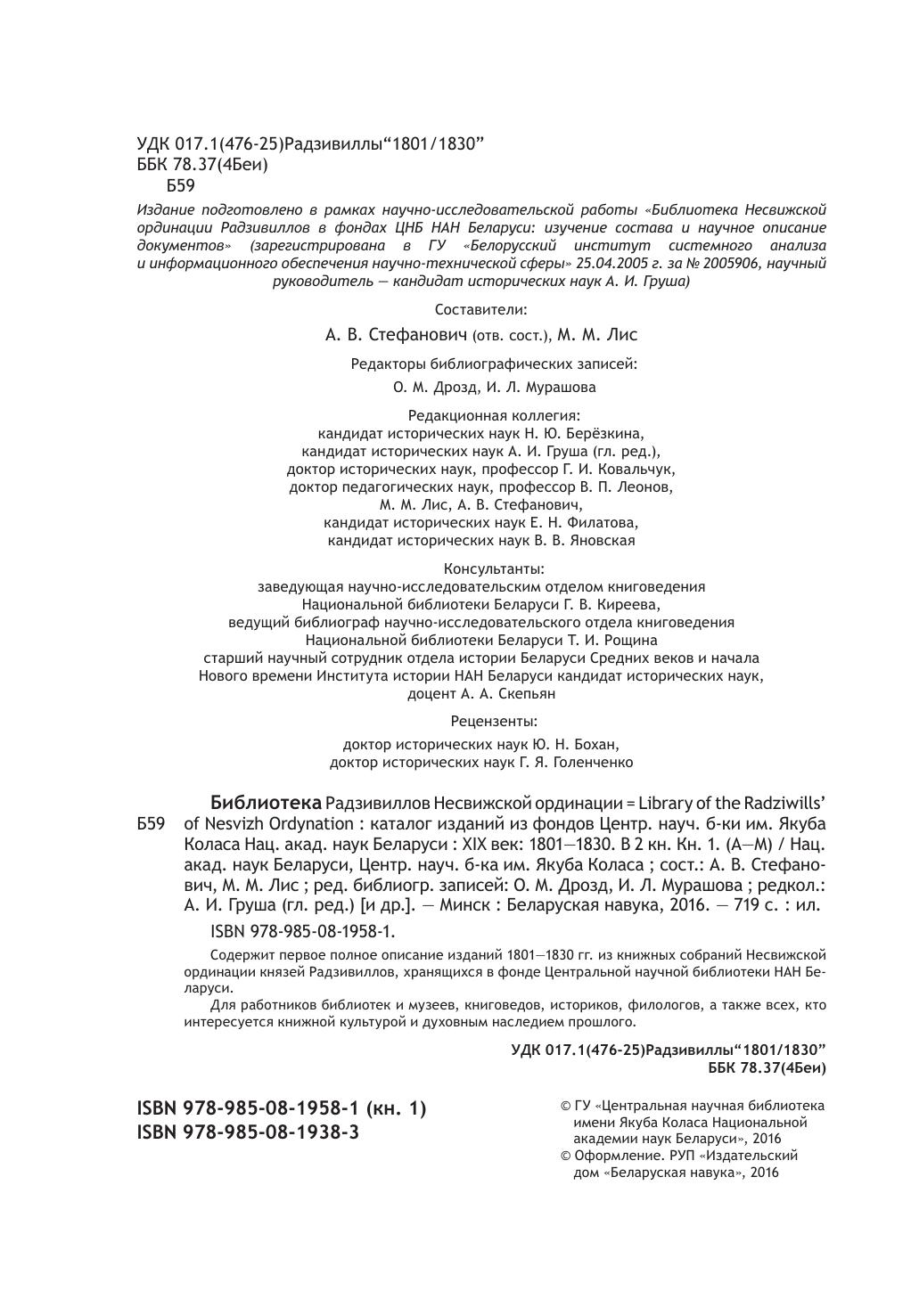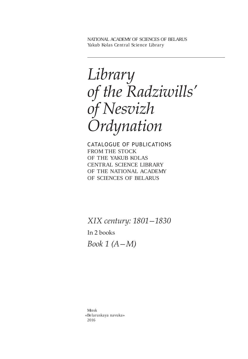 Библиотека Радзивиллов Несвижской ординации = library of the Radziwills’ of nesvizh ordynation : каталог изданий из фондов Центр. науч. б-ки им. Якуба Коласа Нац. акад. наук Беларуси: XiХ век: 1801—1830. В 2 кн. Кн. 1. (А—М)