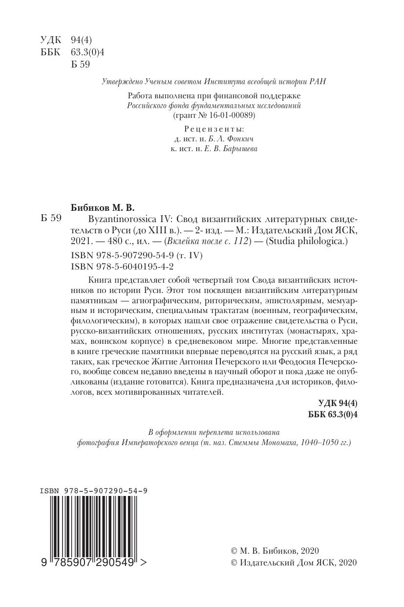 Книга представляет собой четвертый том Свода византийских источников по истории Руси. Этот том посвящен византийским литературным памятникам — агиографическим, риторическим, эпистолярным, мемуарным и историческим, специальным трактатам (военным, географическим, филологическим), в которых нашли свое отражение свидетельства о Руси, русско-византийских отношениях, русских институтах (монастырях, храмах, воинском корпусе) в средневековом мире. Многие представленные в книге греческие памятники впервые переводятся на русский язык, а ряд таких, как греческое Житие Антония Печерского или Феодосия Печерского, вообще совсем недавно введены в научный оборот и пока даже не опубликованы (издание готовится). Книга предназначена для историков, филологов, всех мотивированных читателей.