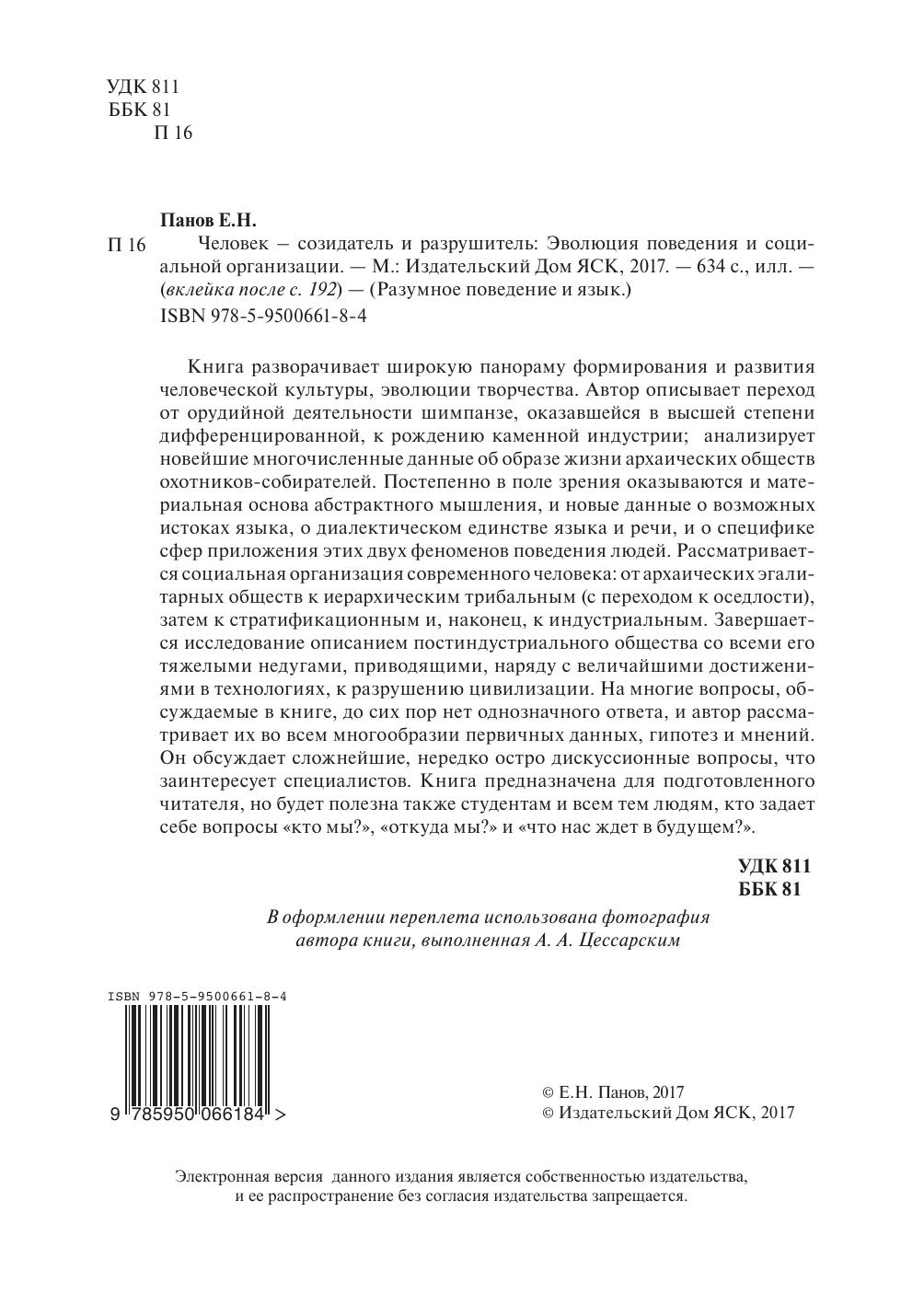 Книга разворачивает широкую панораму формирования и развития человеческой культуры, эволюции творчества. Автор описывает переход от орудийной деятельности шимпанзе, оказавшейся в высшей степени дифференцированной, к рождению каменной индустрии, анализирует новейшие многочисленные данные об образе жизни архаических обществ охотников-собирателей. Постепенно в поле зрения оказываются и материальная основа абстрактного мышления, и новые данные о возможных истоках языка, о диалектическом единстве языка и речи, и о специфике сфер приложения этих двух феноменов поведения людей. Рассматривается социальная организация современного человека: от архаических эгалитарных обществ к иерархическим трибальным (с переходом к оседлости), затем к стратификационным и, наконец, к индустриальным. Завершается исследование описанием постиндустриального общества со всеми его тяжелыми недугами, приводящими, наряду с величайшими достижениями в технологиях, к разрушению цивилизации. На многие вопросы, обсуждаемые в книге, до сих пор нет однозначного ответа, и автор рассматривает их во всем многообразии первичных данных, гипотез и мнений. Он обсуждает сложнейшие, нередко остро дискуссионные вопросы, что заинтересует специалистов. Книга предназначена для подготовленного читателя, но будет полезна также студентам и всем тем людям, кто задает себе вопросы «кто мы?», «откуда мы?» и «что нас ждет в будущем?».