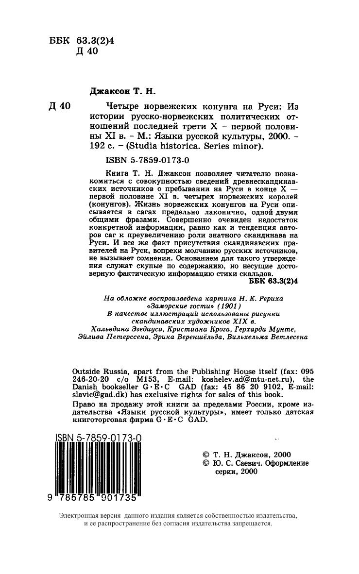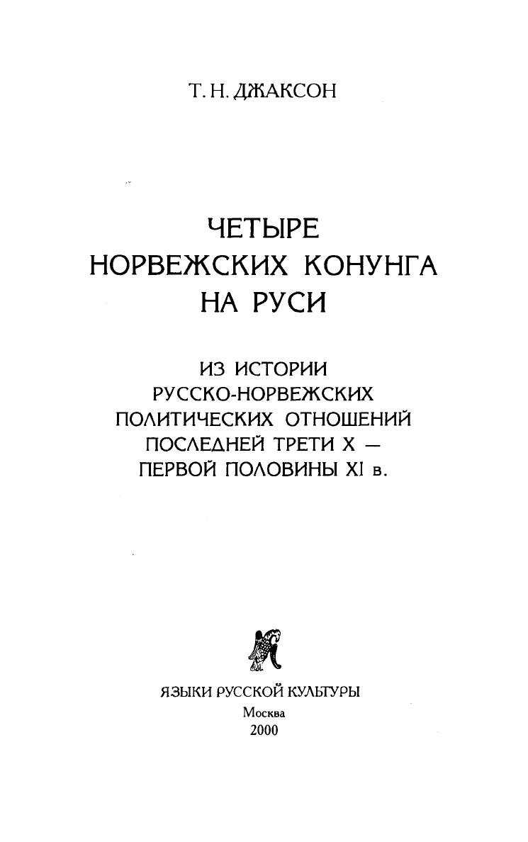 Книга Т.H. Джаксон позволяет читателю познакомиться с совокупностью сведений древнескандинавских источников о пребывании на Руси в конце X - первой половине XI в. четырех норвежских королей (конунгов). Жизнь норвежских конунгов на Руси описывается в сагах предельно лаконично, одной-двумя общими фразами. Совершенно очевиден недостаток конкретной информации, равно как и тенденция авторов саг к преувеличению роли знатного скандинава на Руси. И все же факт присутствия скандинавских правителей на Руси, вопреки молчанию русских источников, не вызывает сомнения. Основанием для такого утверждения служат скупые по содержанию, но несущие достоверную фактическую информацию стихи скальдов.
