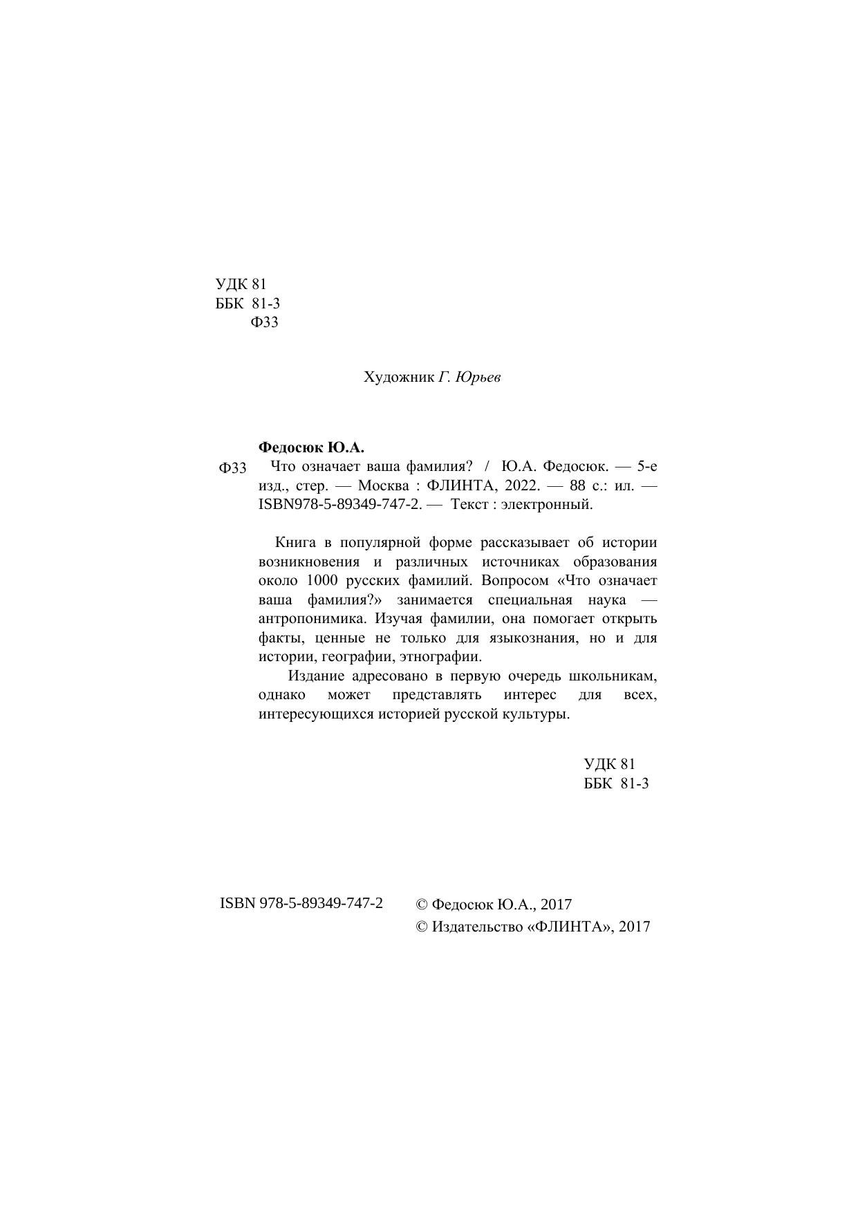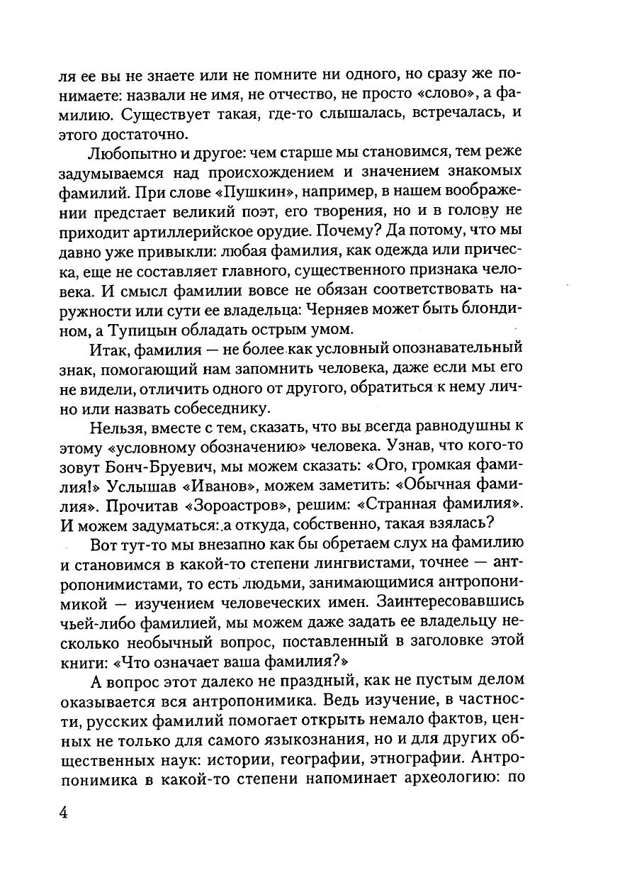 Книга в популярной форме рассказывает об истории возникновения и различных источниках образования около 1000 русских фамилий. Вопросом «Что означает ваша фамилия?» занимается специальная наука — антропонимика. Изучая фамилиии, она помогает открыть факты, ценные не только для языкознания, но и для истории, географии, этнографии.