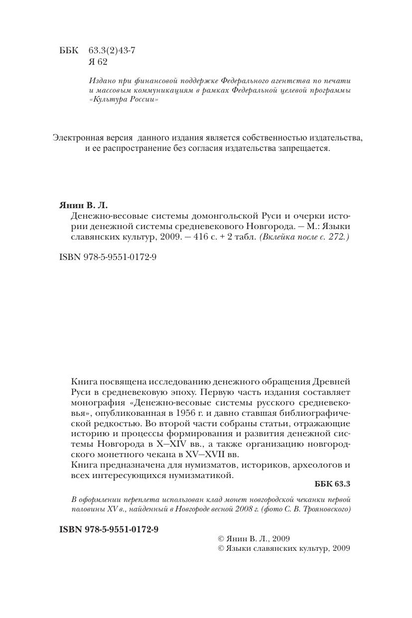 Книга посвящена исследованию денежного обращения Древней Руси в средневековую эпоху. Первую часть издания составляет монография «Денежно-весовые системы русского средневековья», опубликованная в 1956љг. иљдавно ставшая библиографической редкостью. Во второй части собраны статьи, отражающие историю и процессы формирования и развития денежной системы Новгорода в X XIVљвв., а также организацию новгородского монетного чекана в XV XVIIљвв. Книга предназначена для нумизматов, историков, археологов и всех интересующихся нумизматикой.