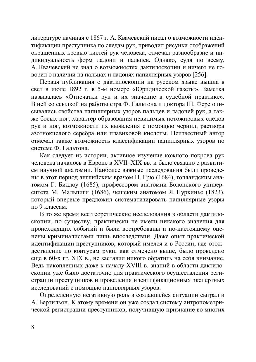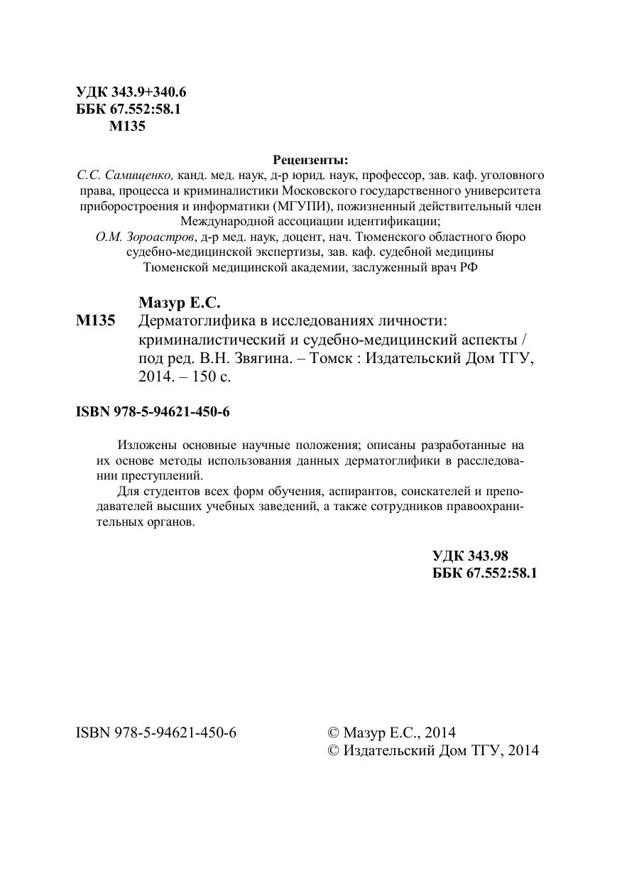 Изложены основные научные положения, описаны разработанные на их основе методы использования данных дерматоглифики в расследовании преступлений. Для студентов всех форм обучения, аспирантов, соискателей и преподавателей высших учебных заведений, а также сотрудников правоохранительных органов.