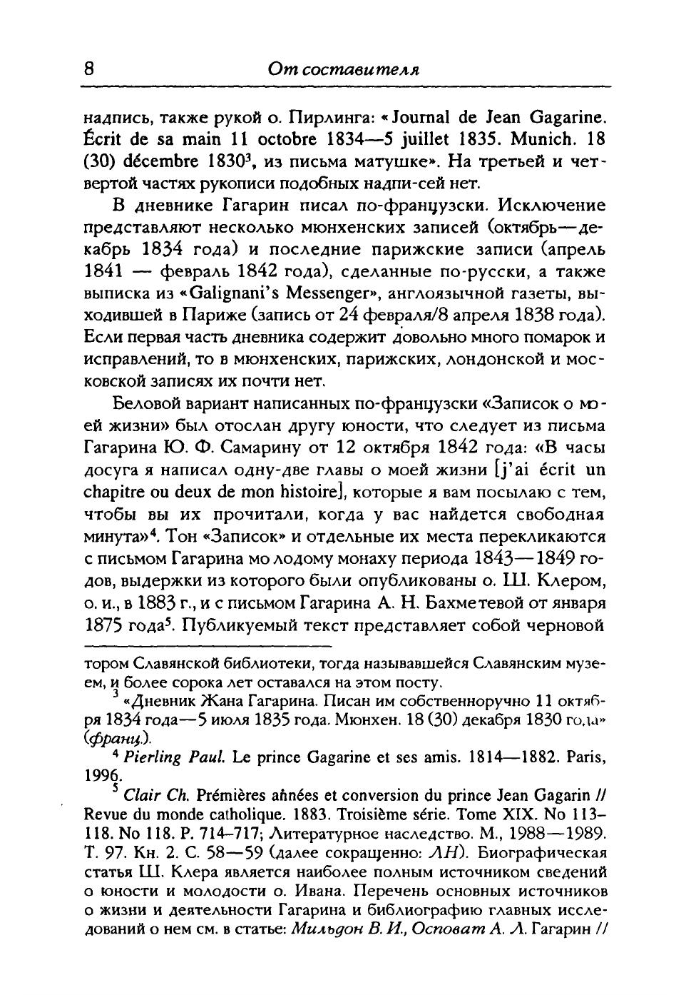 Автографы дневника И.С.Гагарина и его автобиографических "Записок о моей жизни" хранятся в архиве основанной им Парижской Славянской Библиотеки в Медоне (под Парижем). Дневник охватывает 8 лет жизни молодого князя Ивана Гагарина, в течение которых блестящий русский аристократ перевоплотился во французского священника-иезуита Жана-Ксавьера. Отрекшись от титула, родового состояния, общественного положения, навсегда отказавшись жить с родными и близкими, 40 лет проведет он изгнанником в Италии, Сирии и Франции. На чужбине Иван Гагарин посвятил себя грандиозной миссии - примирению и объединению Восточной Церкви с Церковью Западной. В середине 50-х годов он поселился в Париже и стал центром круга, состоявшего из его соотечественников. В архиве вышеупомянутой библиотеки хранятся письма к нему А.И.Герцена, Ф.И.Тютчева, П.Я.Чаадаева, Н.С.Лескова, И.С.Аксакова и других выдающихся людей того времени. Для научных работников, широкого круга специалистов.