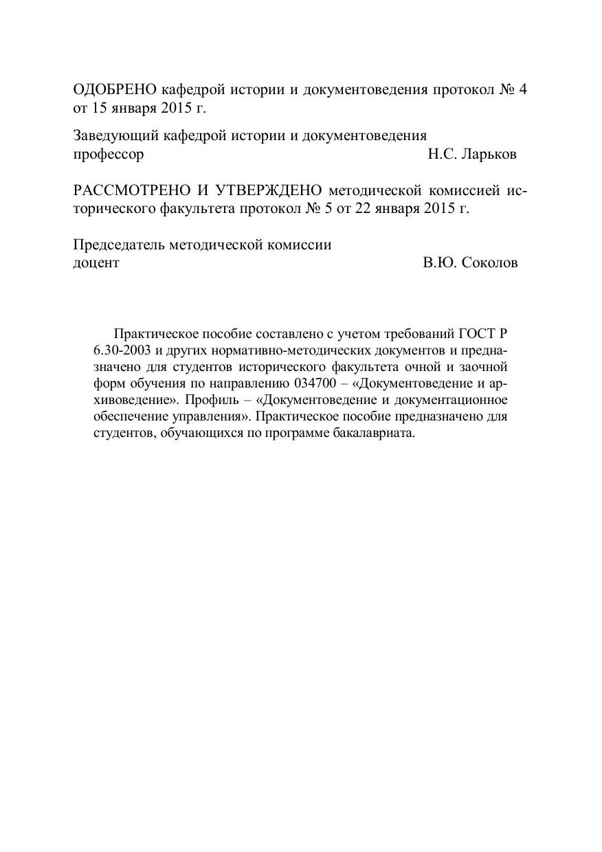 Практическое пособие составлено с учетом требований ГОСТ Р 6.30-2003 и других нормативно-методических документов и предназначено для студентов исторического факультета очной и заочной форм обучения по направлению 034700 – Документоведение и архивоведение». Профиль – «Документоведение и документационное обеспечение управления». Практическое пособие предназначено для студентов, обучающихся по программе бакалавриата