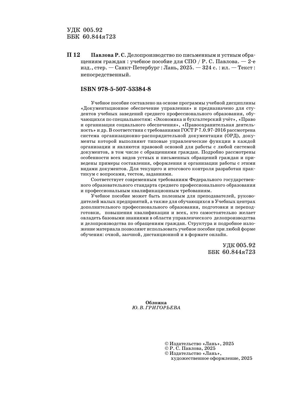 Учебное пособие составлено на основе программы учебной дисциплины «Документационное обеспечение управления» и предназначено для студентов учебных заведений среднего профессионального образования, обучающихся по специальностям: «Экономика и бухгалтерский учёт», «Право и организация социального обеспечения», «Правоохранительная деятельность» и др. В соответствии с требованиями ГОСТ Р 7.0.972016 рассмотрена система организационно-распорядительной документации (ОРД), документы которой выполняют типовые управленческие функции в каждой организации и являются правовой основой для работы с любой системой документов, в том числе с обращениями граждан. Подробно рассмотрены особенности всех видов устных и письменных обращений граждан и приведены примеры составления, оформления и организации работы с этими видами документов. Для текущего и итогового контроля разработан практикум с вопросами, тестом, заданиями. Соответствует современным требованиям Федерального государственного образовательного стандарта среднего профессионального образования и профессиональным квалификационным требованиям. Учебное пособие может быть полезным для преподавателей, руководителей малых предприятий, а также для обучающихся в Учебных центрах дополнительного профессионального образования, подготовки и переподготовки, повышения квалификации и всех, кто самостоятельно желает овладеть базовыми знаниями в области управленческого делопроизводства и делопроизводства по обращениям граждан. Структура и подробное изложение материала позволяют использовать учебное пособие при любой форме обучения: очной, заочной, дистанционной и в формате онлайн.