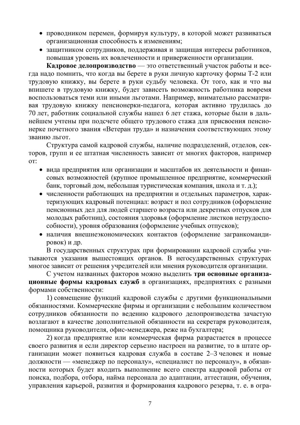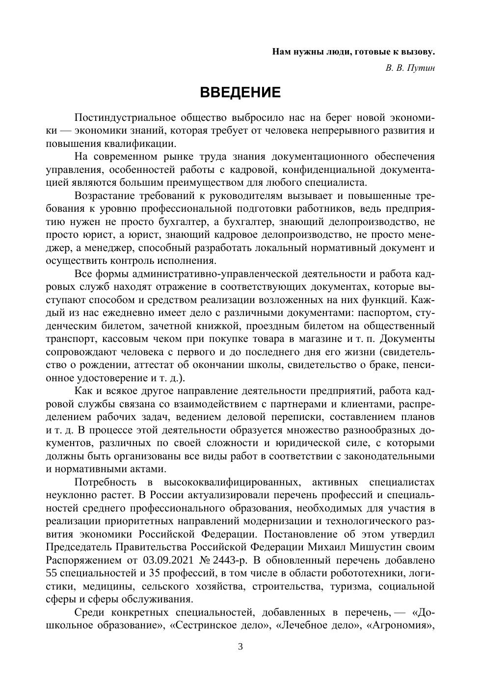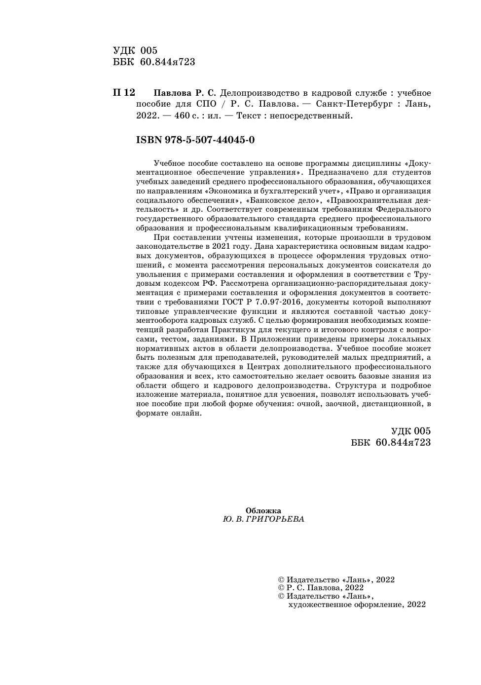 Учебное пособие составлено на основе программы дисциплины «Документационное обеспечение управления». Предназначено для студентов учебных заведений среднего профессионального образования, обучающихся по направлениям «Экономика и бухгалтерский учет», «Право и организация социального обеспечения», «Банковское дело», «Правоохранительная деятельность» и др. Соответствует современным требованиям Федерального государственного образовательного стандарта среднего профессионального образования и профессиональным квалификационным требованиям. При составлении учтены изменения, которые произошли в трудовом законодательстве в 2021 году. Дана характеристика основным видам кадровых документов, образующихся в процессе оформления трудовых отношений, с момента рассмотрения персональных документов соискателя до увольнения с примерами составления и оформления в соответствии с Трудовым кодексом РФ. Рассмотрена организационно-распорядительная документация с примерами составления и оформления документов в соответствии с требованиями ГОСТ Р 7.0.972016, документы которой выполняют типовые управленческие функции и являются составной частью документооборота кадровых служб. С целью формирования необходимых компетенций разработан Практикум для текущего и итогового контроля с вопросами, тестом, заданиями. В Приложении приведены примеры локальных нормативных актов в области делопроизводства. Учебное пособие может быть полезным для преподавателей, руководителей малых предприятий, а также для обучающихся в Центрах дополнительного профессионального образования и всех, кто самостоятельно желает освоить базовые знания из области общего и кадрового делопроизводства. Структура и подробное изложение материала, понятное для усвоения, позволят использовать учебное пособие при любой форме обучения: очной, заочной, дистанционной, в формате онлайн.
