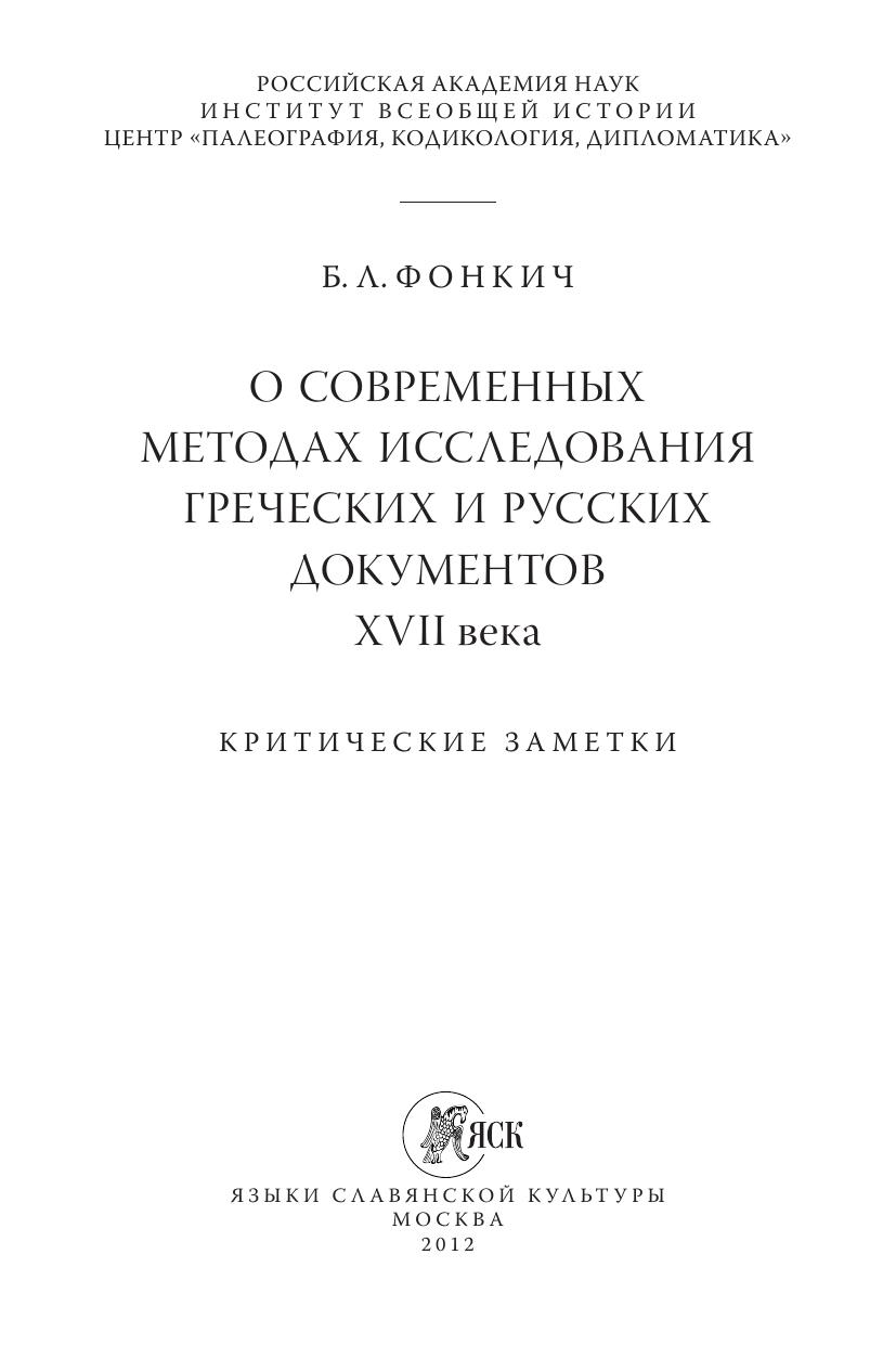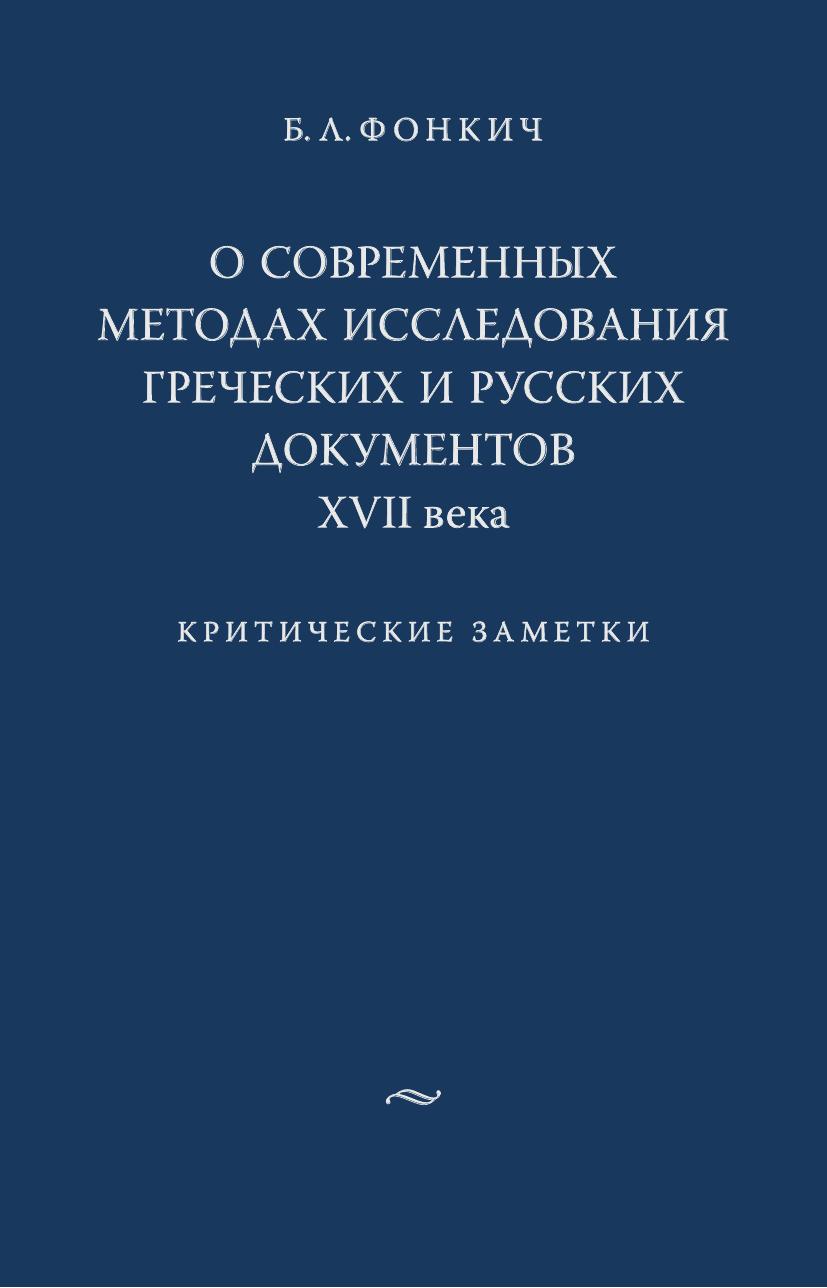 Работа Б.Л. Фонкича посвящена критике некоторых появившихся в последние годы исследований греческих и русских документов XVII в., представляющих собой важнейшие источники по истории греческо-русских связей указанного времени. Эти исследования принадлежат В.Г.Ченцовой и Л.А.Тимошиной, поставившим перед собой задачу пересмотра результатов изучения отношений России и Христианского Востока, полученных русской наукой двух последних столетий. Работы этих авторов основаны прежде всего на палеографическом анализе греческих и (отчасти) русских документов преимущественно московских хранилищ, а также на новом изучении русских документальных материалов по истории просвещения России в XVII в.