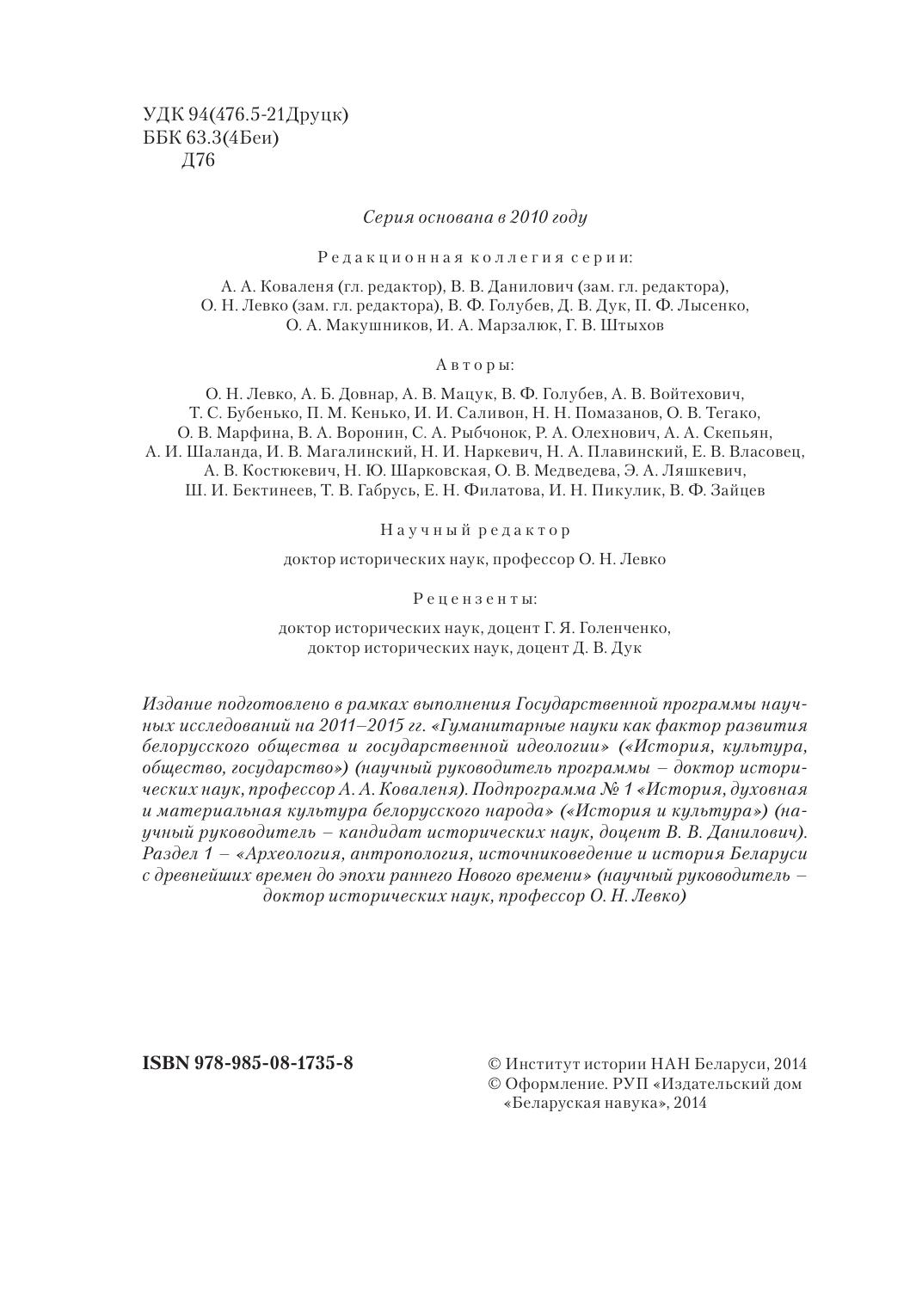 Издание подготовлено в рамках выполнения Государственной программы научных исследований на 2011–2015 гг. «Гуманитарные науки как фактор развития белорусского общества и государственной идеологии» («История, культура, общество, государство») (научный руководитель программы – доктор исторических наук, профессор А. А. Коваленя). Подпрограмма № 1 «История, духовная и материальная культура белорусского народа» («История и культура») (научный руководитель – кандидат исторических наук, доцент В. В. Данилович). Раздел 1 – «Археология, антропология, источниковедение и история Беларуси с древнейших времен до эпохи раннего Нового времени» (научный руководитель – доктор исторических наук, профессор О. Н. Левко)