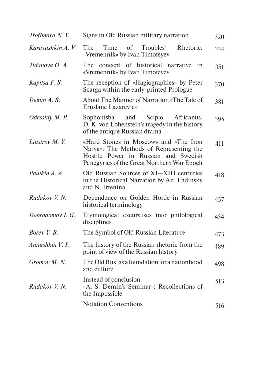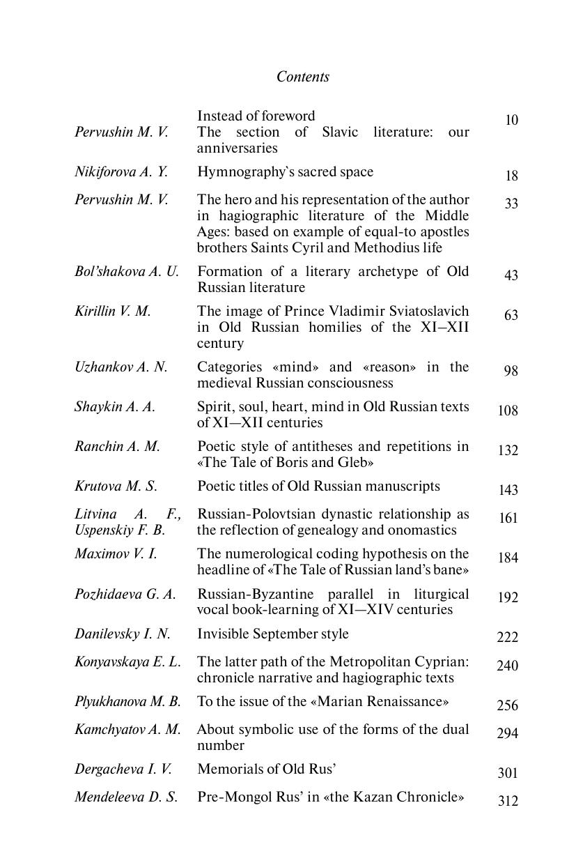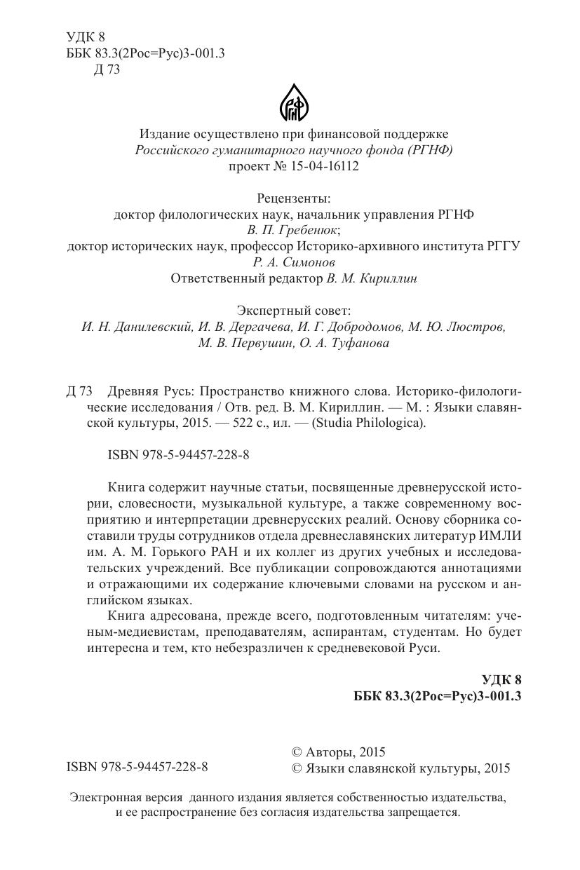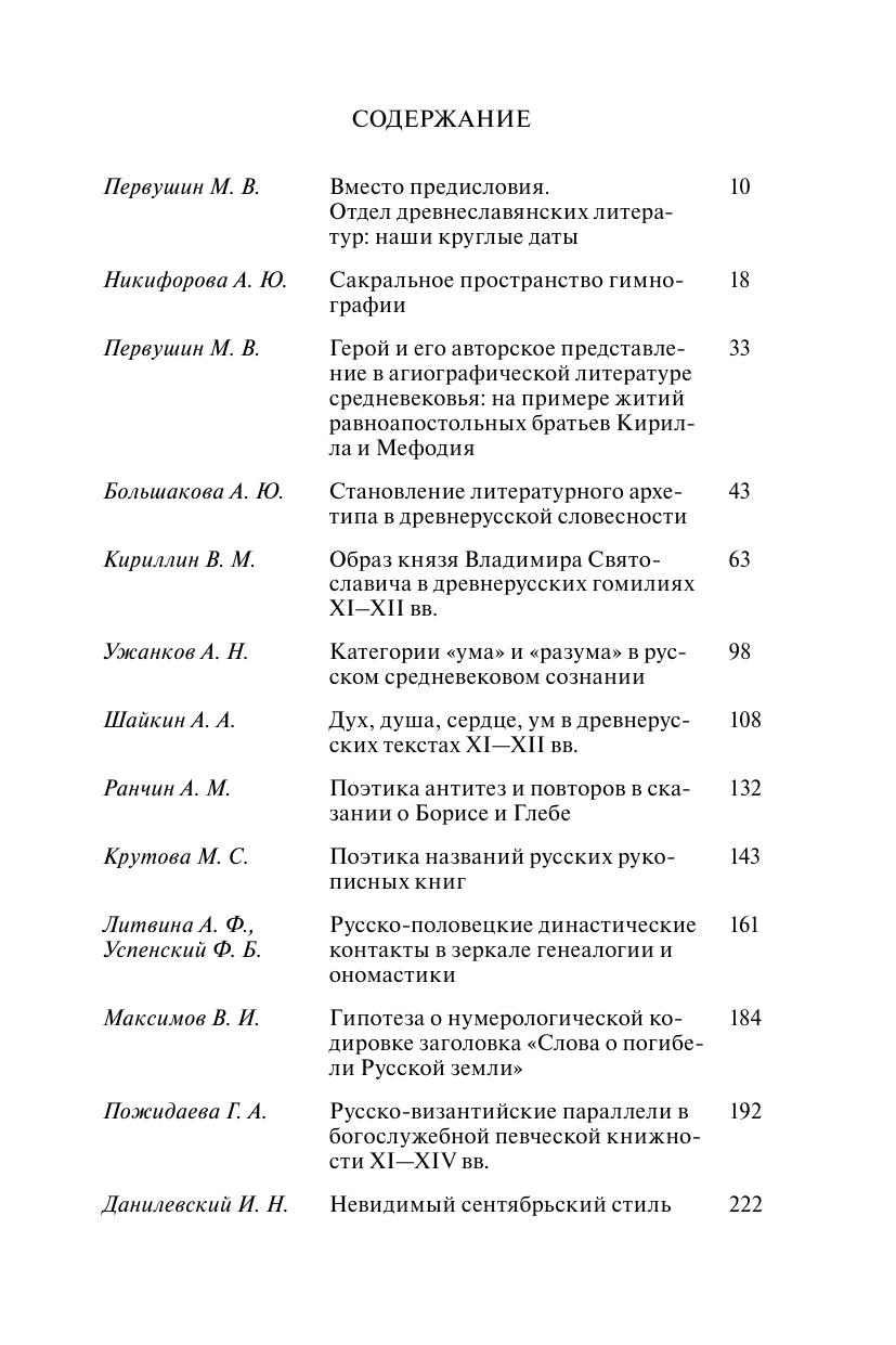 Книга содержит научные статьи, посвященные древнерусской истории, словесности, музыкальной культуре, а также современному восприятию и интерпретации древнерусских реалий. Основу сборника составили труды сотрудников отдела древнеславянских литератур ИМЛИ им. А.М. Горького РАН и их коллег из других учебных и исследовательских учреждений. Все публикации сопровождаются аннотациями и отражающими их содержание ключевыми словами на русском и английском языках. Книга адресована, прежде всего, подготовленным читателям: ученым-медиевистам, преподавателям, аспирантам, студентам. Но будет интересна и тем, кто небезразличен к средневековой Руси.