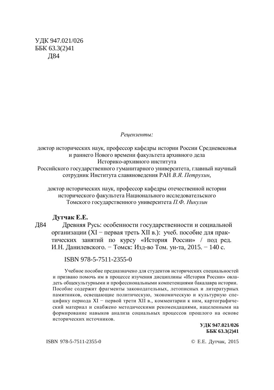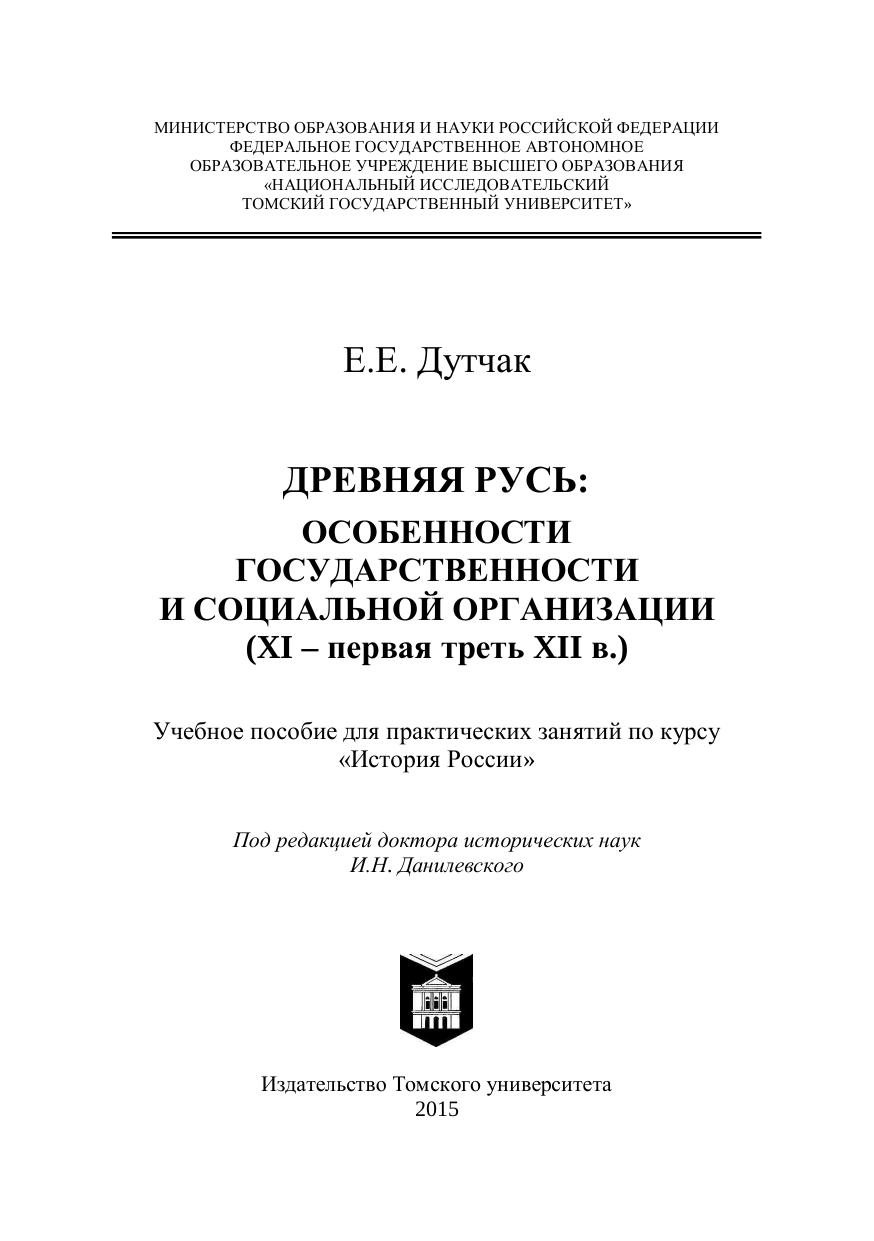 Учебное пособие предназначено для студентов исторических специальностей и призвано помочь им в процессе изучения дисциплины «История России» овладеть общекультурными и профессиональными компетенциями бакалавра истории. Пособие содержит фрагменты законодательных, летописных и литературных памятников, освещающие политическую, экономическую и культурную специфику периода XI - первой трети XII в., комментарии к ним, картографический материал и снабжено методическими рекомендациями, нацеленными на формирование навыков анализа социальных процессов прошлого на основе исторических источников.