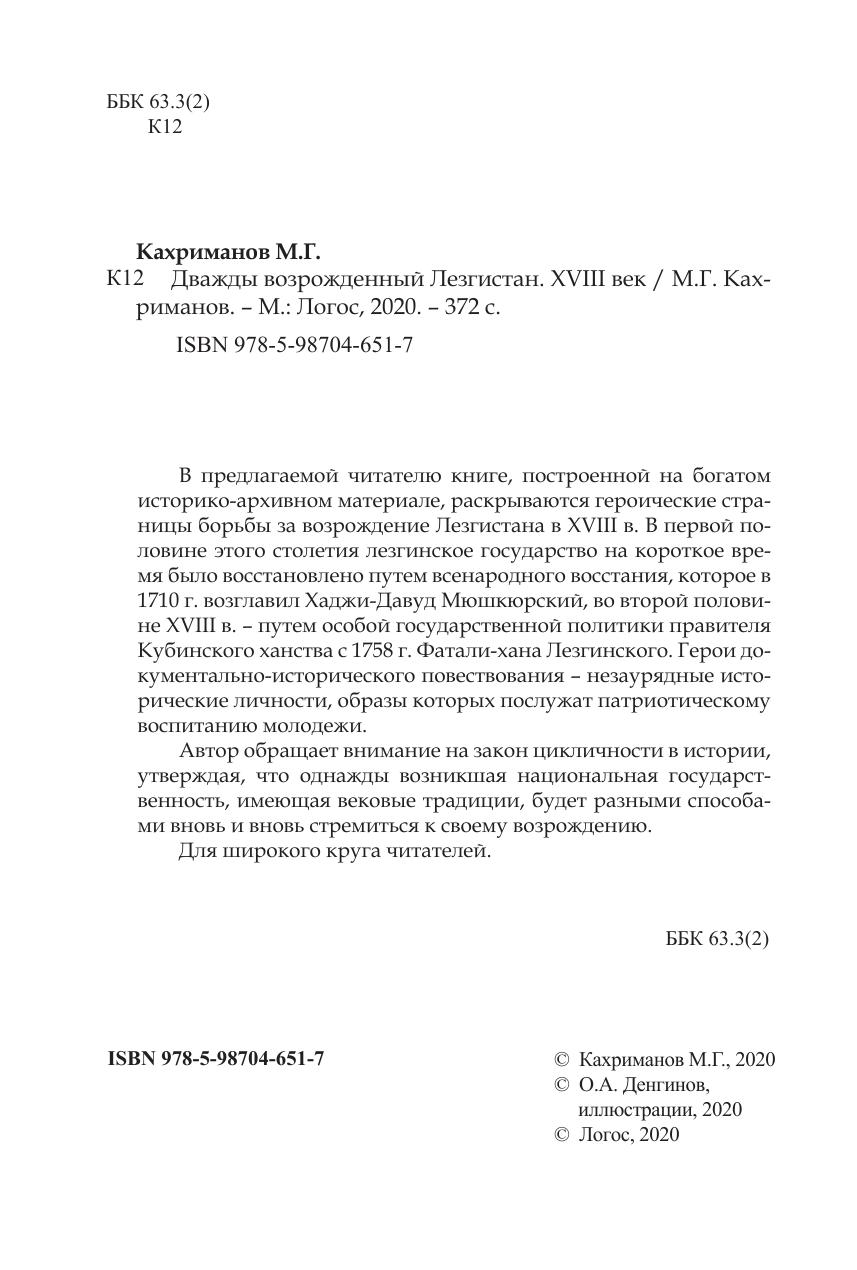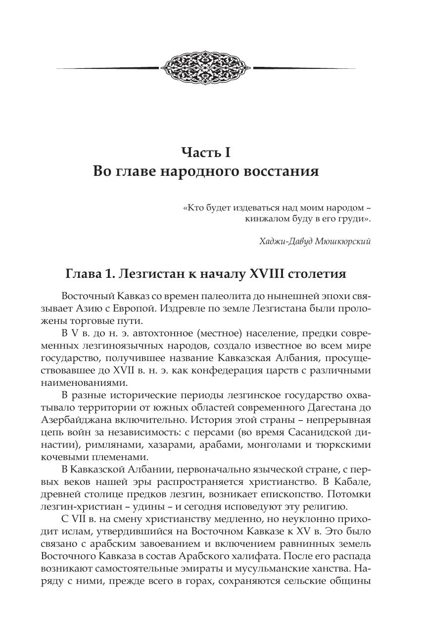 В предлагаемой читателю книге, построенной на богатом историко-архивном материале, раскрываются героические страницы борьбы за возрождение Лезгистана в XVIII в. В первой половине этого столетия лезгинское государство на короткое время было восстановлено путем всенародного восстания, которое в 1710 г. возглавил Хаджи-Давуд Мюшкюрский, во второй половине XVIII в. – путем особой государственной политики правителя Кубинского ханства с 1758 г. Фатали-хана Лезгинского. Герои документально-исторического повествования – незаурядные исторические личности, образы которых послужат патриотическому воспитанию молодежи. Автор обращает внимание на закон цикличности в истории, утверждая, что однажды возникшая национальная государственность, имеющая вековые традиции, будет разными способами вновь и вновь стремиться к своему возрождению. Для широкого круга читателей.