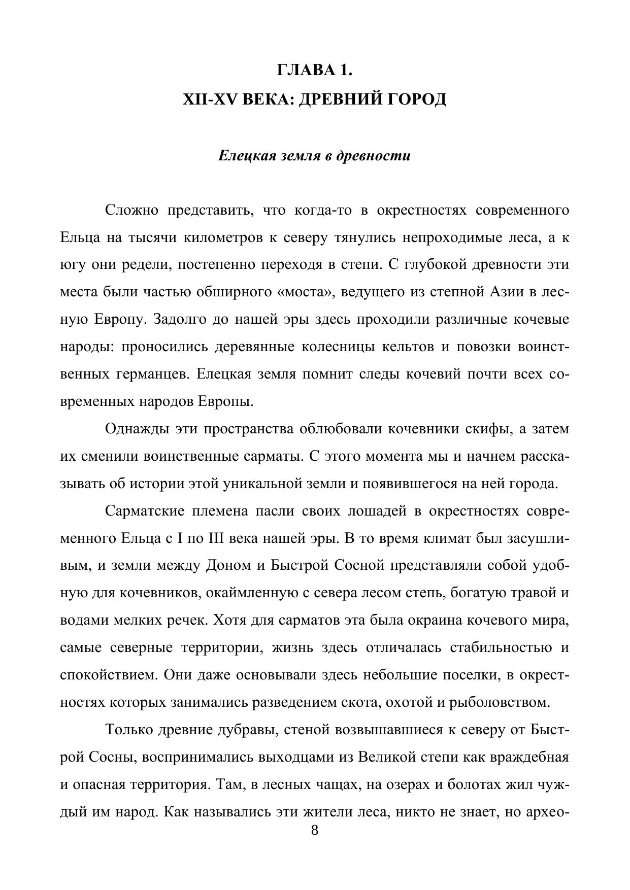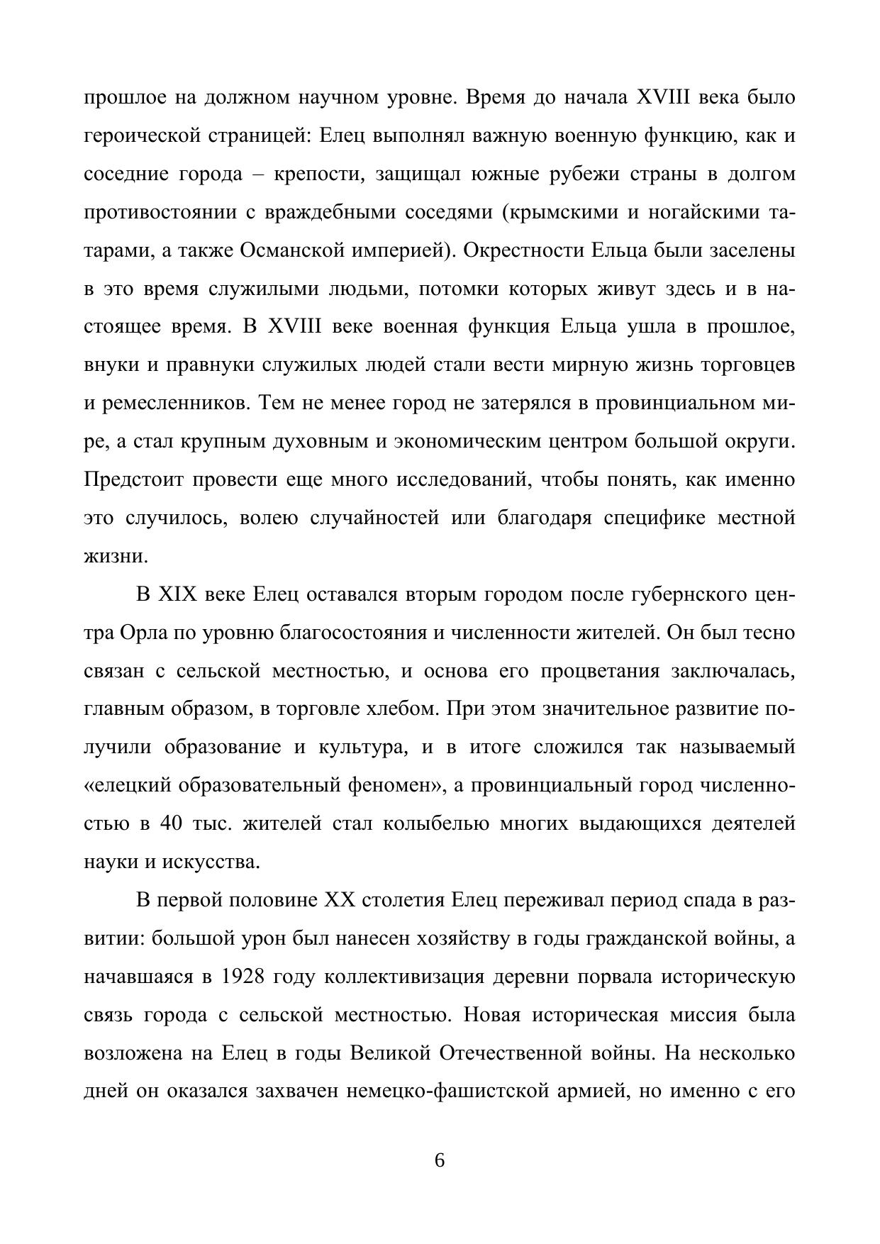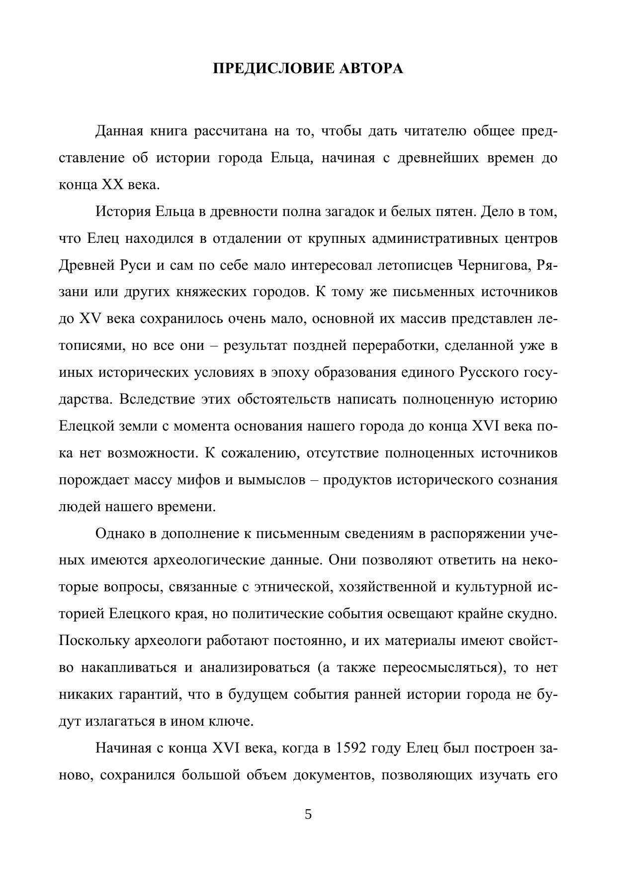 Историко-краеведческое издание «Елец: страницы истории» адресовано широкому кругу читателей, которые желают знать историю города Ельца с древнейших времен до конца XX века. Книга написана в научно-популярной форме на основе новейших предста- влений исторической науки о прошлом города.