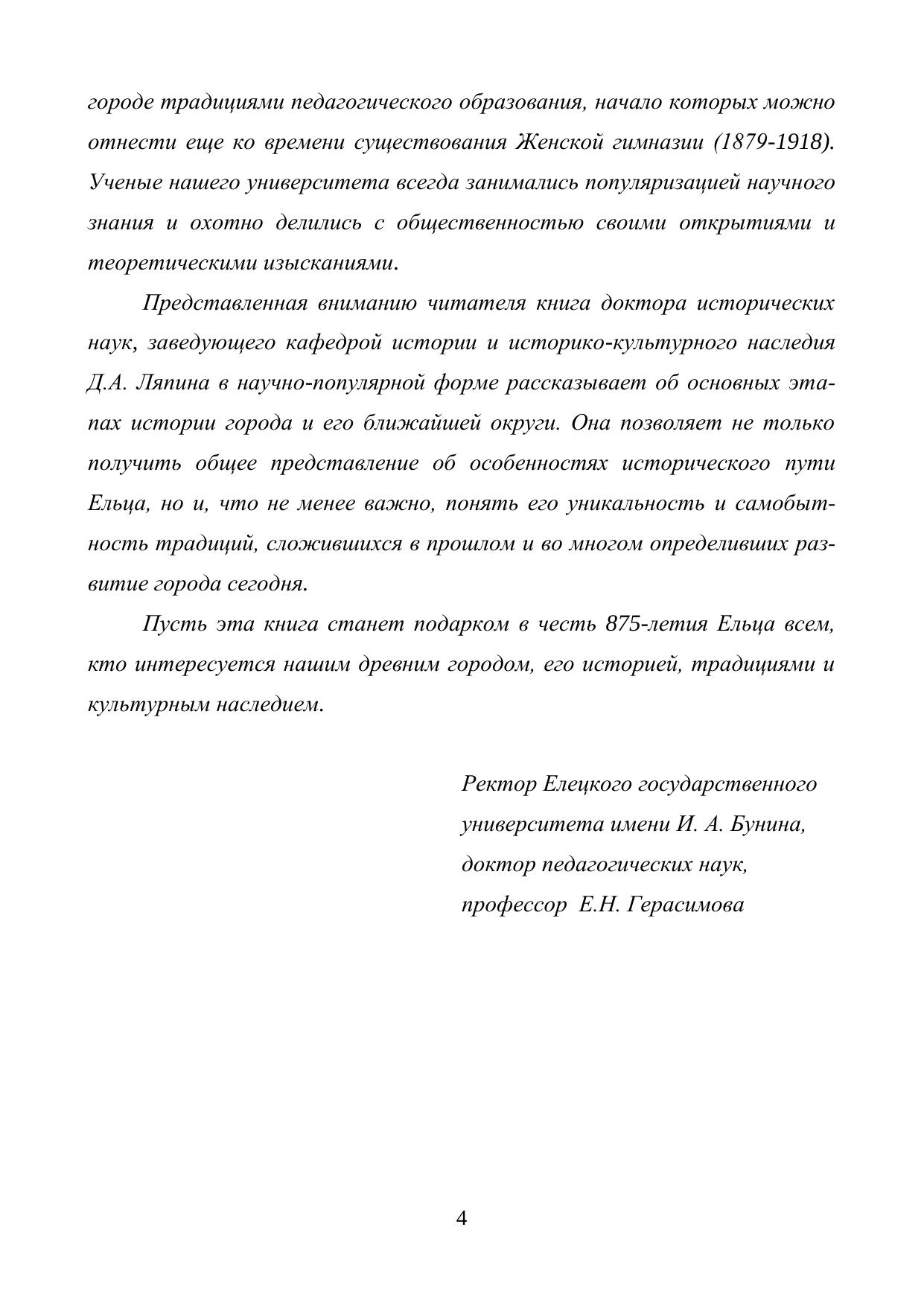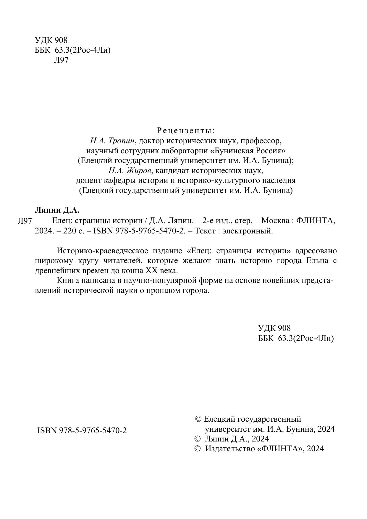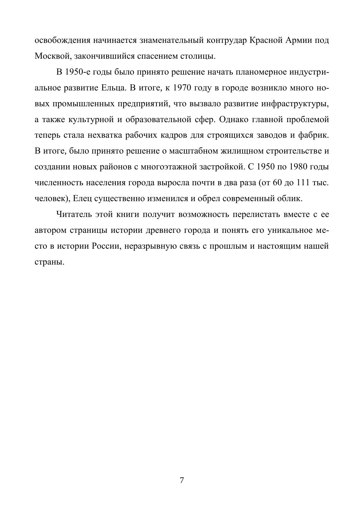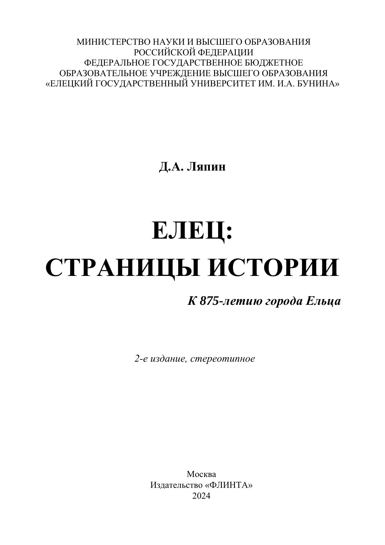 Историко-краеведческое издание «Елец: страницы истории» адресовано широкому кругу читателей, которые желают знать историю города Ельца с древнейших времен до конца XX века. Книга написана в научно-популярной форме на основе новейших предста- влений исторической науки о прошлом города.