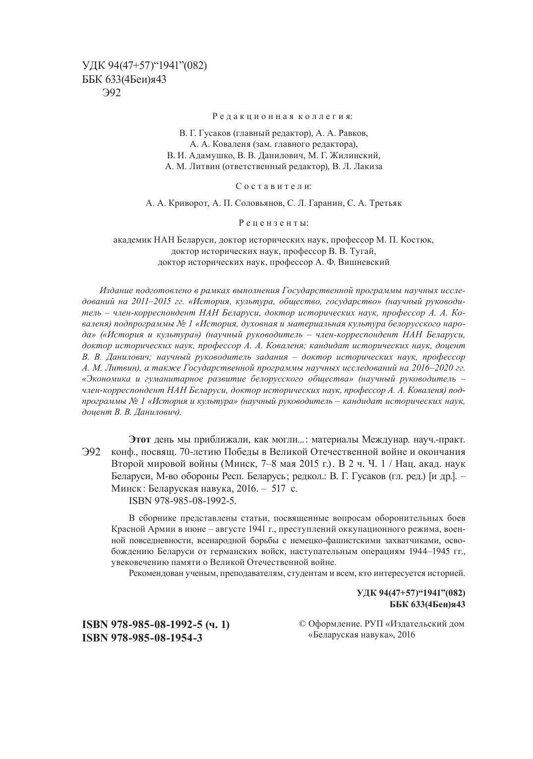 Этот день мы приближали, как могли... : материалы Междунар. науч.-практ. конф., посвящ. 70-летию Победы в Великой Отечественной войне и окончания Второй мировой войны (Минск, 7–8 мая 2015 г.) . В 2 ч. Ч. 1