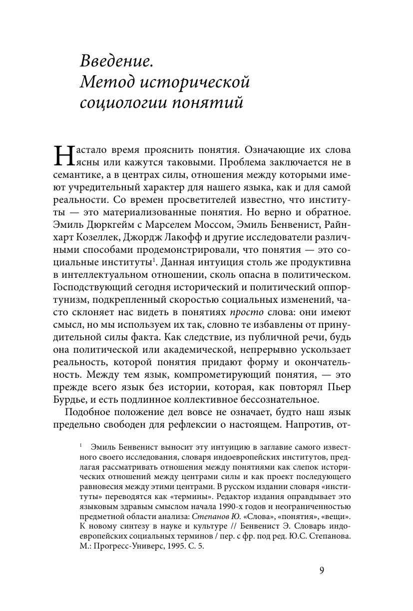 Книга социолога Александра Бикбова — это результат многолетнего изучения автором российского и советского общества, а также фундаментальное введение в историческую социологию понятий. Анализ масштабных социальных изменений соединяется здесь с детальным исследованием связей между понятиями из публичного словаря разных периодов. Автор проясняет устройство российского общества последних 20 лет, социальные взаимодействия и борьбу, которые разворачиваются вокруг понятий «средний класс», «демократия», «российская наука», «русская нация». Читатель также получает возможность ознакомиться с революционным научным подходом к изучению советского периода, воссоздающим неочевидные обстоятельства социальной и политической истории понятий «научно-технический прогресс», «всесторонне развитая личность», «социалистический гуманизм», «социальная проблема». Редкое в российских исследованиях внимание уделено роли академической экспертизы в придании смысла политическому режиму. Исследование охватывает время от эпохи общественного подъема последней трети XIX в. до митингов протеста, начавшихся в 2011 г. Раскрытие сходств и различий в российской и европейской (прежде всего французской) социальной истории придает исследованию особую иллюстративность и глубину. Книгу отличают теоретическая новизна, нетривиальные исследовательские приемы, ясность изложения и блестящая систематизация автором обширного фактического материала. Она встретит несомненный интерес у социологов и историков России и СССР, социальных лингвистов, философов, студентов и аспирантов, изучающих российское общество, а также у широкого круга образованных и критически мыслящих читателей