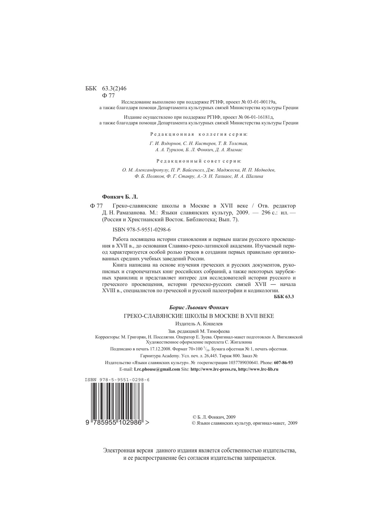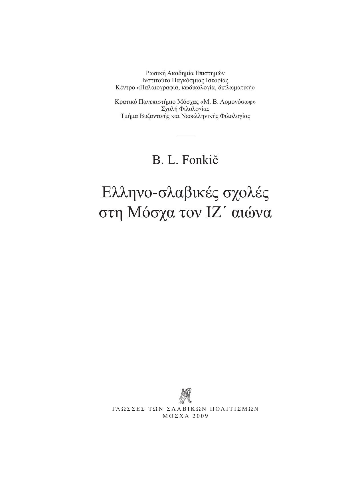 Работа посвящена истории становления и первым шагам русского просвещения в XVII в., до основания Славяно-греко-латинской академии. Изучаемый период характеризуется особой ролью греков в создании первых правильно организованных средних учебных заведений России. Книга написана на основе изучения греческих и русских документов, рукописных и старопечатных книг российских собраний, а также некоторых зарубежных хранилищ. Представляет интерес для исследователей истории русского и греческого просвещения, истории греческо-русских связей XVII - начала XVIII в., специалистов по греческой и русской палеографии и кодикологии.