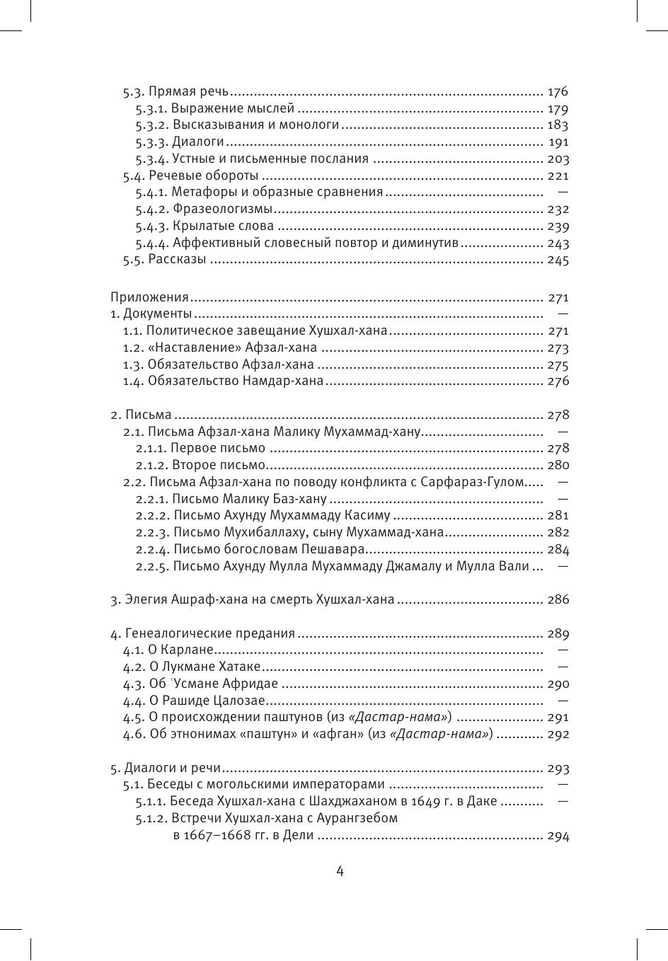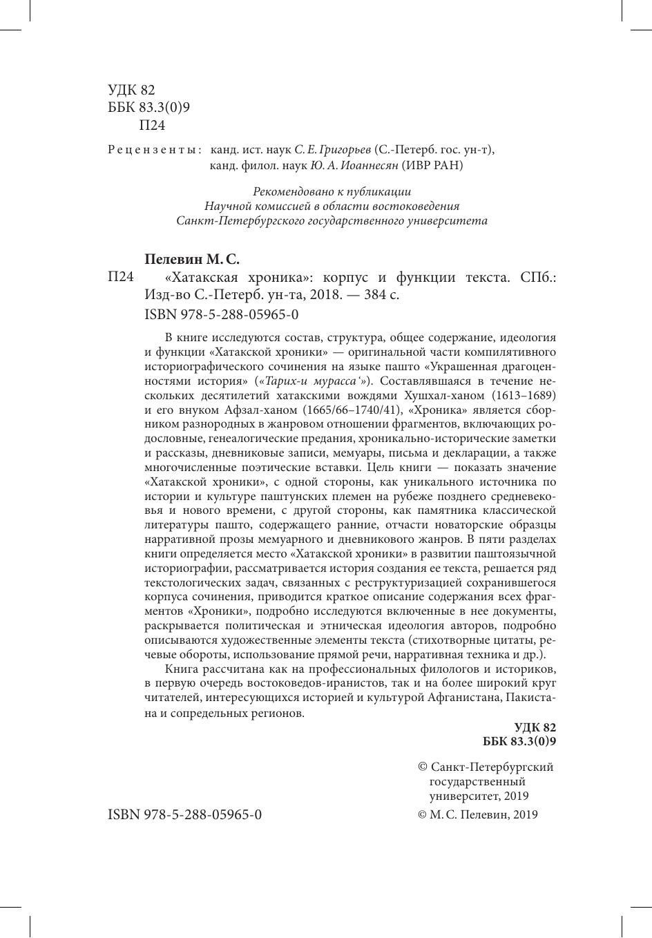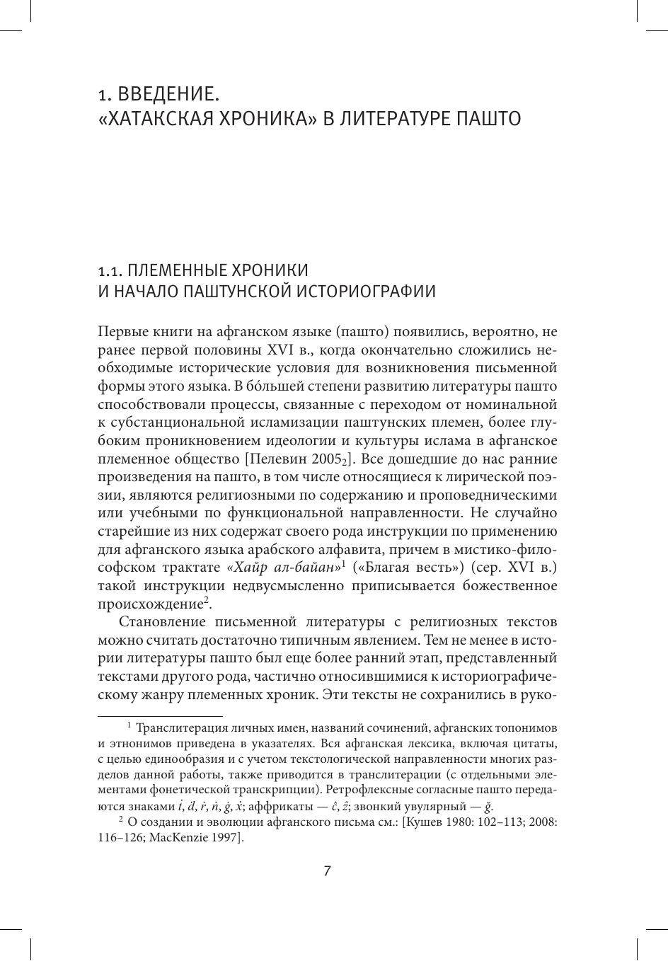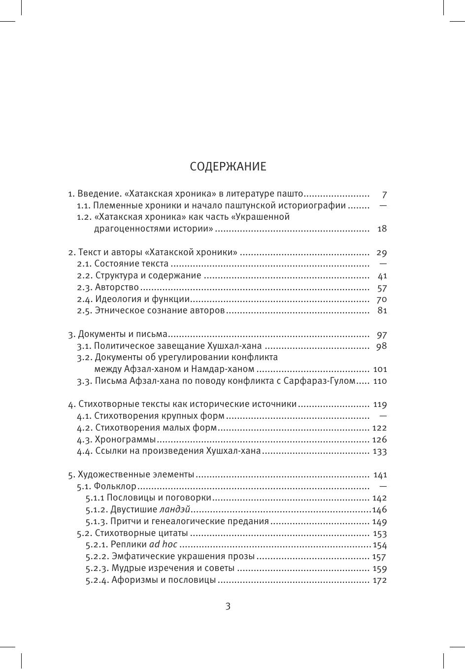 В книге исследуется состав, структура, общее содержание, идеология и функции "Хатакской хроники" - оригинальной части компилятивного историографического сочинения на языке пашто "Украшенная драгоценностями история". Составляющаяся в течение нескольких десятилетий хатакскими вождями Хушхал-ханом (1613-1689) и его внуком Афзал-ханом (1665/66 - 1740/41), "Хроника" является сборником разнородных в жанровом отношении фрагментов, включающих родословные, генеалогические предания, хроникально- исторические заметки и рассказы, дневниковые записи, мемуары, письма и декларации, а также многочисленные поэтические вставки. Цель книги - показать значение "Хатакской хроники", с одной стороны, как уникального источника по истории и культуре паштунских племен на рубеже позднего средневековья и нового времени, с другой стороны, как памятника классической литературы пашто, содержащего ранние, отчасти новаторские образцы нарративной прозы мемуарного и дневникового жанров. В пяти разделах книги определяется место "Хатакской хроники" в развитии паштоязычной историографии, рассматривается история создания ее текста, решается ряд текстологических задач, связанных с реструктуризацией сохранившегося корпуса сочинения, приводится краткое описание содержания всех фрагментов "Хроники", подробно исследуются включенные в нее документы, раскрывается политическая и этническая идеология авторов, подробно описываются художественные элементы текста.
