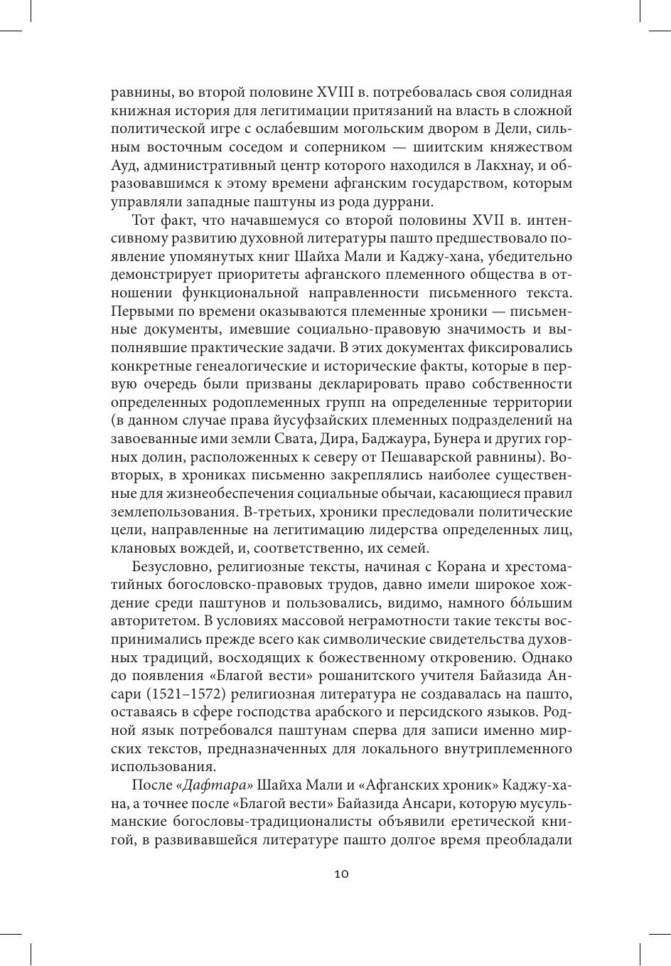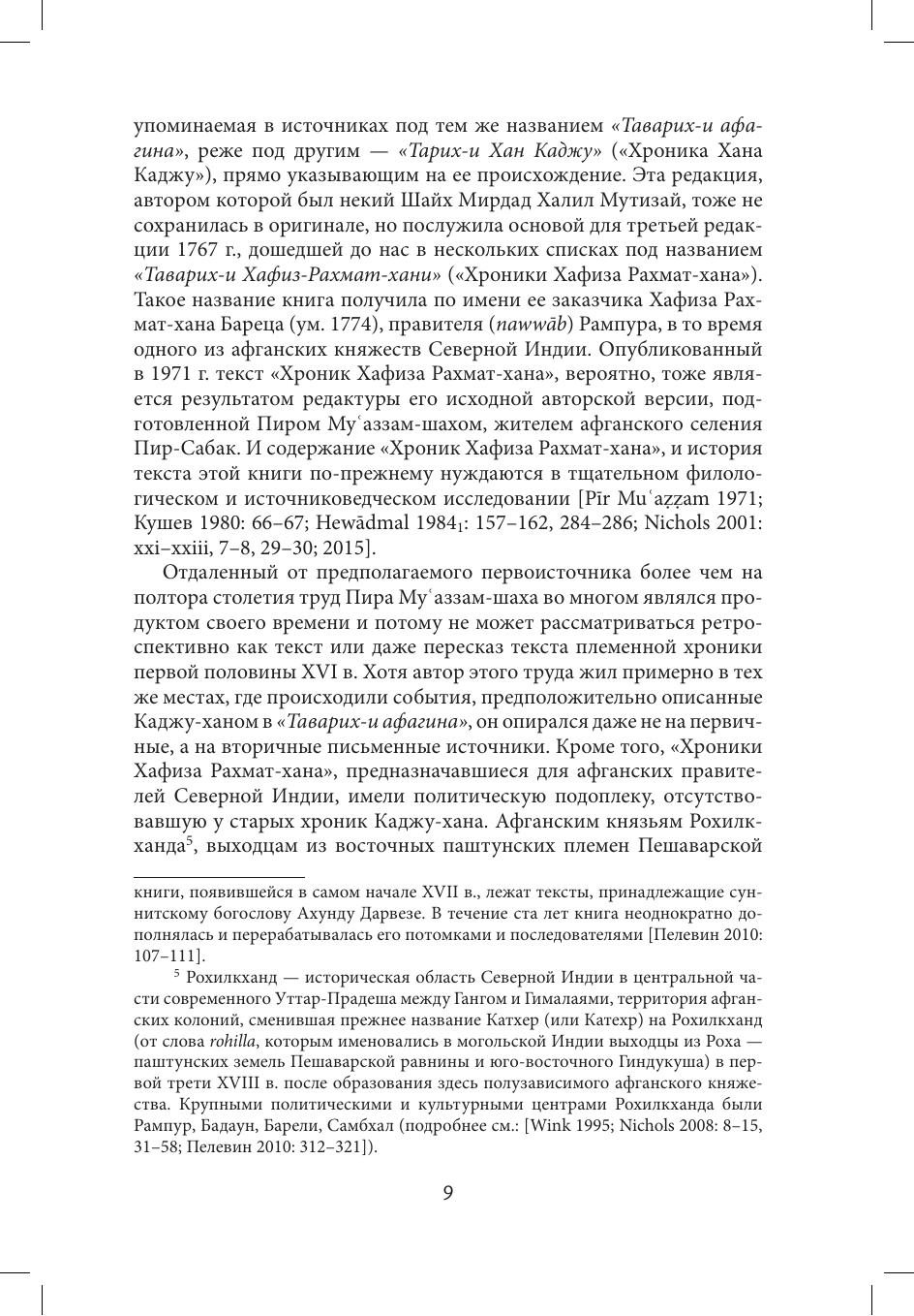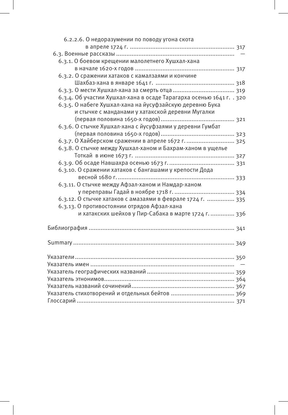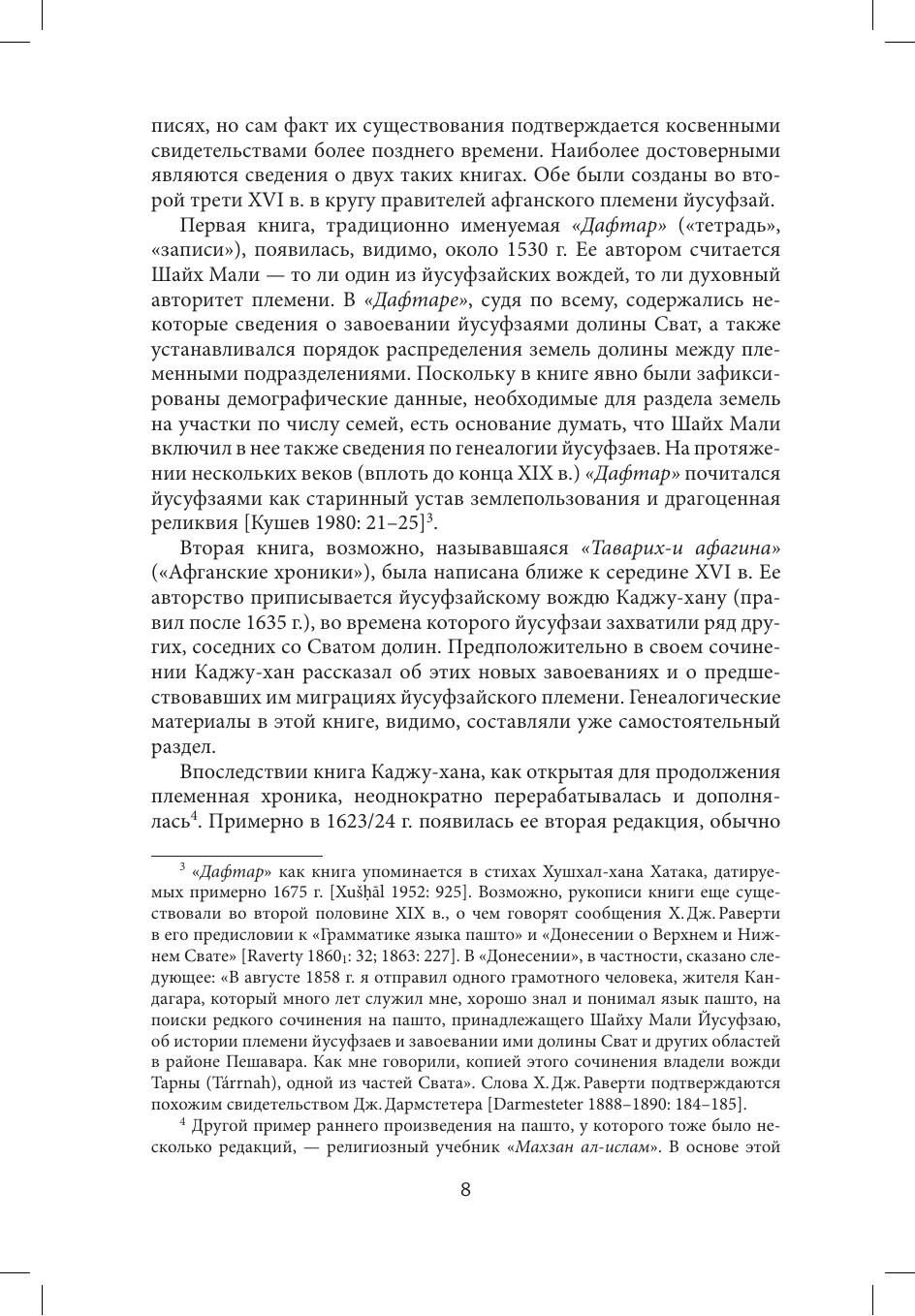 В книге исследуется состав, структура, общее содержание, идеология и функции "Хатакской хроники" - оригинальной части компилятивного историографического сочинения на языке пашто "Украшенная драгоценностями история". Составляющаяся в течение нескольких десятилетий хатакскими вождями Хушхал-ханом (1613-1689) и его внуком Афзал-ханом (1665/66 - 1740/41), "Хроника" является сборником разнородных в жанровом отношении фрагментов, включающих родословные, генеалогические предания, хроникально- исторические заметки и рассказы, дневниковые записи, мемуары, письма и декларации, а также многочисленные поэтические вставки. Цель книги - показать значение "Хатакской хроники", с одной стороны, как уникального источника по истории и культуре паштунских племен на рубеже позднего средневековья и нового времени, с другой стороны, как памятника классической литературы пашто, содержащего ранние, отчасти новаторские образцы нарративной прозы мемуарного и дневникового жанров. В пяти разделах книги определяется место "Хатакской хроники" в развитии паштоязычной историографии, рассматривается история создания ее текста, решается ряд текстологических задач, связанных с реструктуризацией сохранившегося корпуса сочинения, приводится краткое описание содержания всех фрагментов "Хроники", подробно исследуются включенные в нее документы, раскрывается политическая и этническая идеология авторов, подробно описываются художественные элементы текста.